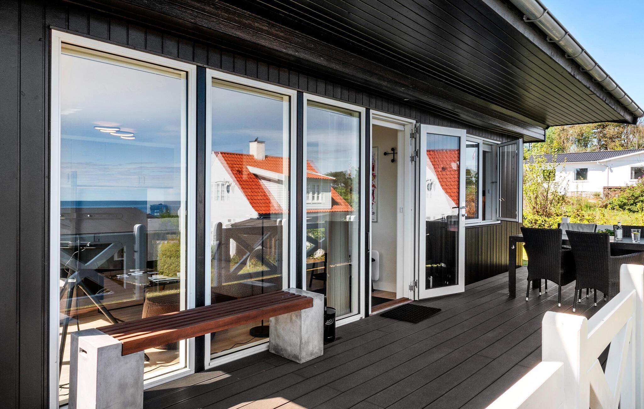 En dejlig terrasse strækker sig rundt om huset, så I kan nyde solen hele dagen lang. Læn jer tilbage og lad blikket vandre over havet. Brug siddepladserne til et hyggeligt måltid udendørs eller tilbered noget lækkert på grillen. Der hersker en skøn ro i den velholdte have.