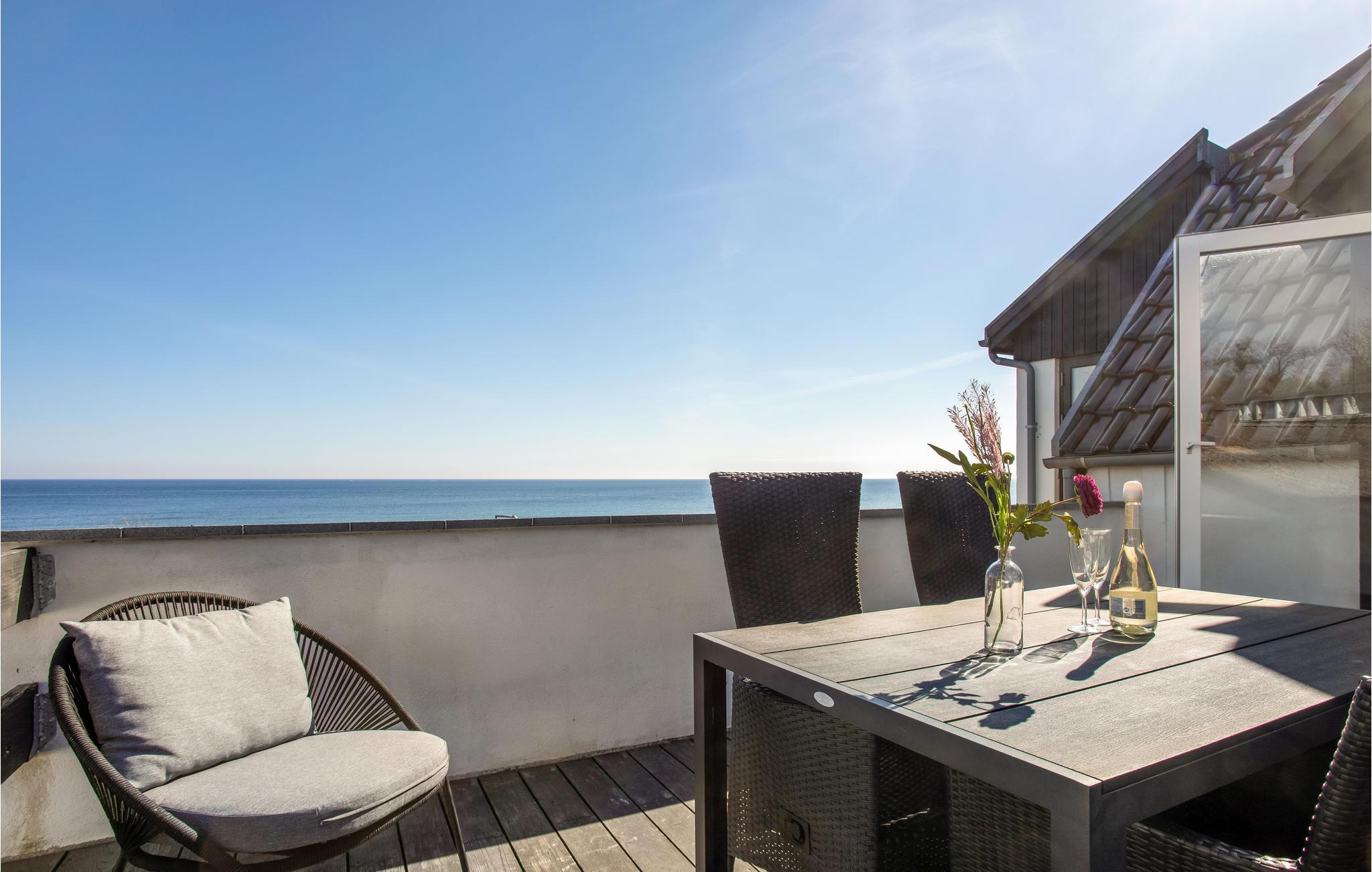 Moderne ferielejlighed med havudsigt og terrasse nær sandstrand i Sandkås, Bornholm.