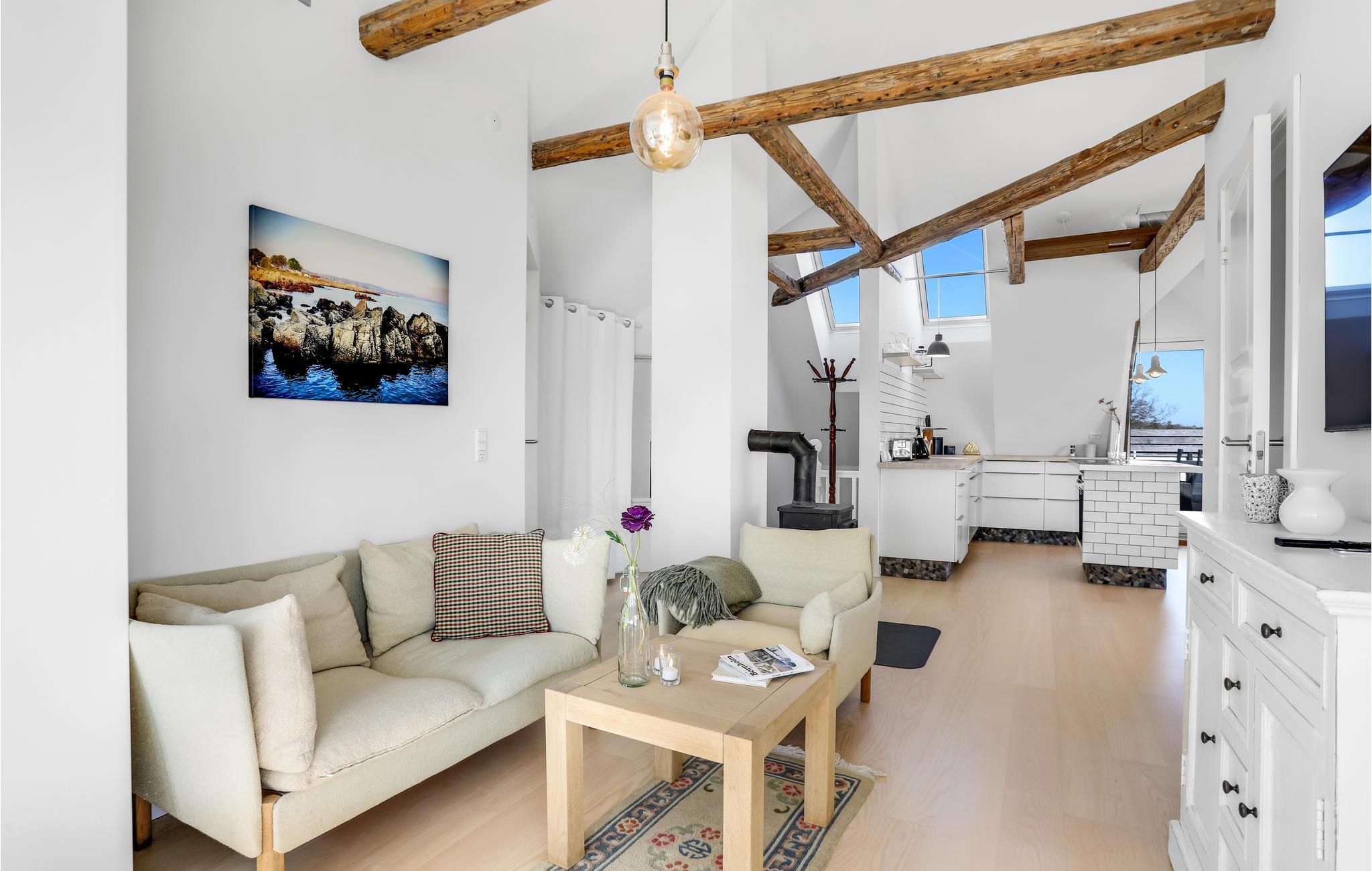 Lejligheden er moderne indrettet og har gulvvarme overalt, hvilket giver et behageligt indeklima. Der er desuden lagt vægt på smart design og charmende finesser som bjælkerne under loftet, store lysindfald og pæne klinkegulve. Som familie eller to par kan I se frem til et integreret opholdsrum med køkken og spisestue samt to adskilte soveværelser.