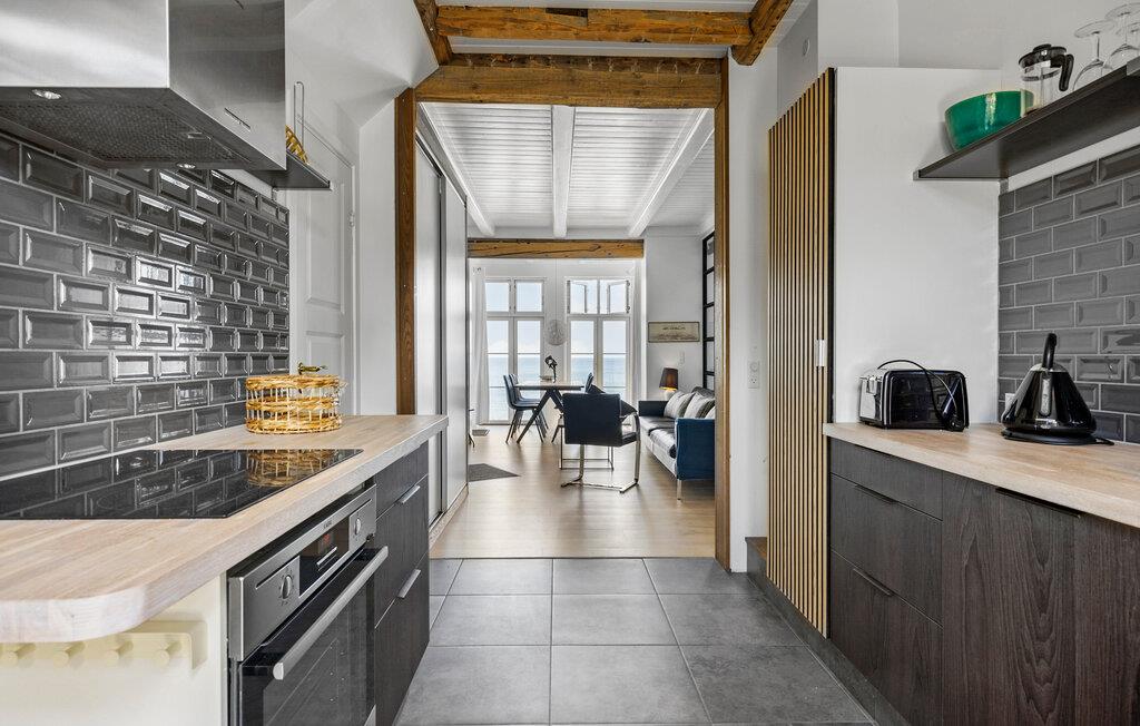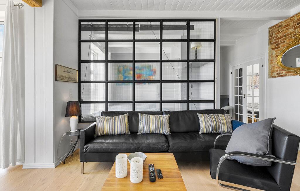 Lejligheden er moderne indrettet og har gulvvarme overalt, hvilket giver et behageligt indeklima. Der er desuden lagt vægt på smart design og charmende finesser som bjælkerne under loftet, store lysindfald og pæne klinkegulve. Som familie eller to par kan I se frem til et integreret opholdsrum med køkken og spisestue samt to soveværelser.