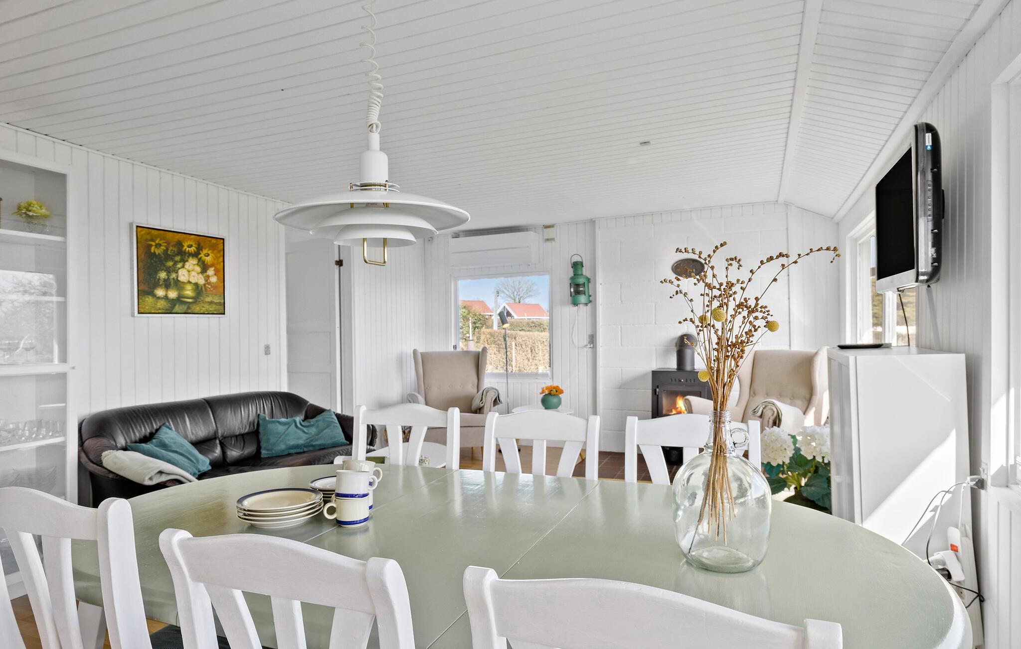 Huset er godt indrettet med brændeovn i opholdsstuen, køkken og tre gode soveværelser. Der er også en hyggelig udestue til kølige dage.