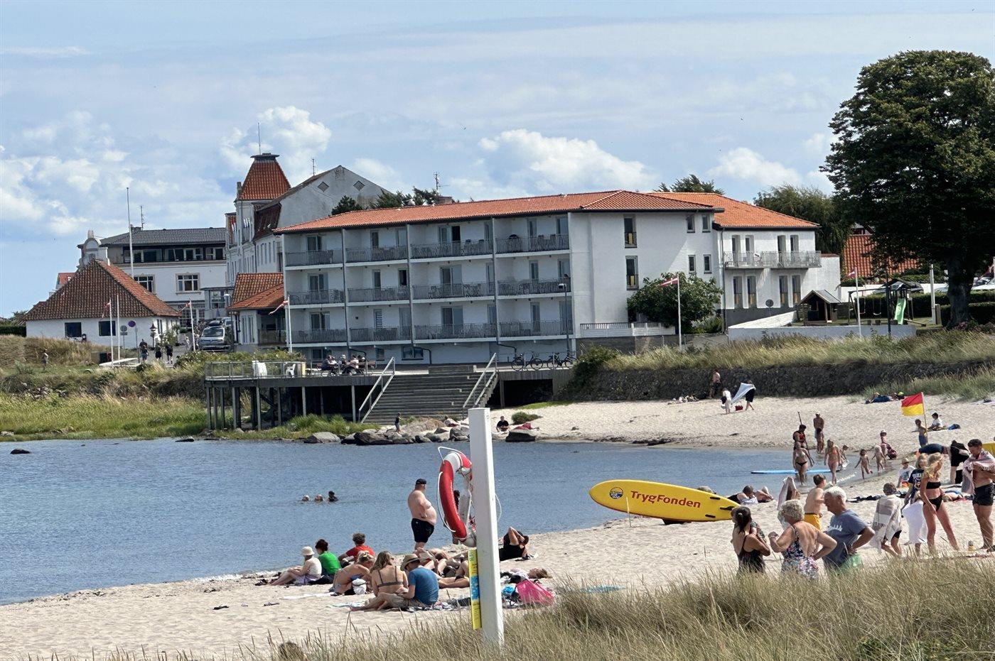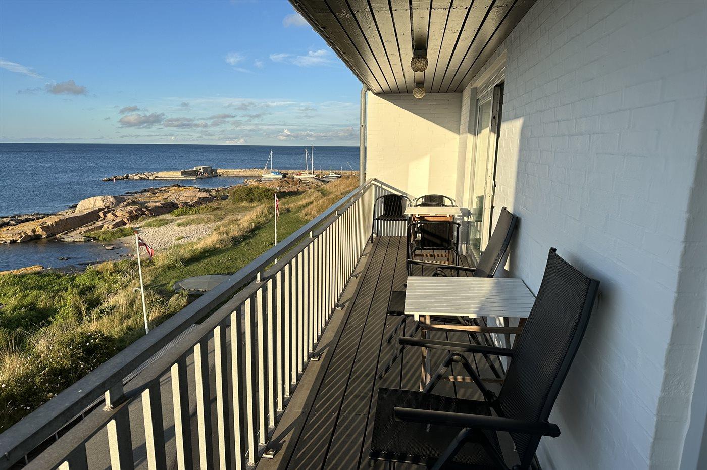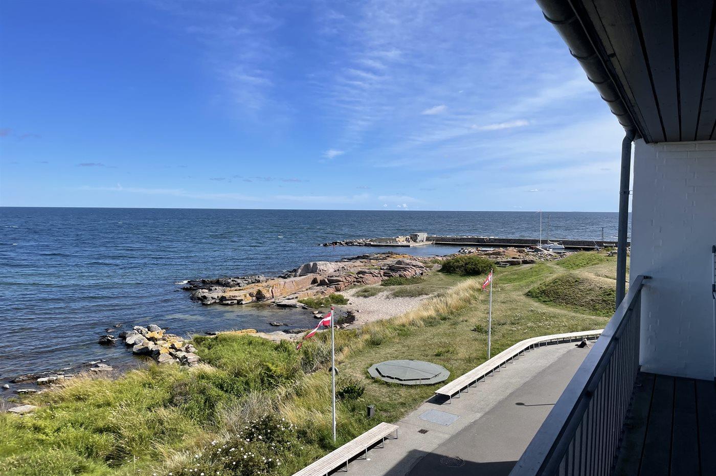 I 1. række ud til klipper, sandstrand og imponerende natur med Hammerknudens stejle skråning ligger denne dejlige ferielejlighed med havudsigt. Lejligheden fremstår lys og moderne og er indrettet i et tidligere hotel beliggende på strandpromenaden – kun et stenkast fra kysten ved Sandvig, hvor der er gode bademuligheder, supermarked og restauranter. Folkemødebyen Allinge ligger i cykelafstand. Til feriekomplekset hører en fælles gårdhave med bord-bænkesæt.