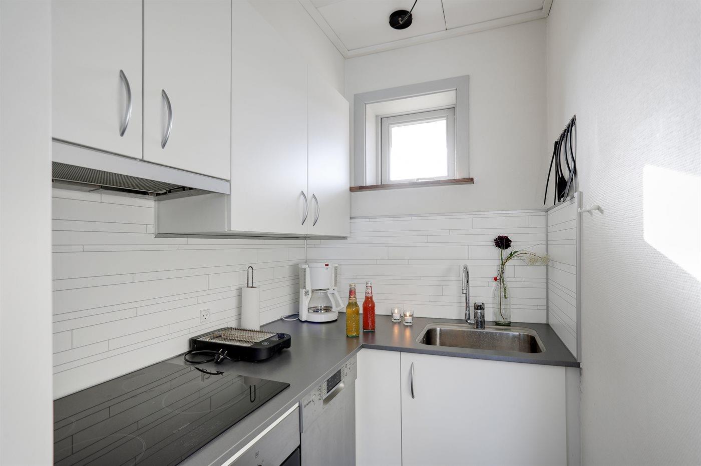 Køkkenet er udstyret med 1 køleskab. Der er 4 induktionskogeplader, varmluftovn, mikrobølgeovn samt opvaskemaskine.