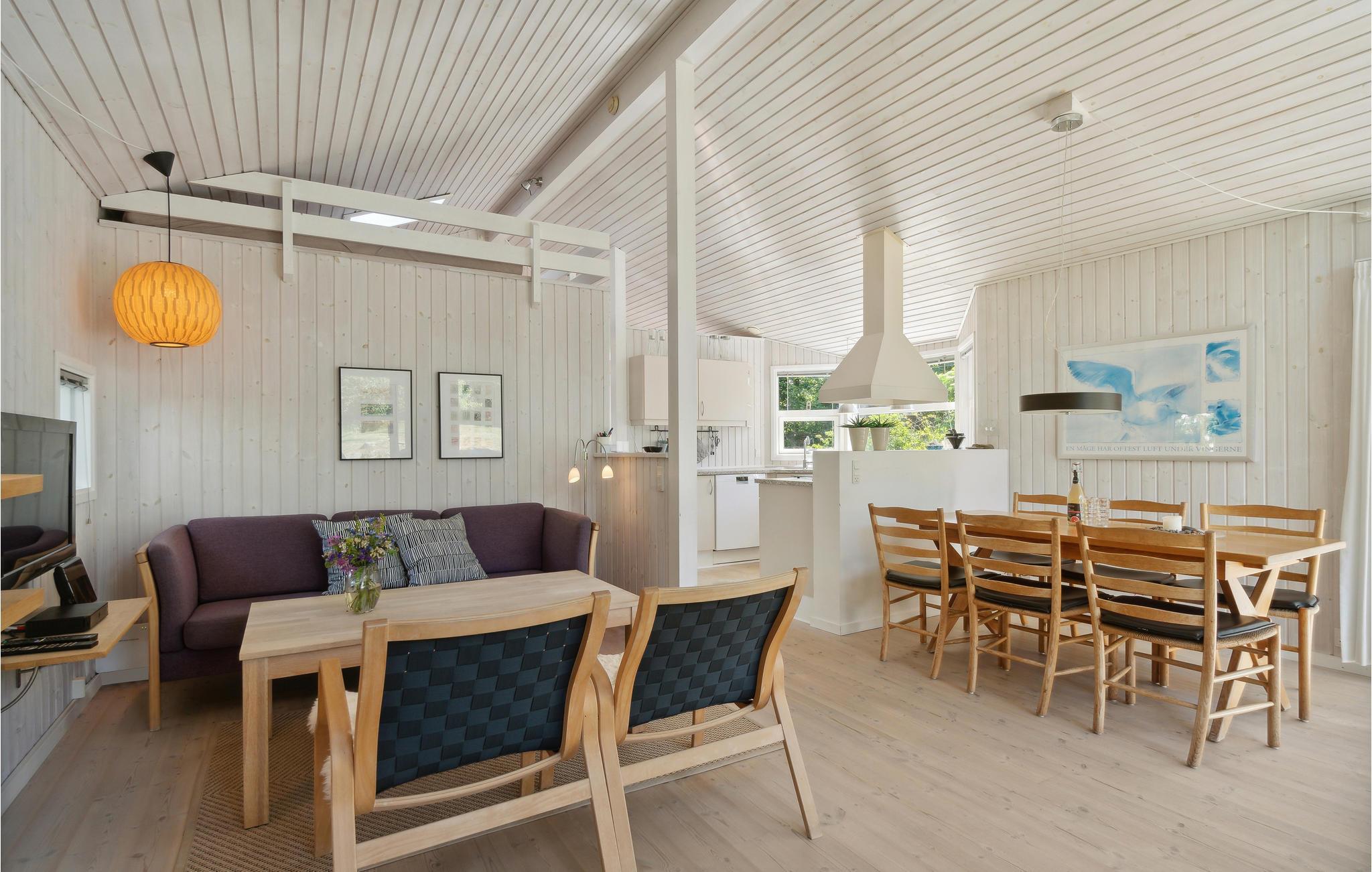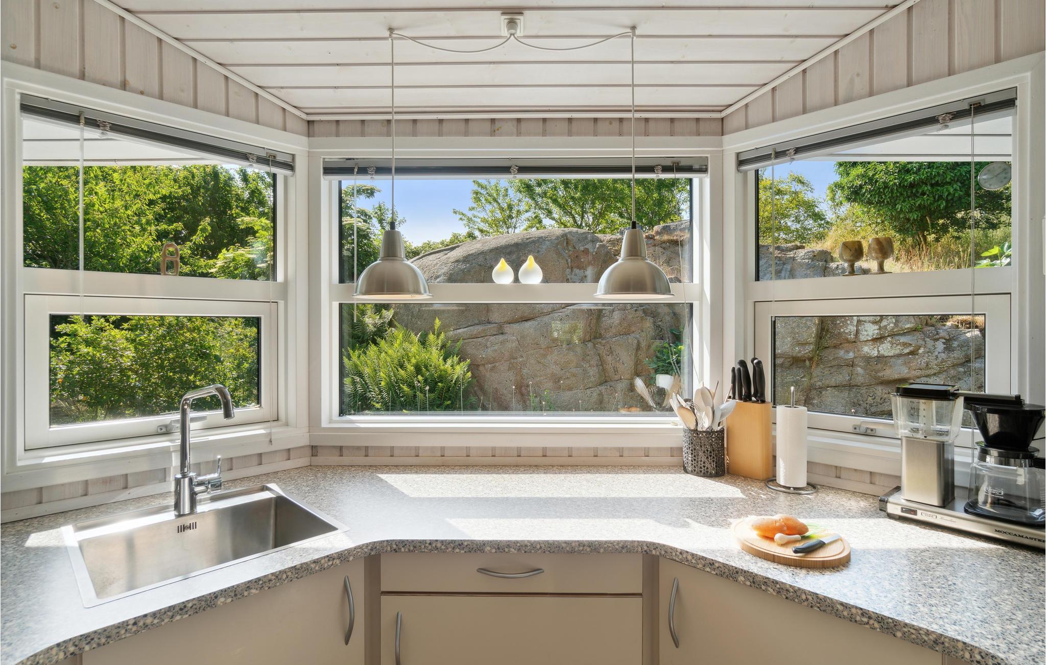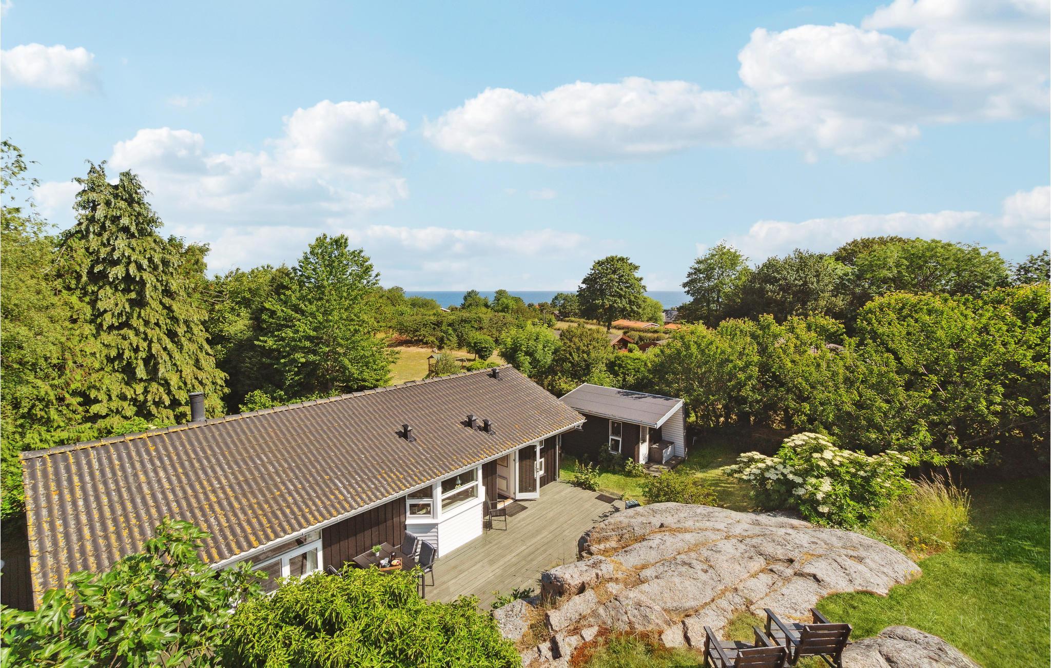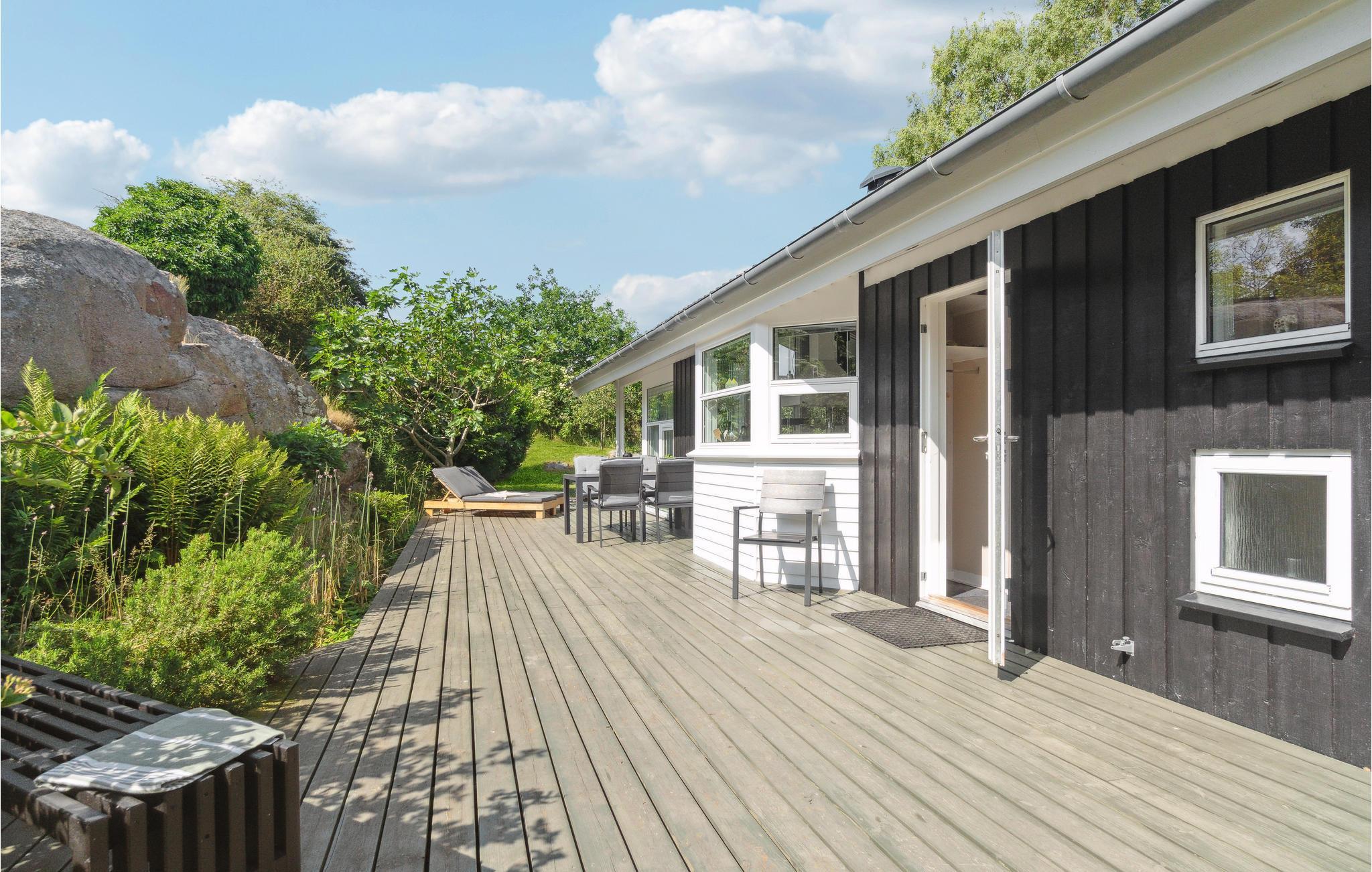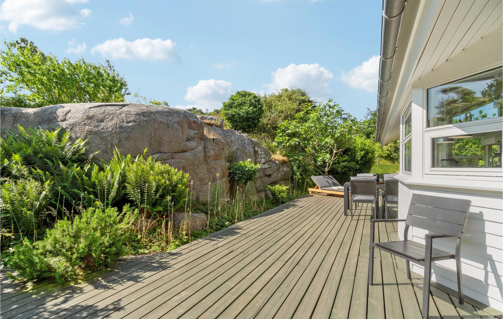 Lækkert feriehus af træ! Det ligger i attraktive omgivelser på en god naturgrund med en charmerende klippe på grunden og i nærheden af Nordbornholms flotte klippekyst og gode badestrand. Huset er lyst og moderne indrettet med et dejligt åbent køkken, en skøn kombineret spise- og opholdsstue med brændeovn og komfortable møbler. Fra stuen er der opgang til en hems, som især er velegnet som legehjørne for børn. Den store træterrasse er perfekt til de mange afslappende feriestunder og dette luksusferiehus er med sin høje kvalitet meget velegnet som udgangspunkt for ferieophold uanset årstid.