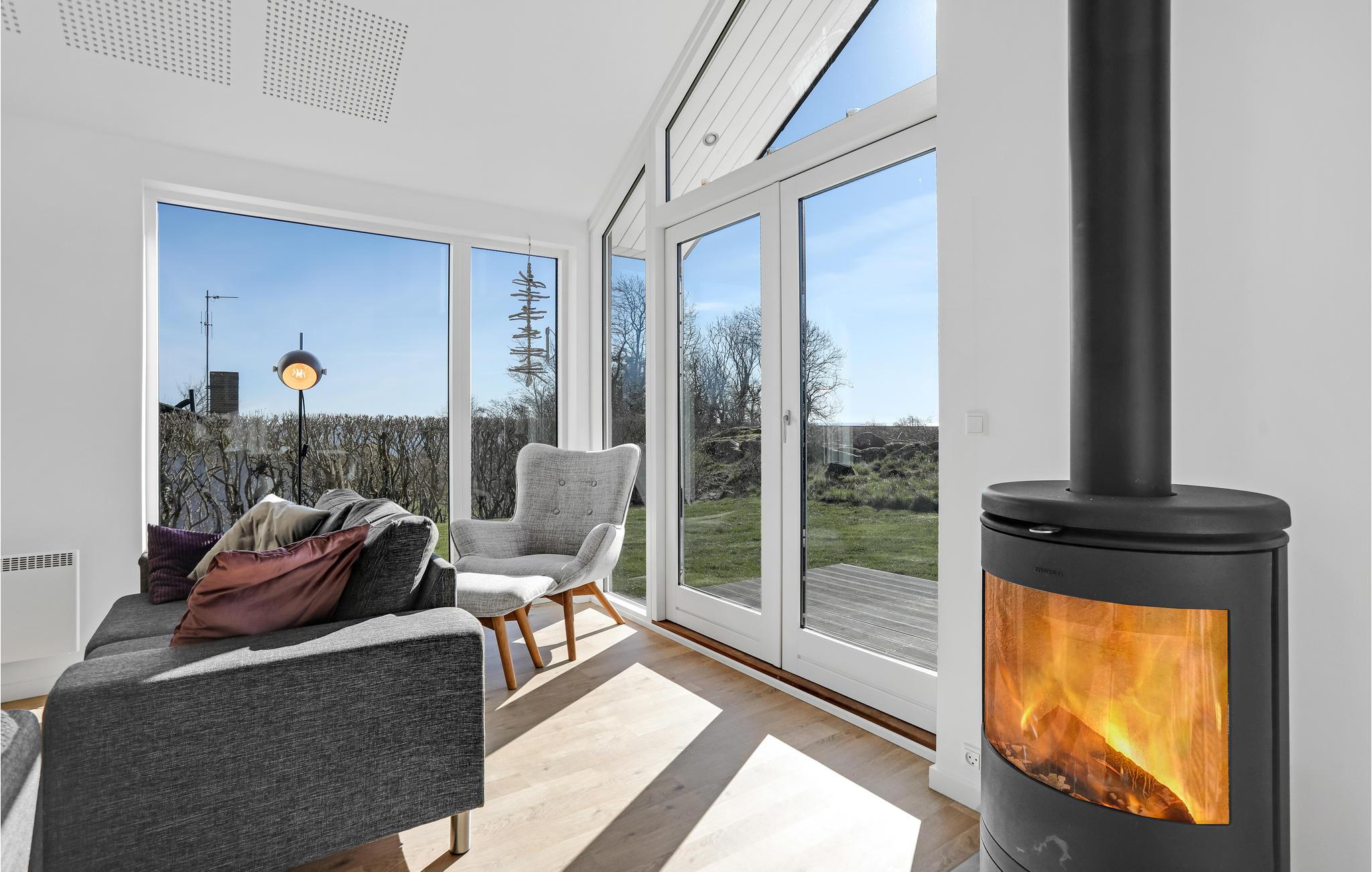 Huset er lyst og moderne indrettet. Åbent til kip skaber en rummelig og meget hyggelig atmosfære. Den dejlige opholdsstue er udstyret med komfortable møbler at flade ud i, en brændeovn til de køligere sæsoner, og fjernsyn med Apple TV til underholdning om aftenen og på regnfulde dage. Store glaspartier lukker meget lys ind og giver et dejligt udsyn til hav og grønne omgivelser. I det åbne og veludstyrede køkken er det nemt at tilberede lækre måltider. Der er gulvvarme på husets badedværelse.