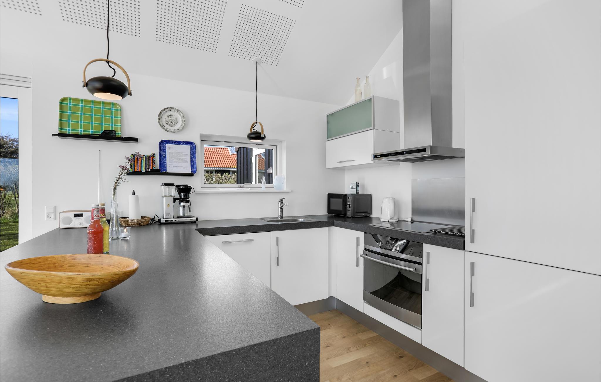 Arkitekttegnet feriehus med havudsigt, som ligger på toppen af charmerende Sandvig og kun 10 meter fra en cykelvej og gangsti, der fører direkte ned i Allinge-Sandvig-området.