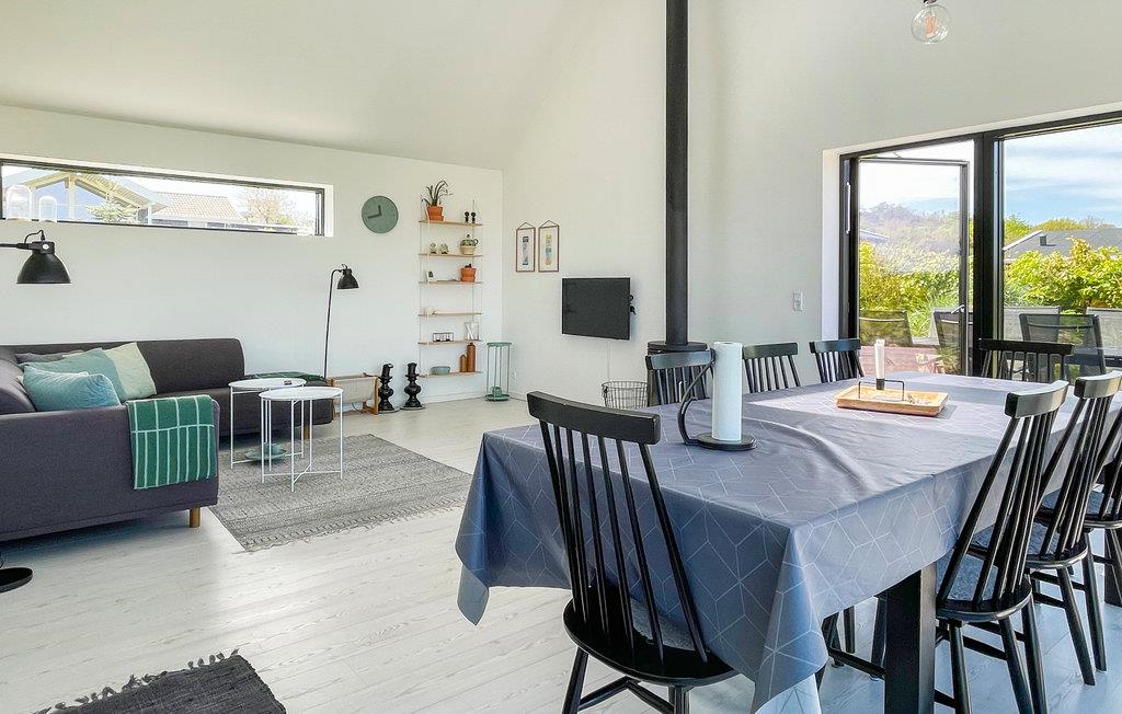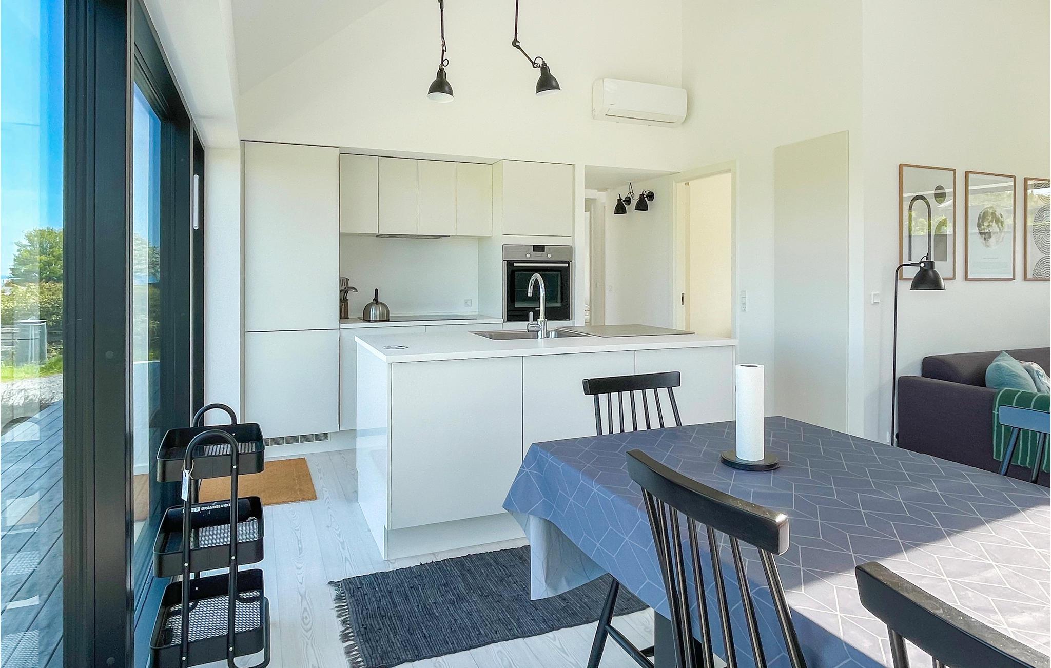 Huset er lyst og moderne indrettet. Hjerten er den store og meget lyse opholds- og spisestue med et dejligt, veludstyret køkken. Store vinduer lukker meget lys ind og lader jer kigge til vandet. Her kan I slænge jer i komfortable møbler, se fjernsyn (I kan streame via Chromecast) og i kølige sæsoner nyde varmen og den hyggelige atmosfære fra brændeovnen. Der er behagelig gulvvarme på begge husets fine badeværelser. I finder en vaskemaskine og tørretumbler i entreen.