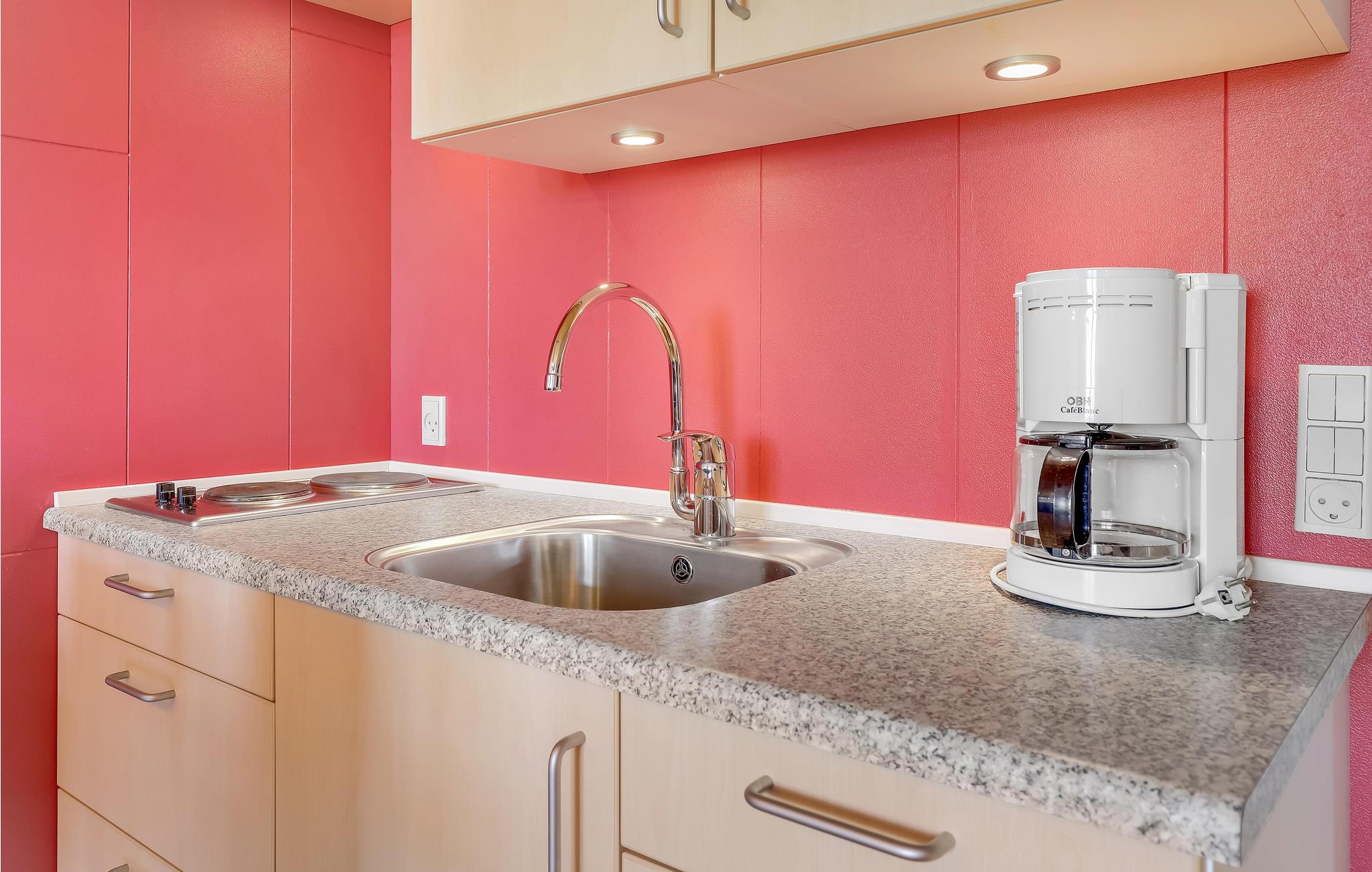 I kommer til at bo i en hyggelig, aflang etværelseslejlighed, som er lyst og moderne indrettet. Rummet er fint inddelt i små sektioner, så I har dobbeltsengen i den ene ende, mens den anden halvdel består af et åbent køkken med en lille spiseplads.