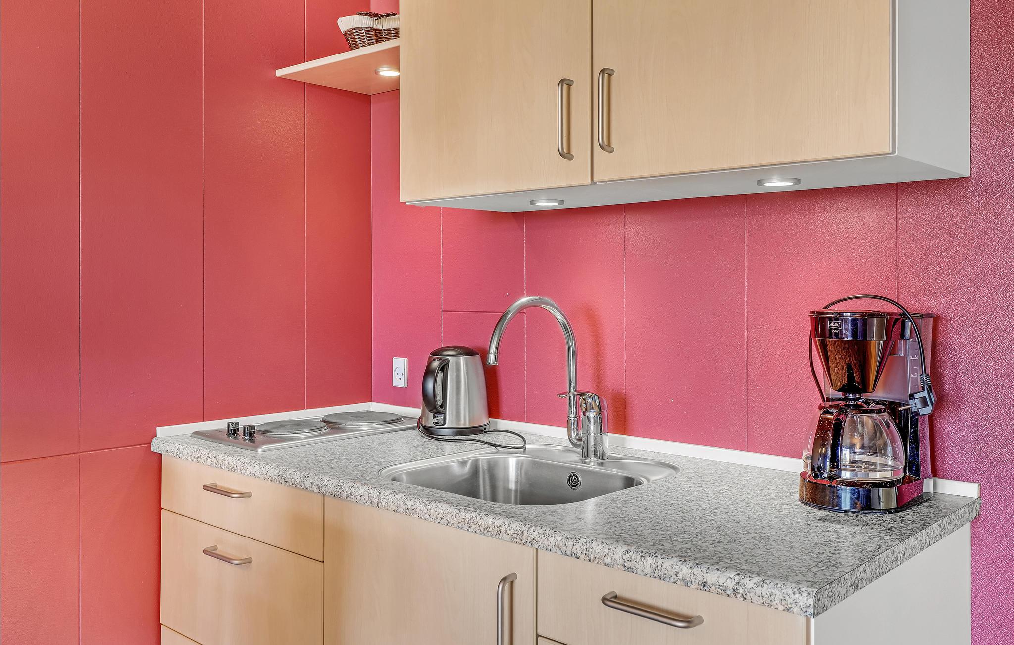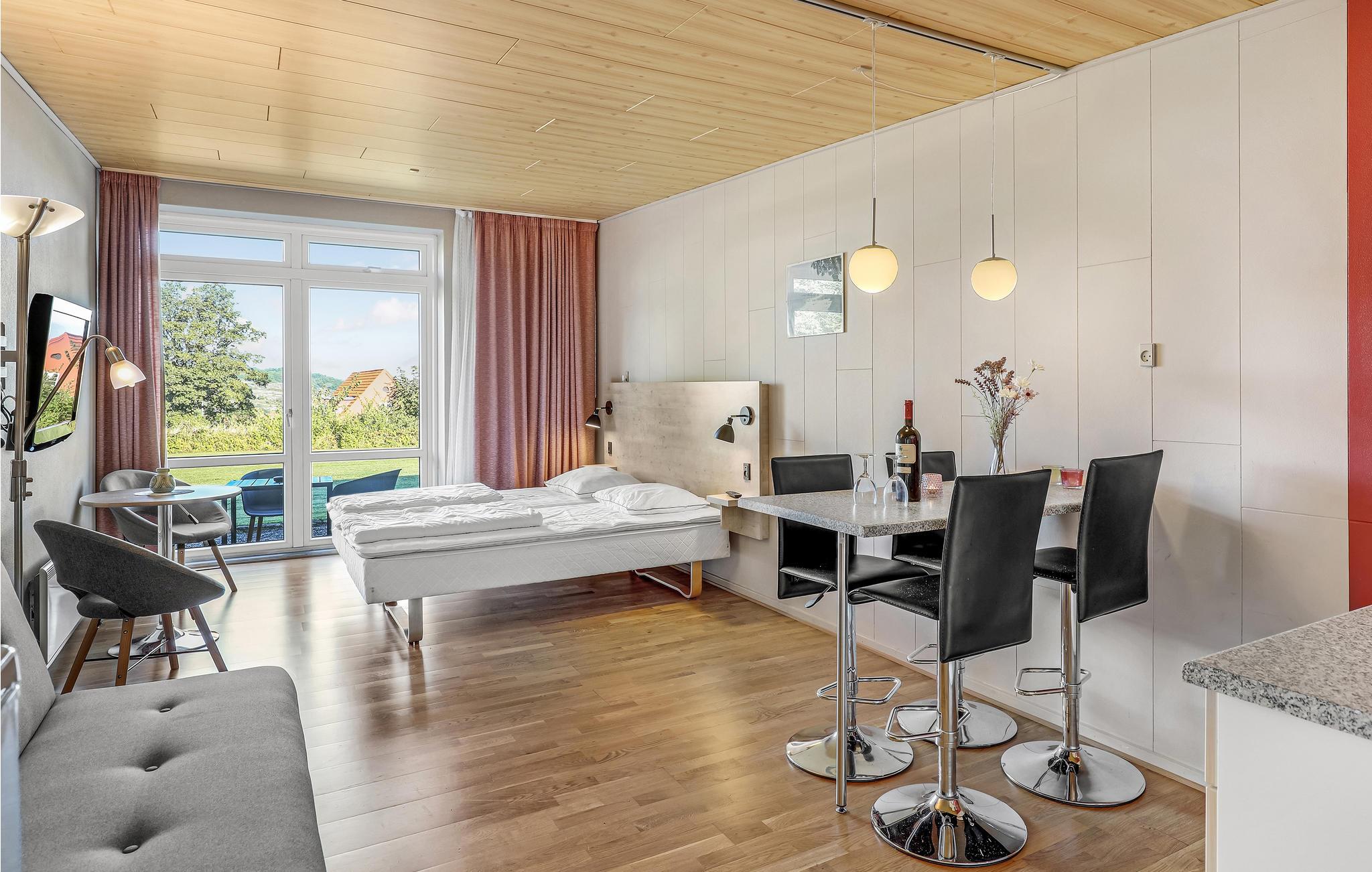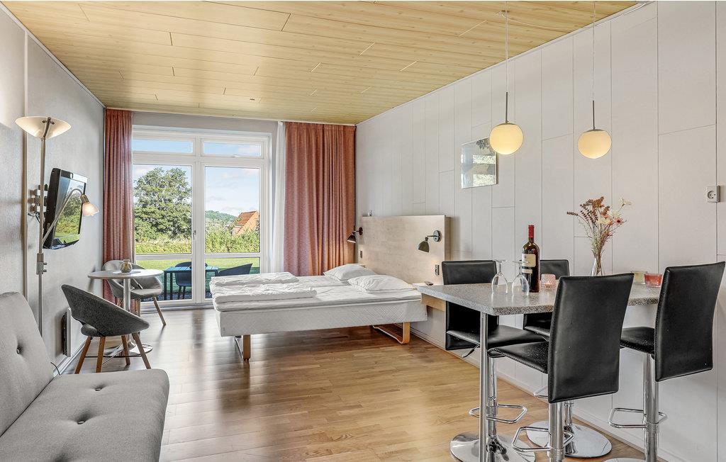 I kommer til at bo i en hyggelig, aflang etværelseslejlighed, som er lyst og moderne indrettet. Rummet er fint inddelt i små sektioner, så I har dobbeltsengen i den ene ende, mens den anden halvdel består af et åbent køkken med en lille spiseplads. Midtfor står der desuden en behagelig sovesofa, så her er plads til tre personer i alt.