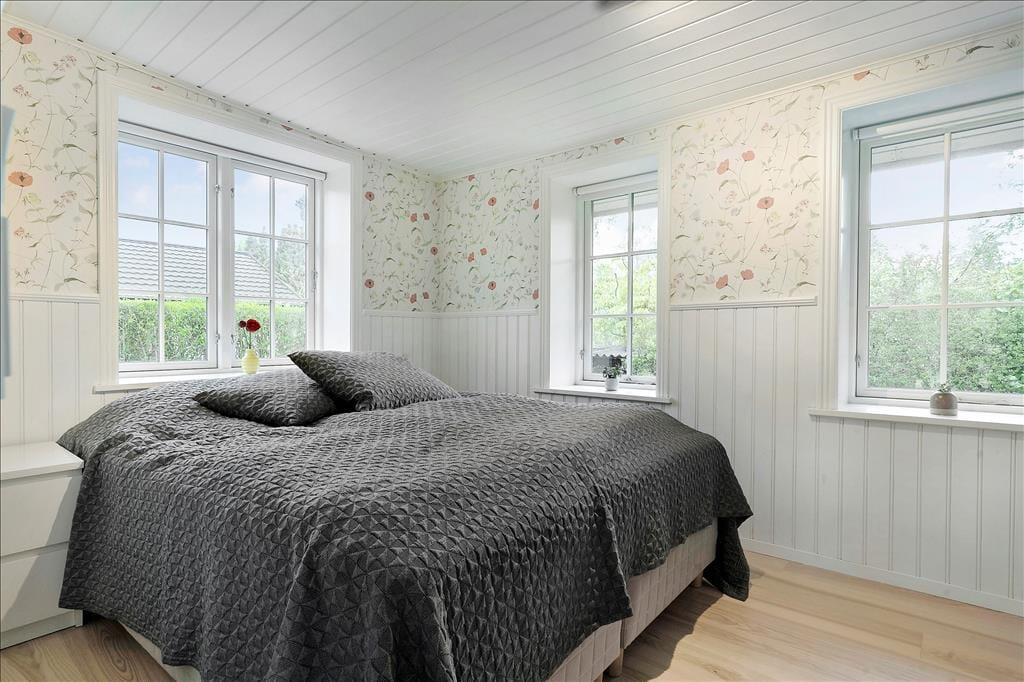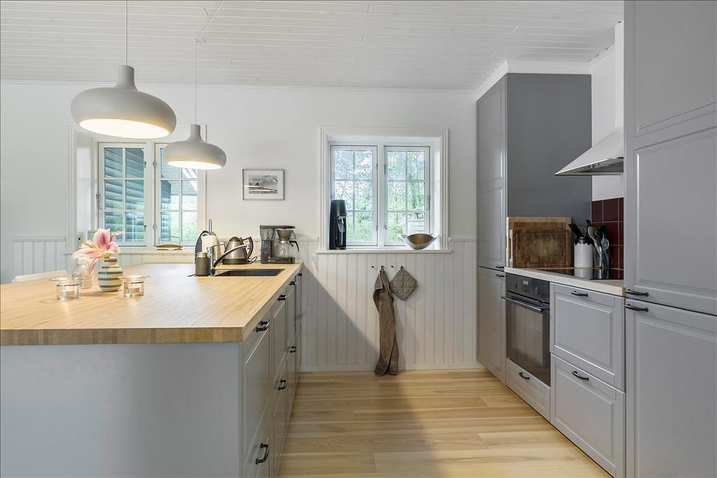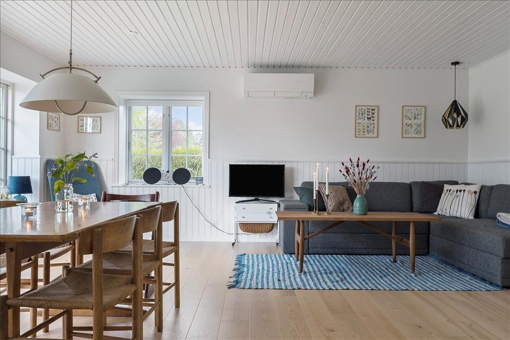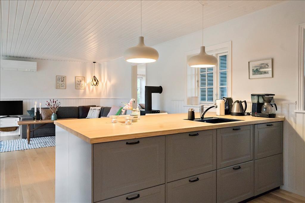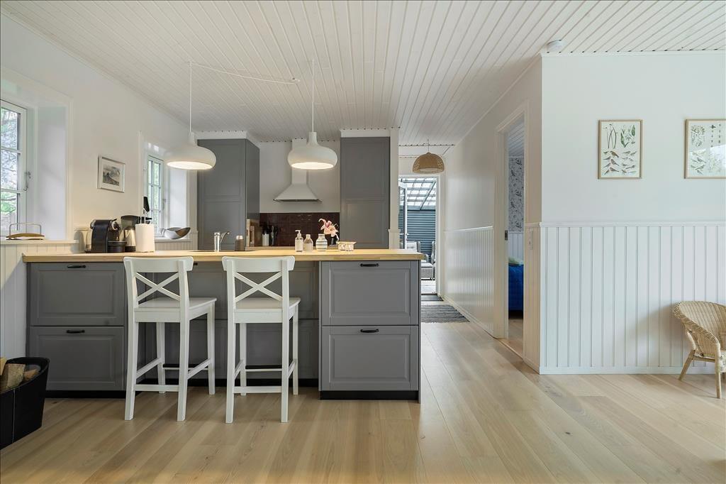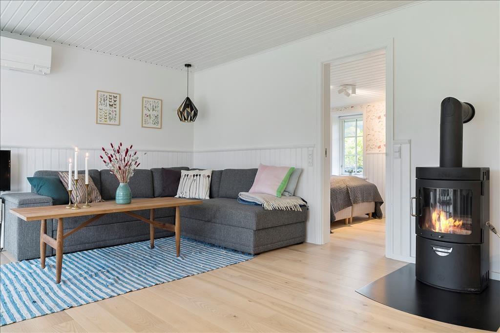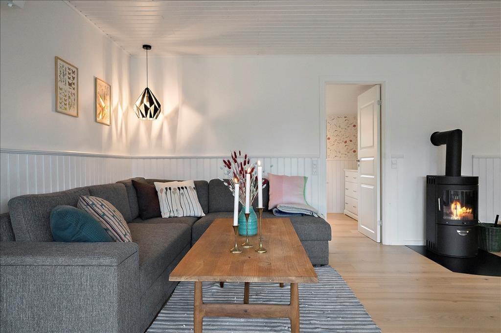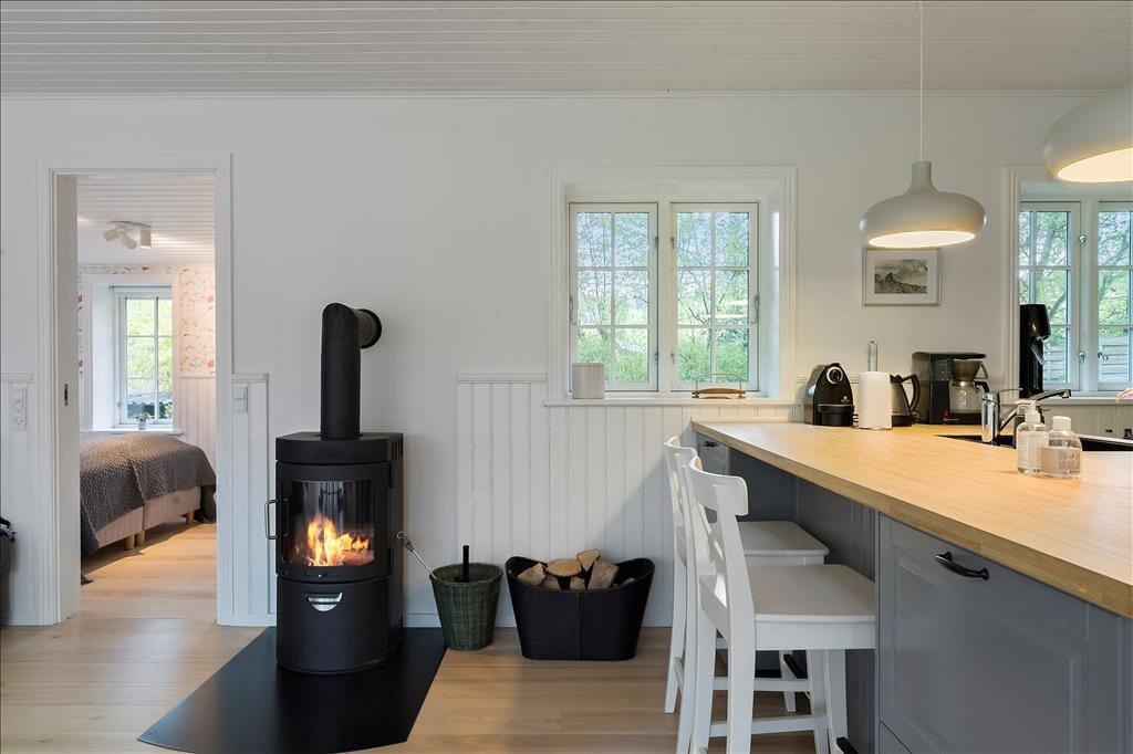 Når du træder ind via den hyggelige overdækkede terrasse, mødes du af en lys og indbydende atmosfære. Entréen leder dig direkte ind i et åbent køkken-alrum, hvor køkkenet smelter sammen med stuen. Her kan du tilberede lækre måltider, mens du stadig er en del af samtalen i stuen. Spisepladsen ved udgangen til terrassen er det perfekte sted at nyde morgenkaffen med udsigt til haven. I stuen inviterer en komfortabel sofagruppe til afslapning foran brændeovnen, der spreder varme og hygge på kølige aftener. Sommerhuset rummer to charmerende soveværelser, begge udstyret med dobbeltsenge, der sikrer en god nats søvn. Badeværelset er funktionelt indrettet med brusekabine og vaskemaskine, hvilket gør det nemt at håndtere hverdagens praktiske gøremål.