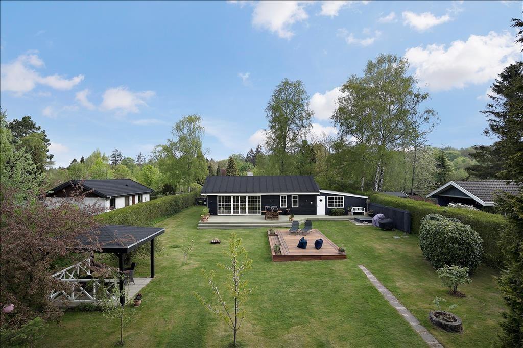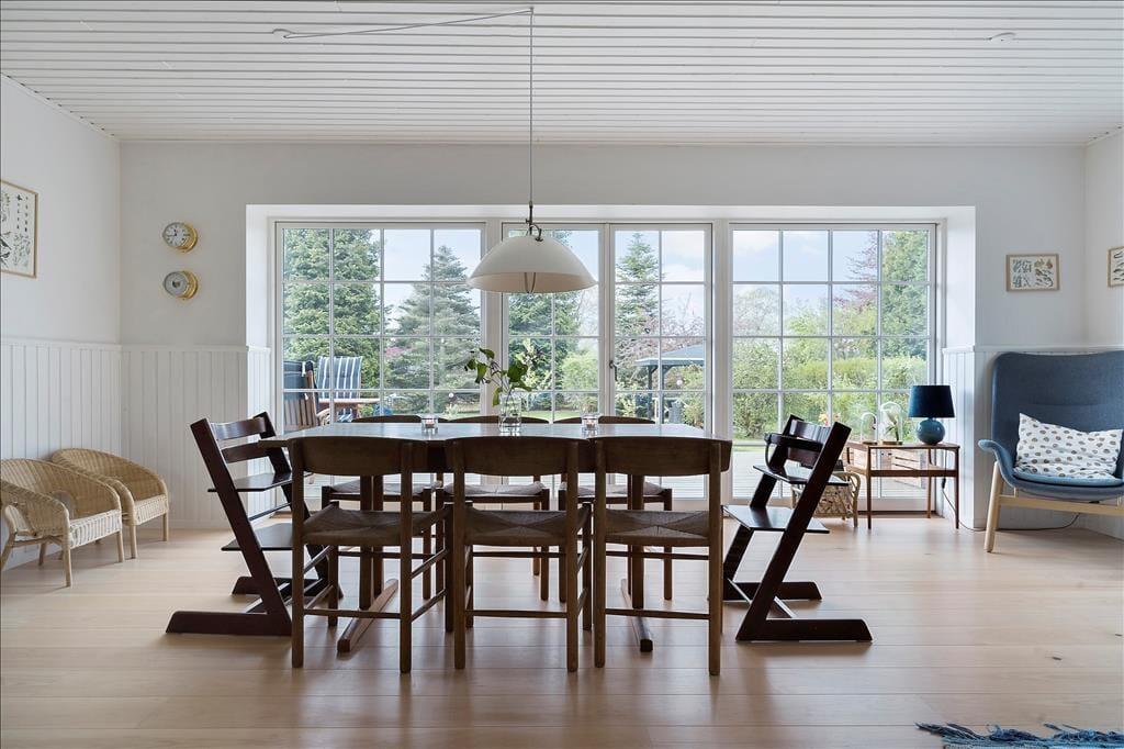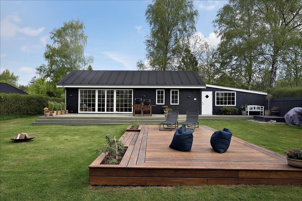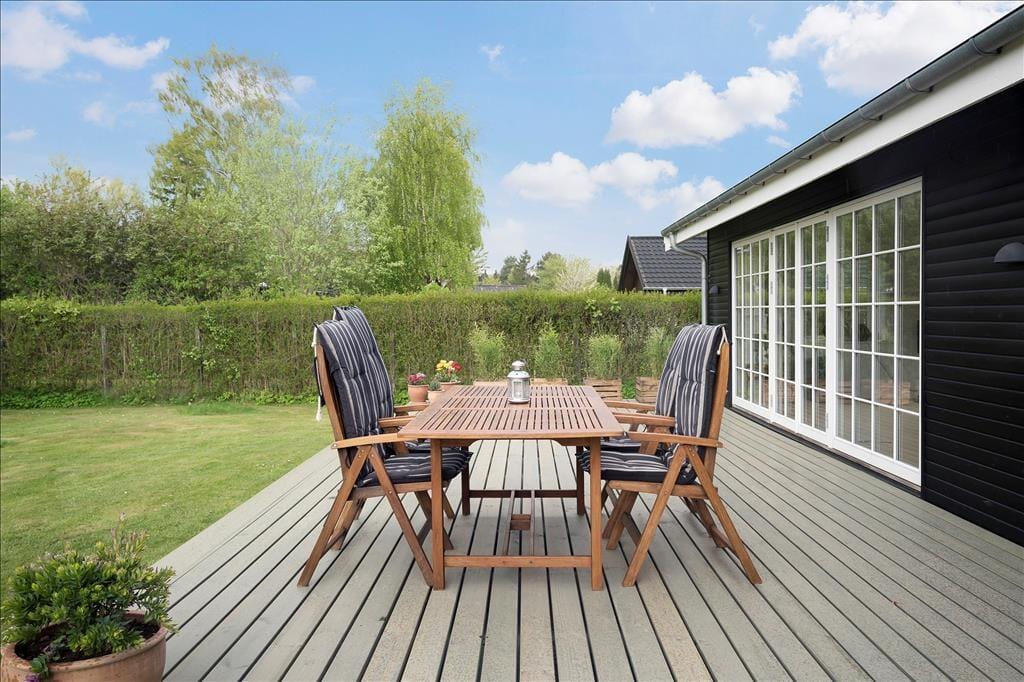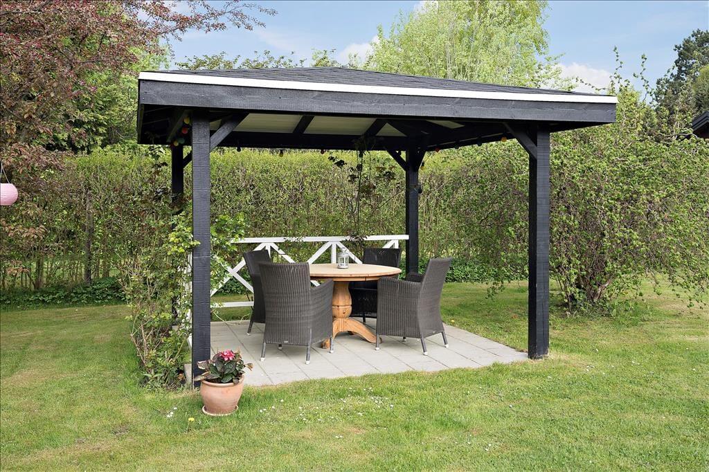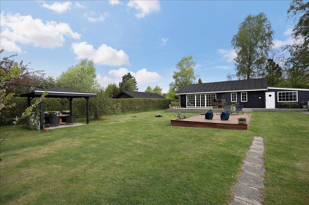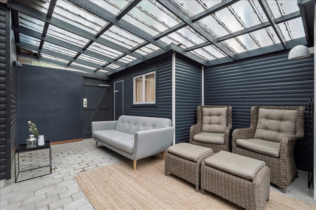 Udenfor venter en stor, ugenert grund omkranset af en tæt hæk, der sikrer privatliv under dit ophold. Den velholdte græsplæne med spredte buske og træer danner en idyllisk ramme om udendørs aktiviteter. Foran huset finder du en solrig terrasse med behagelige siddepladser – ideel til solbadning eller en god bog. Ved indgangen er der en lukket og overdækket terrasse, som er perfekt til de dage, hvor vejret ikke helt arter sig, men du stadig ønsker at være udendørs. I forhaven står en charmerende overdækket havepavillon med en hyggelig siddegruppe, hvor du kan nyde eftermiddagsteen eller et glas vin i skyggen.