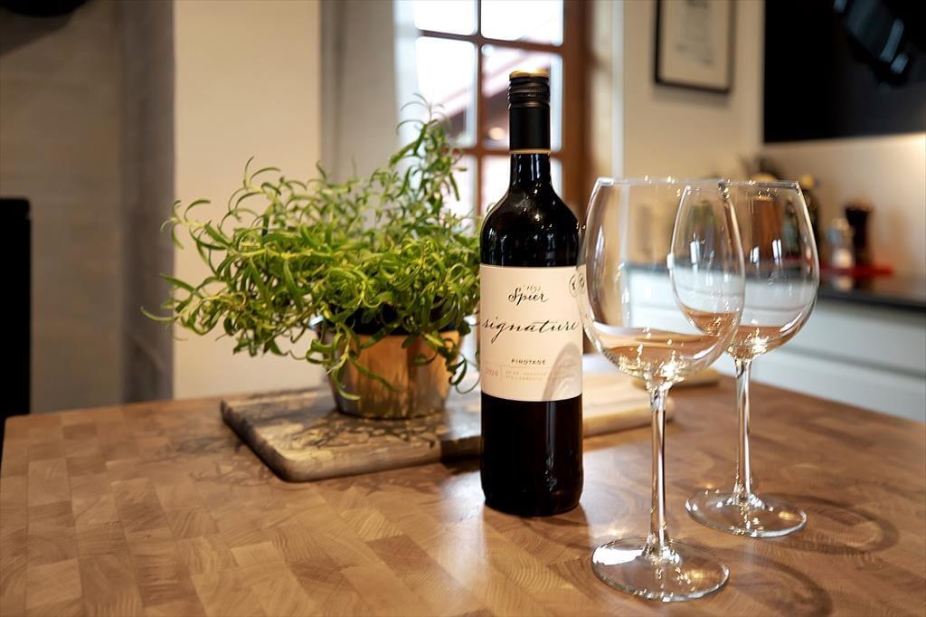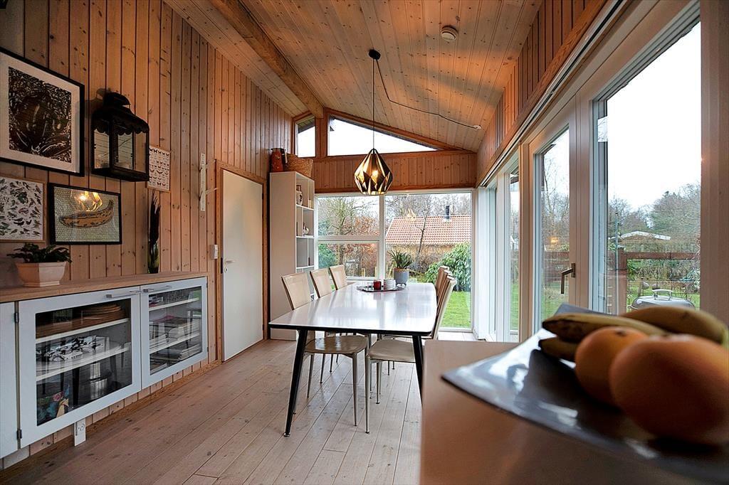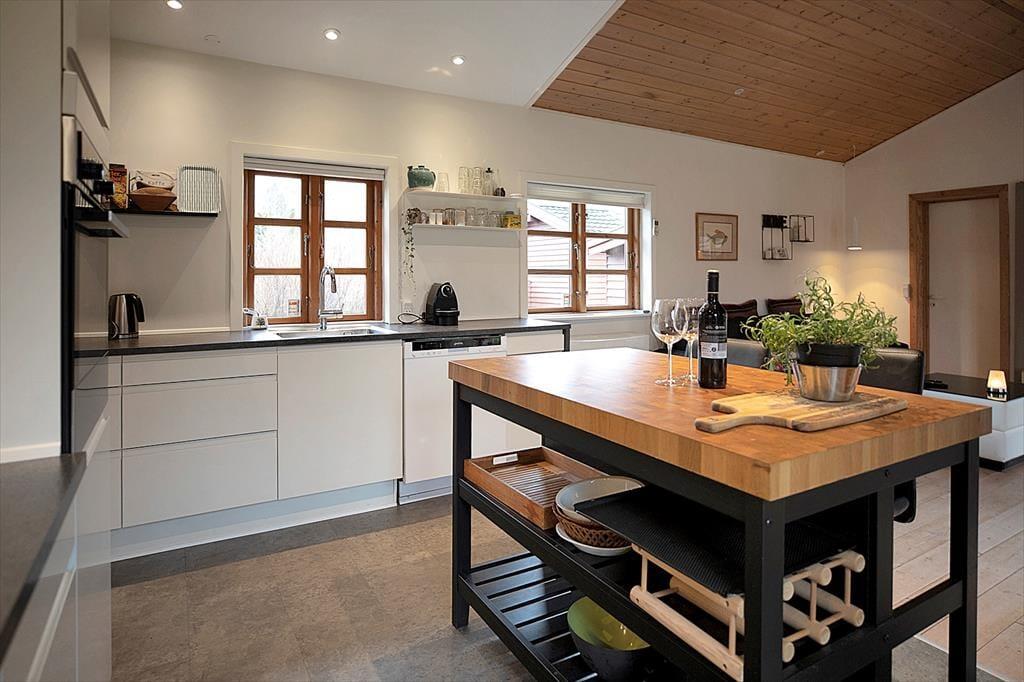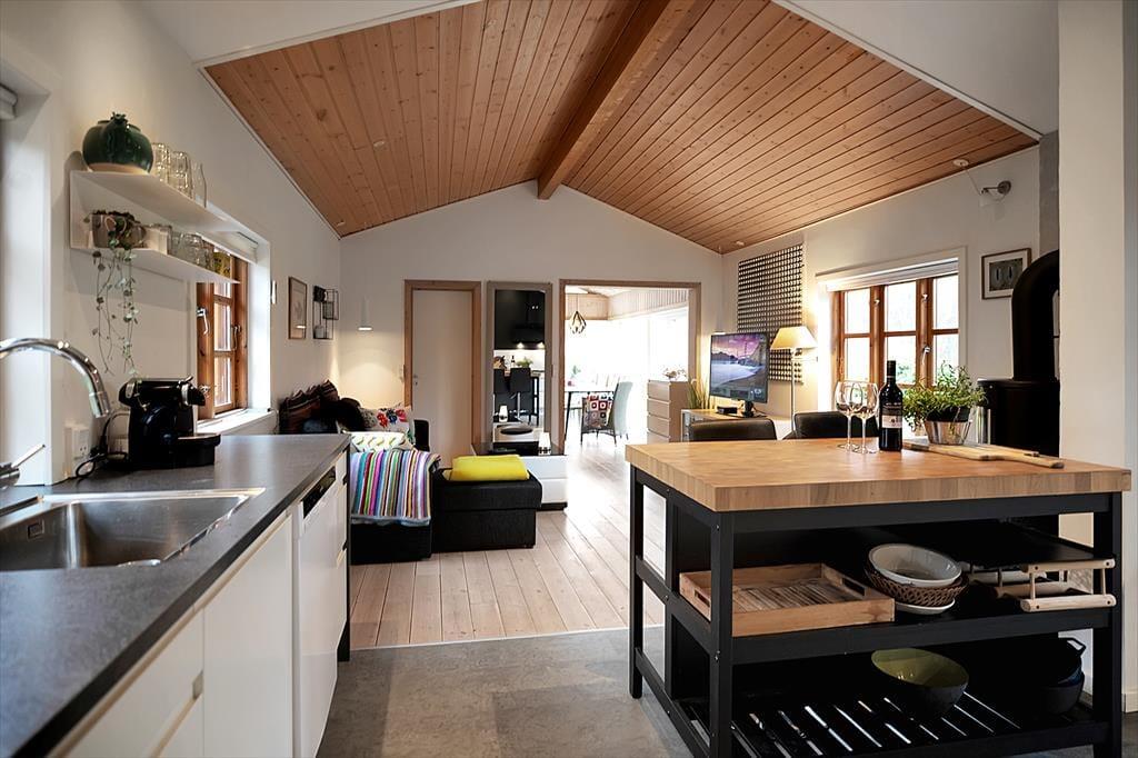 Husets dagligstue ligger midt i huset mellem spisestuen og det åbne køkken, så mens nogle i familien slapper af i sofaen med chaiselong eller dækker bord, kan du tænde indbygningsovnen og gøre klar til aftenens steg. Der er også mulighed for at sætte sig og få en snak ved barstolene ved køkkendisken under forberedelserne. Ved spisebordet kan I kigge ud i haven fra de store vinduespartier og eventuelt åbne døren ud til terrassen.