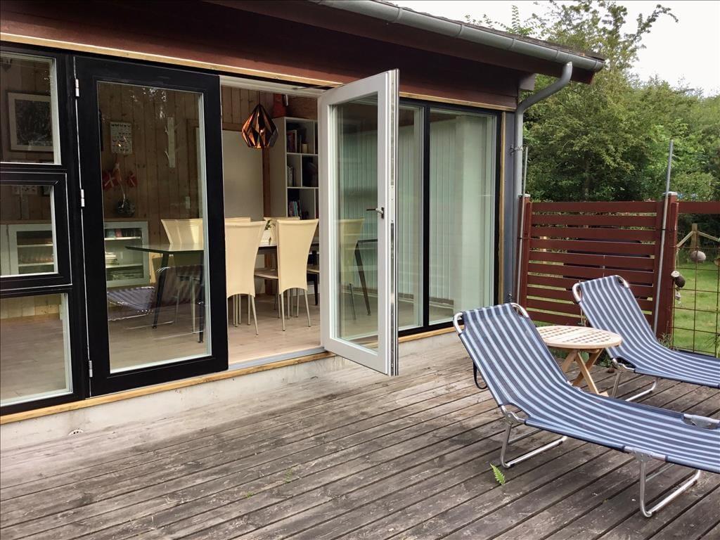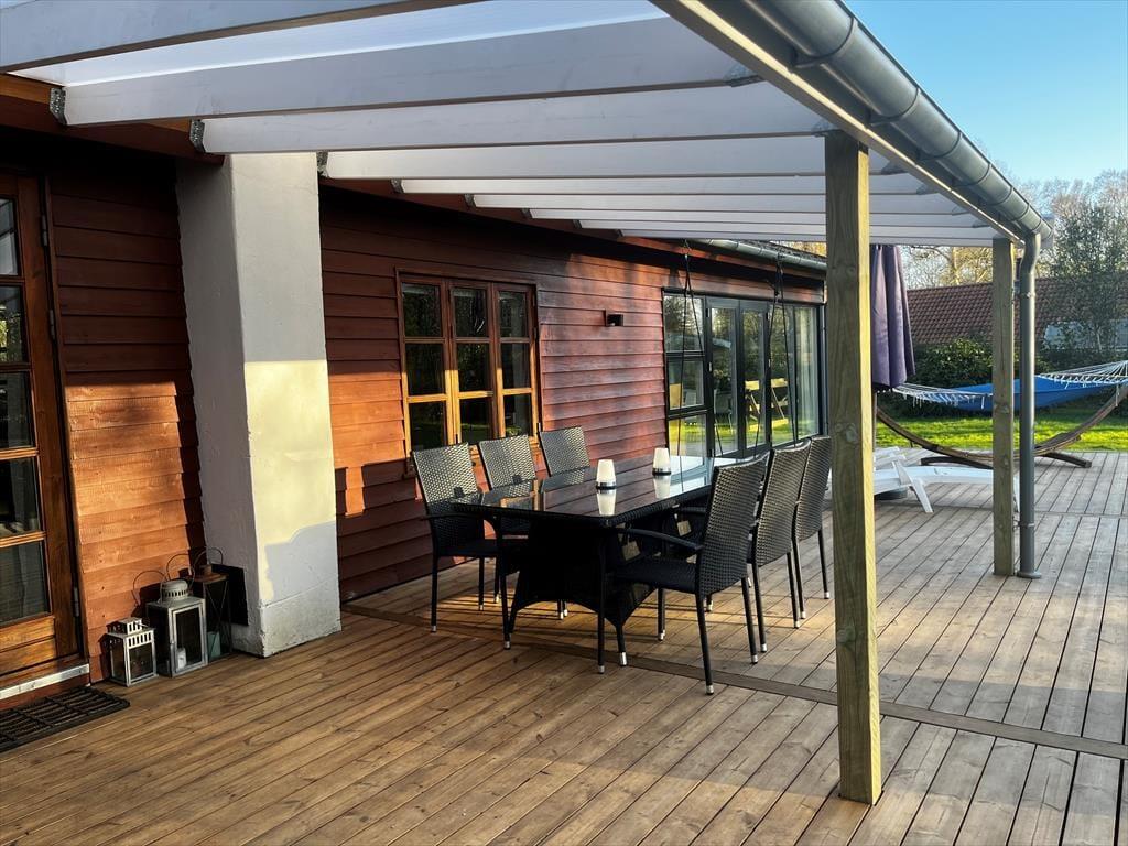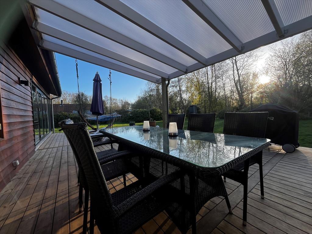 På den store terrasse kan du vælge enten at sidde i skygge under overdækningen eller flytte ud i solen og slappe af i en af liggestolene eller hængekøjen. Børn kan lege i sandkassen eller tage en tur i gyngen, og på grunden kan I også kaste med bold eller spille medbragte havespil.