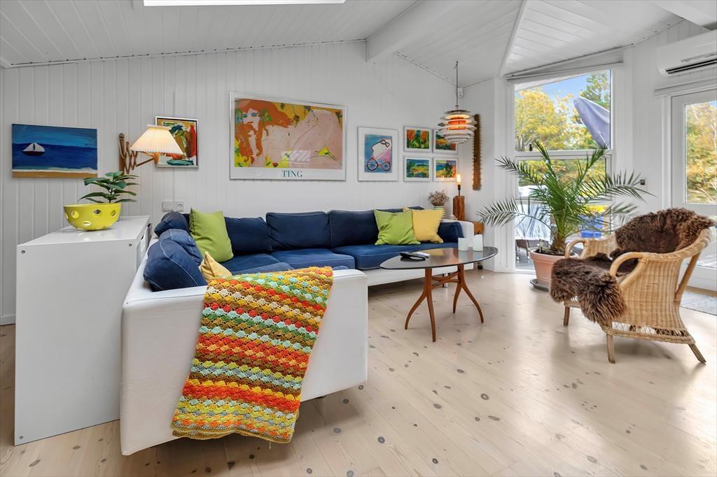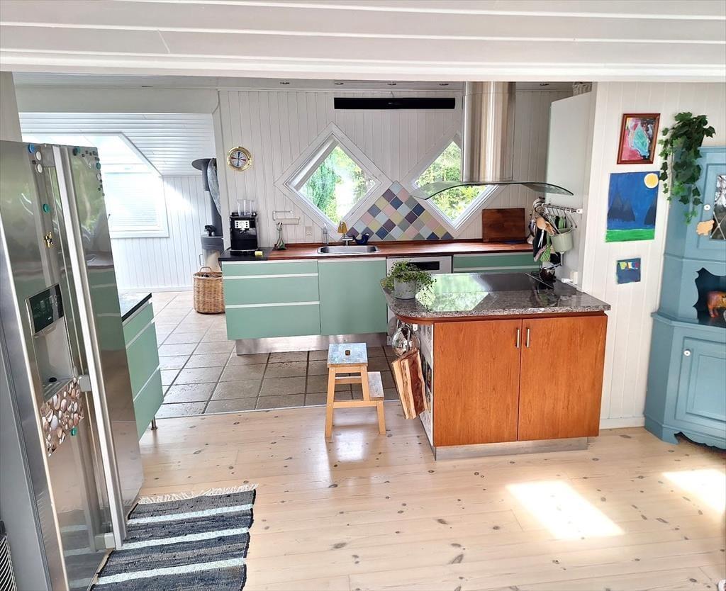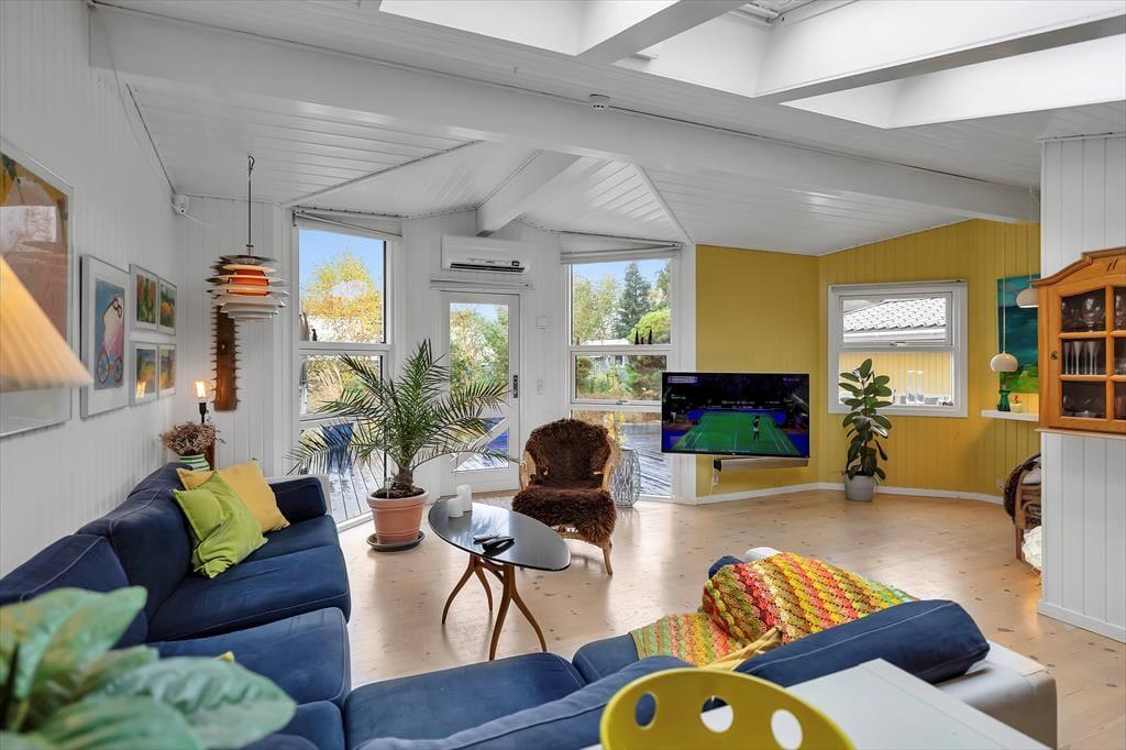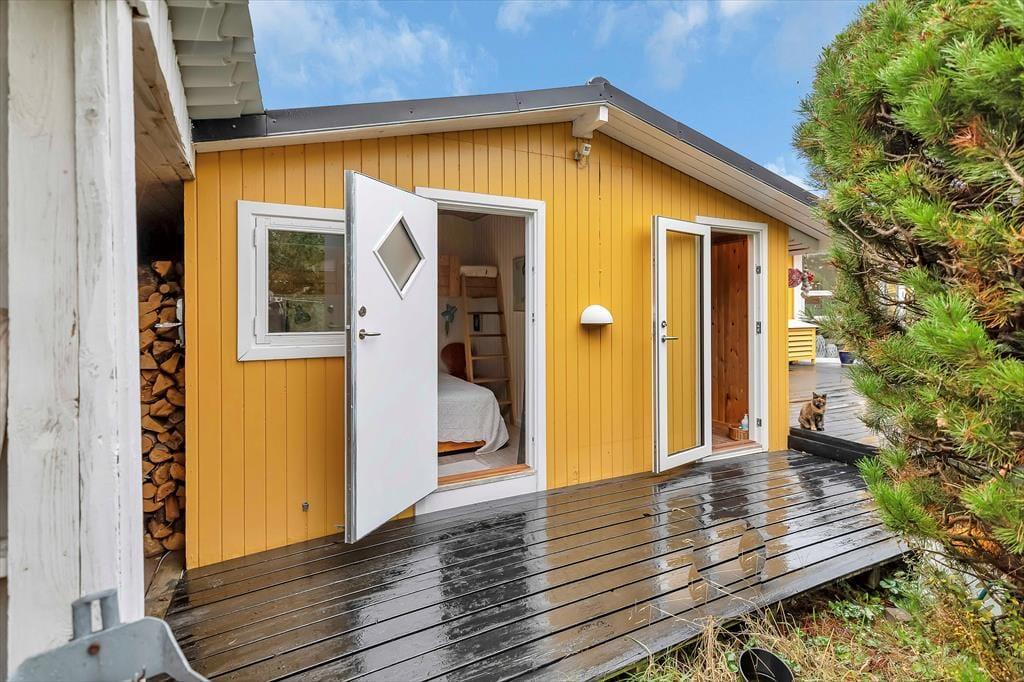 Sommerhusets hjerterum er den store dagligstue med stor tv-pakke og hurtigt internet og ligger i forbindelse med det åbne køkken. I køkkenet er der plads nok til at I kan hjælpes om tilberedningen af en god frokost og her kan du bl.a. også få friske isterninger til din drink fra det amerikanske køleskab. Der er også mulighed for at sætte sig og få en god snak ved spisebordet eller spille et hyggeligt brætspil. Der er et dejligt badeværelse med brus samt gæstetoilet. I det tilhørende anneks er der ud over et skønt soveværelse også en dejlig sauna, til fri afbenyttelse.