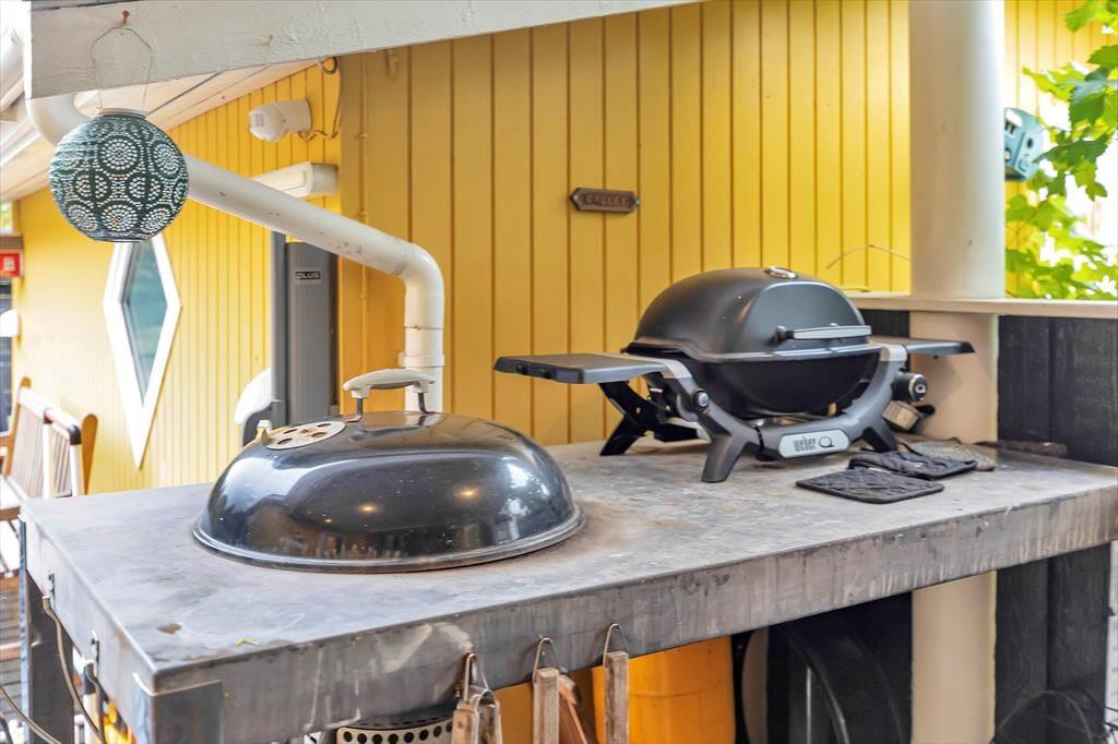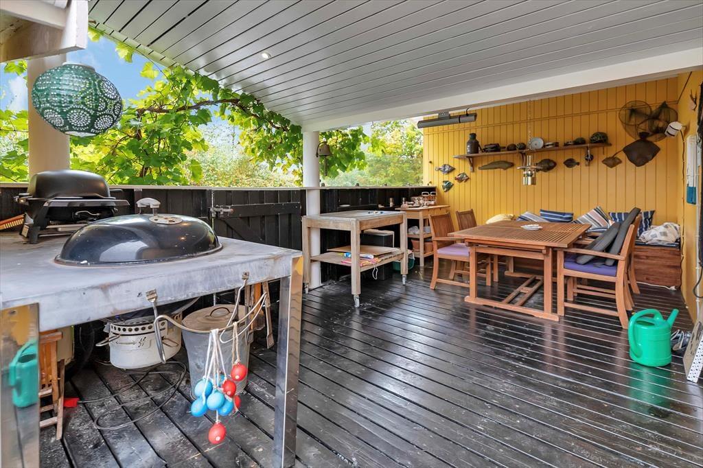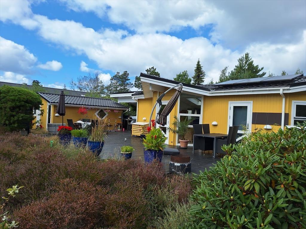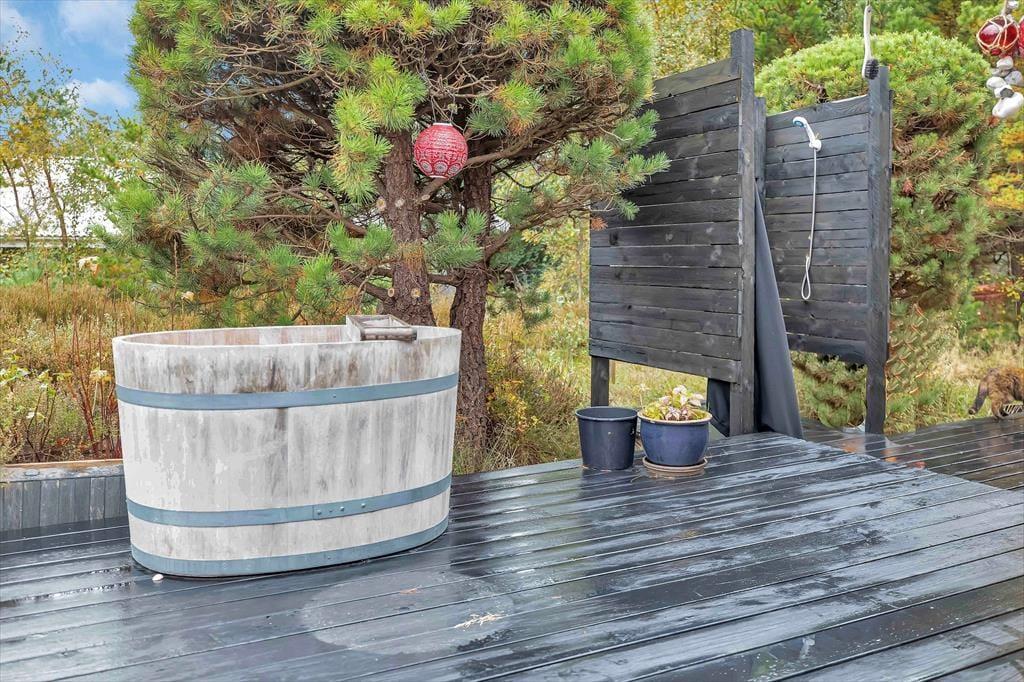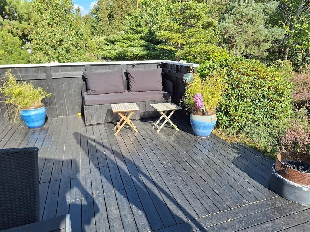 Efter en skøn dag på stranden kan du vælge at slappe af på terrassen og bare nyde solen samtidig med at du fordyber dig i en god bog. Husk også at benytte husets udebruser, hvor du kan skylle dig af under åben himmel. Naturgrunden kan ikke beskrives, den skal opleves, den smukke lyng og den hyggelige beplantning vil du helt sikkert sætte pris på. Når det er blevet tid til at nyde aftensmaden, så er det helt perfekt at sidde ved bordet på den superhyggelige overdækkede del af terrassen, hvor I også kan benytte jer af grill og udekøkkenet.