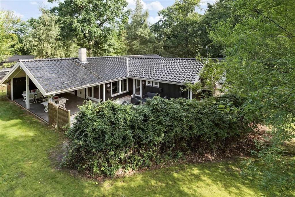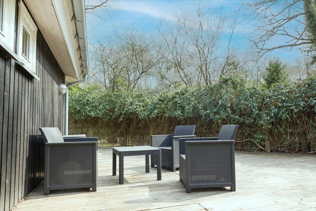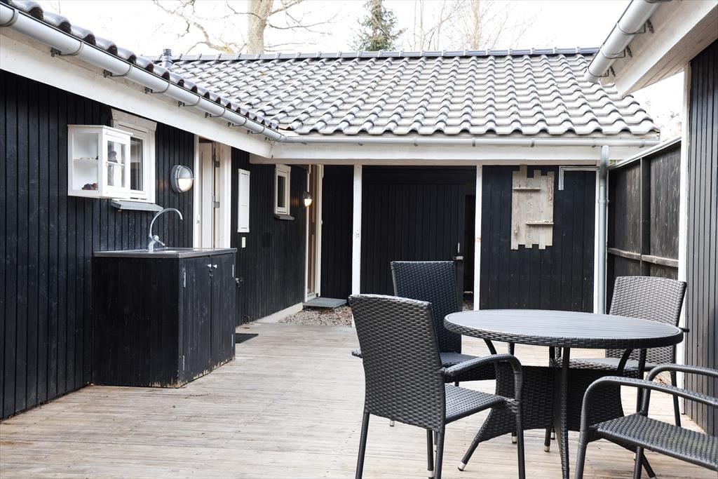 Udendørs kan sommerhuset store sydøst-vendte terrasse nydes hvor der er god plads til at slikke sol eller nyde en god frokost. Bliver solen for meget og det er tid til lidt skygge, eller er det blevet aften og duggen begynder at falde, så er der en god stor overdækket terrasse man kan sætte sig på, hvortil der er udgang fra stuen. I haven kan børn og voksne konkurrere med havespil og bordtennis eller børnene kan boltre sig i trampolinen.