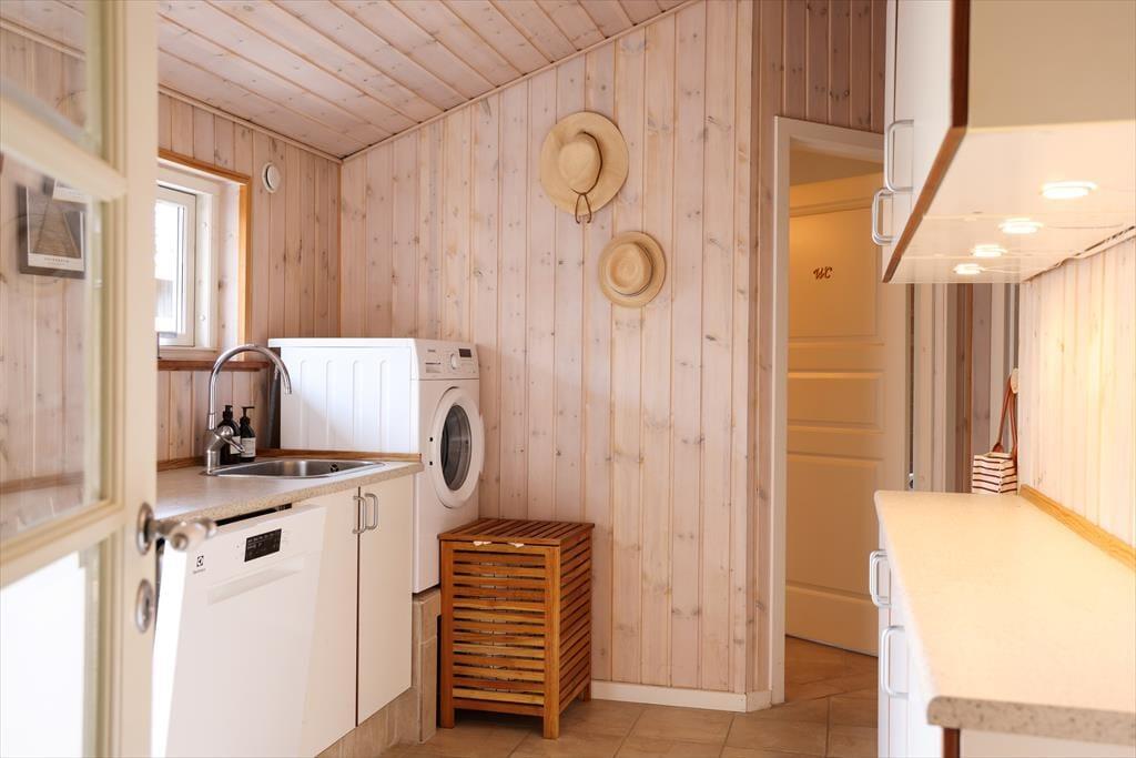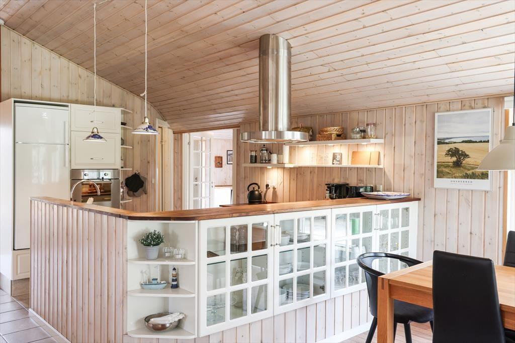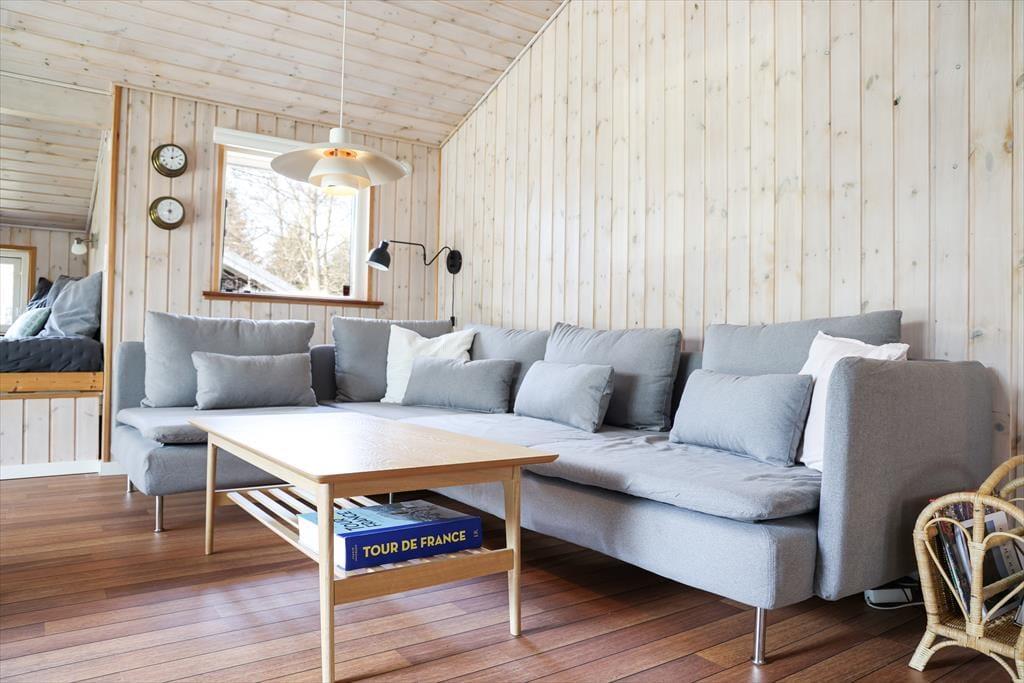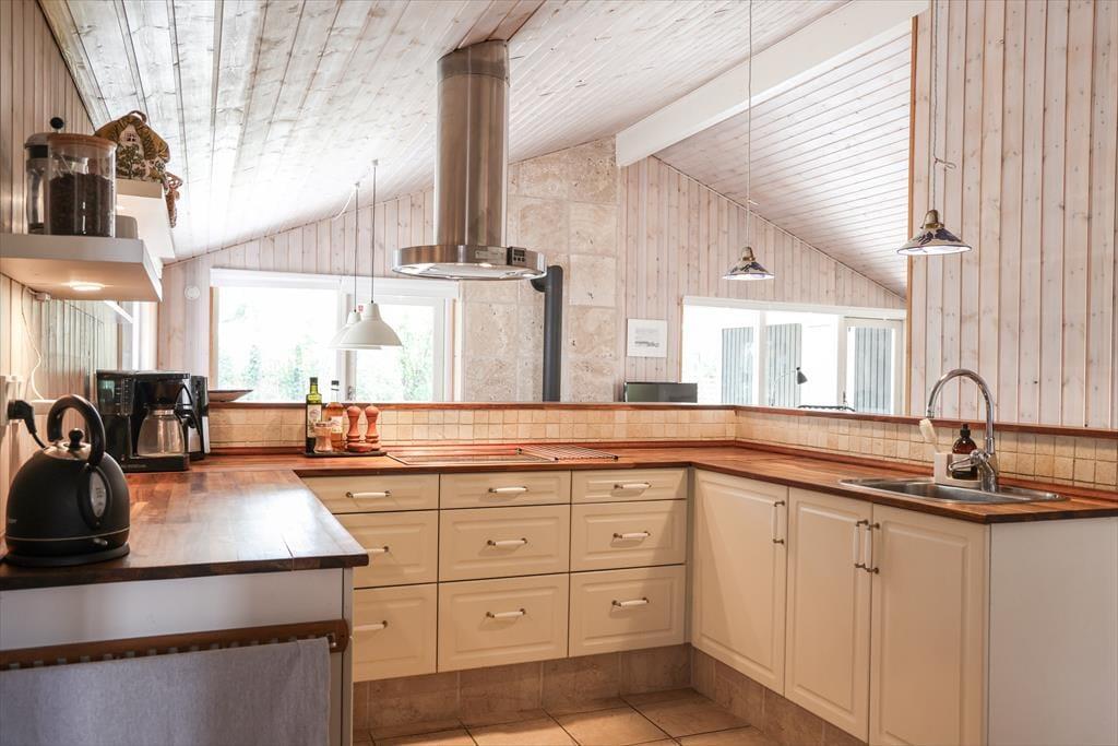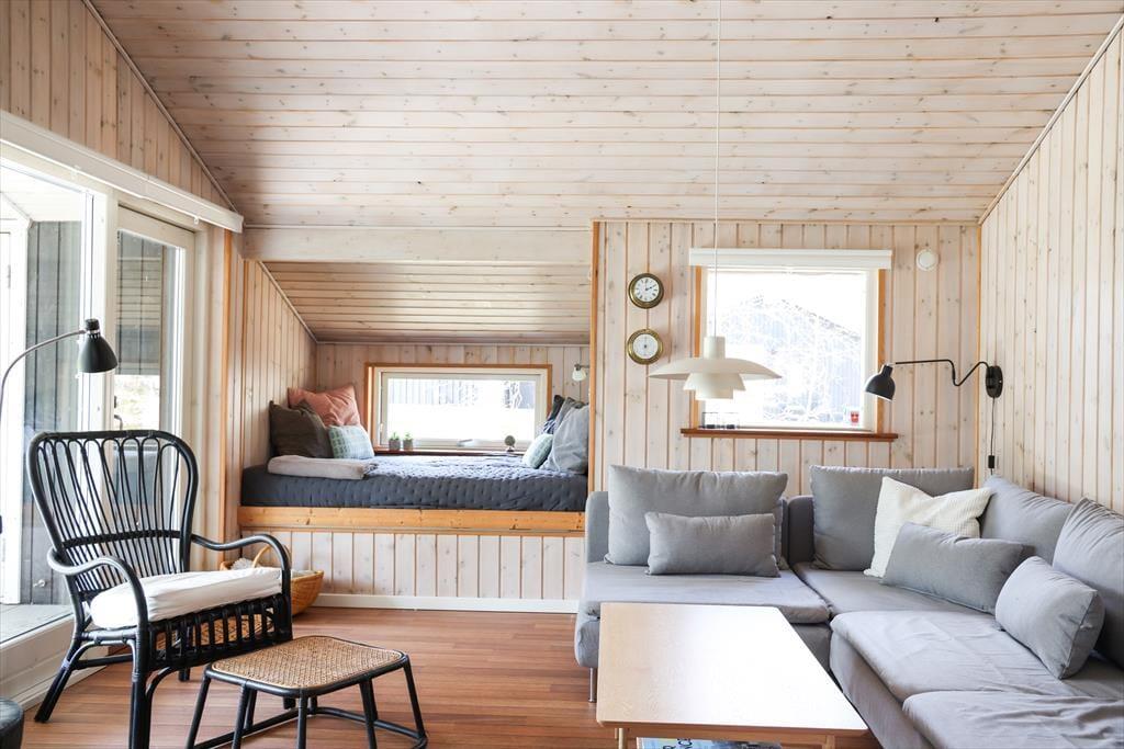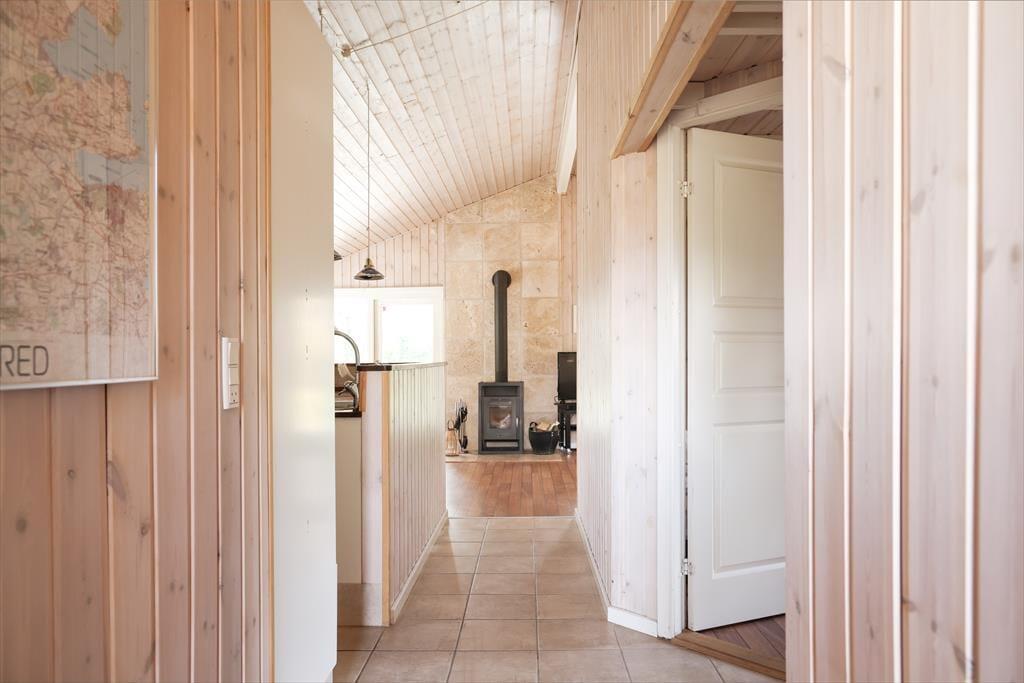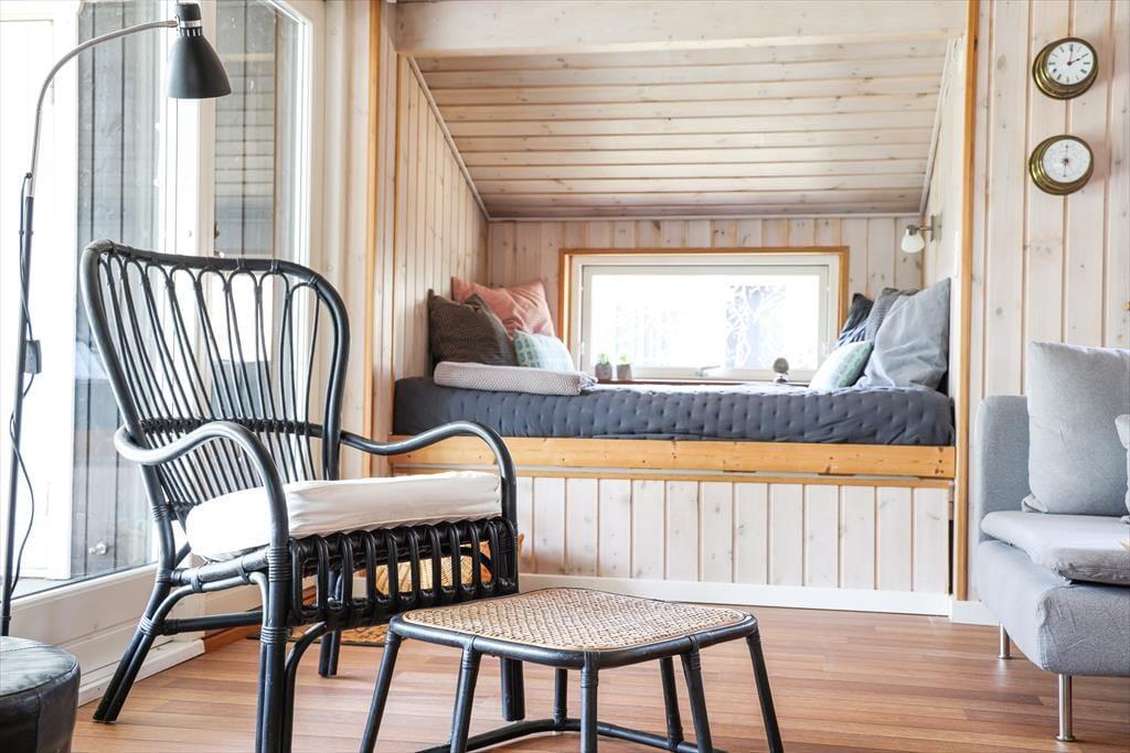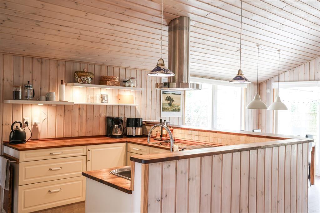 Indendørs i dette fantastiske sommerhus mødes du af lyse og indbydende rum med højt til loftet. Sommerhusets hjerterum er helt centralt i huset, nemlig det store køkken/alrum som inviterer til mange hyggelige stunder med madlavning og afslapning ved spisebordet. I stuen kan de kølige aftener nydes med en god bog til brændeovnens knitren, alt imens du ligger og slapper af i den hyggelige alkove. I kan også samles om et spil rundt om sofabordet, da der er flere spil i huset under alkoven. Med sommerhusets gode planløsning og de mange kvadratmeter, kan venner og familie samles til en hyggelig ferie, hvor voksne kan hygge sig om aftenen uden at vække børnene.