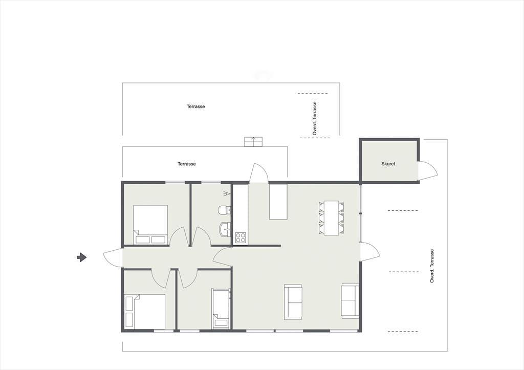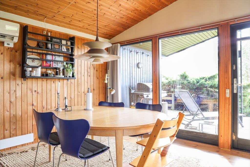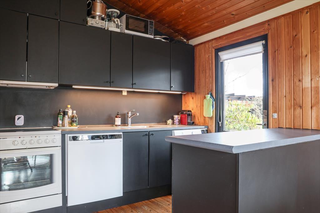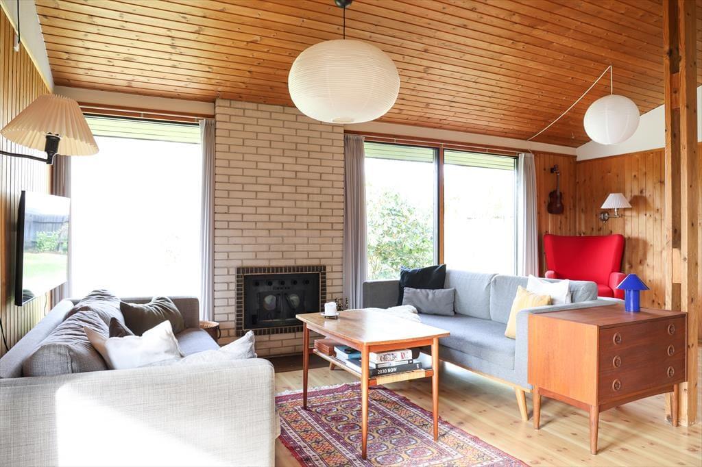 Husets dagligstue ligger i forbindelse med det åbne køkken, så mens nogle i familien slapper af i sofaen, kan du tænde ovnen og gøre klar til aftenens steg. Der er også mulighed for at sætte sig og få en snak ved spisebordet eller spille et hyggeligt brætspil.