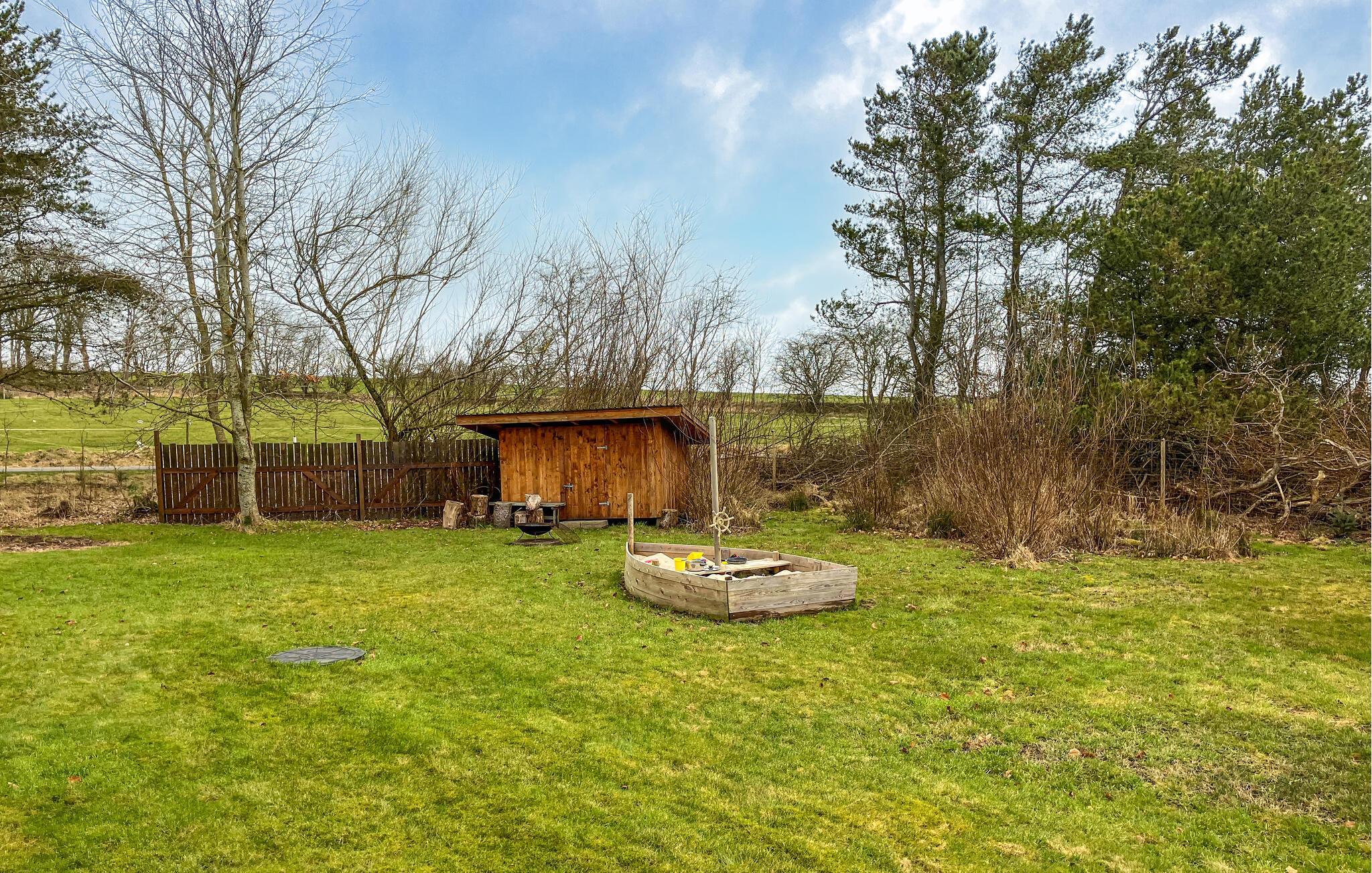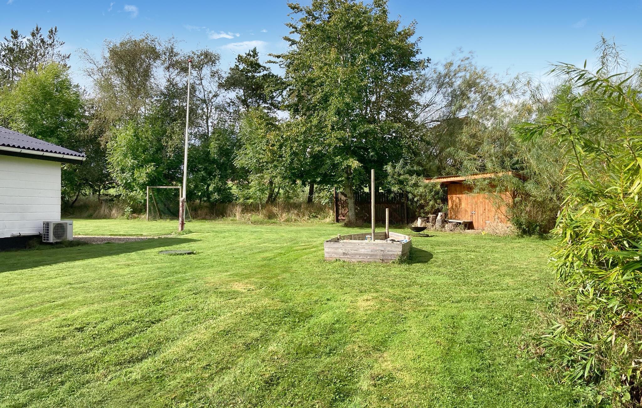Hyggeligt feriehus nær Sillerslev Strand med terrasse, bålplads og plads til aktiviteter i haven.