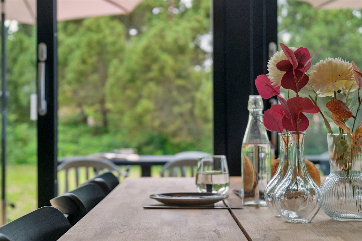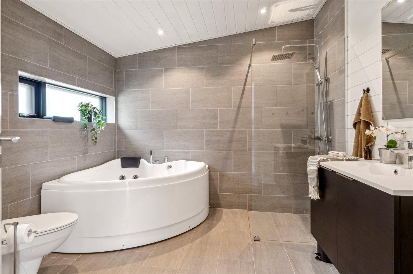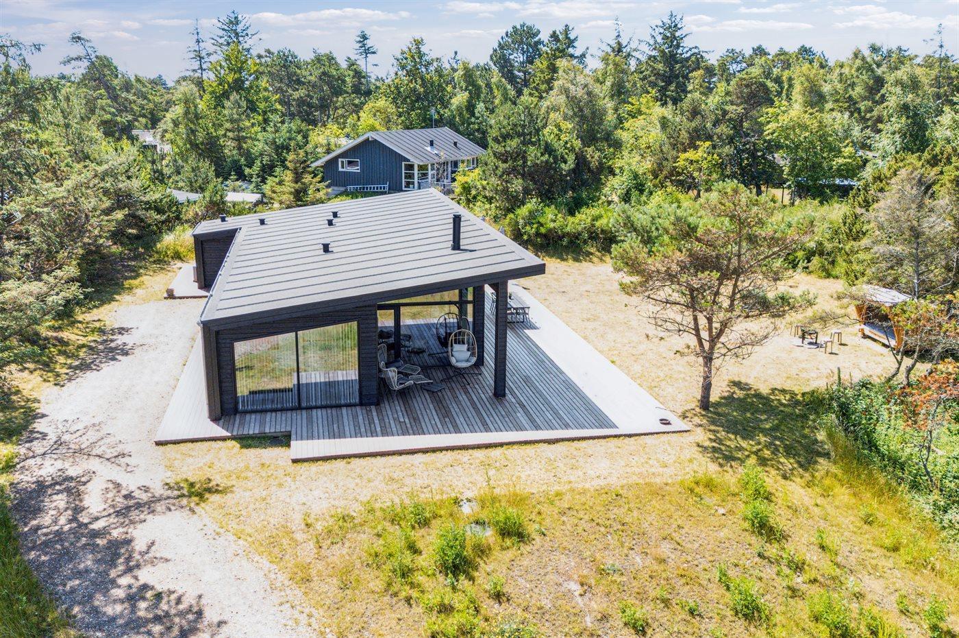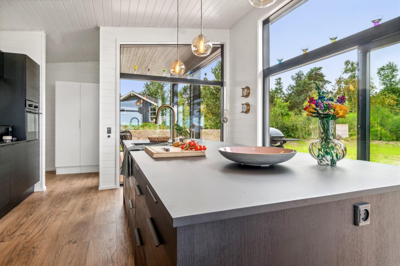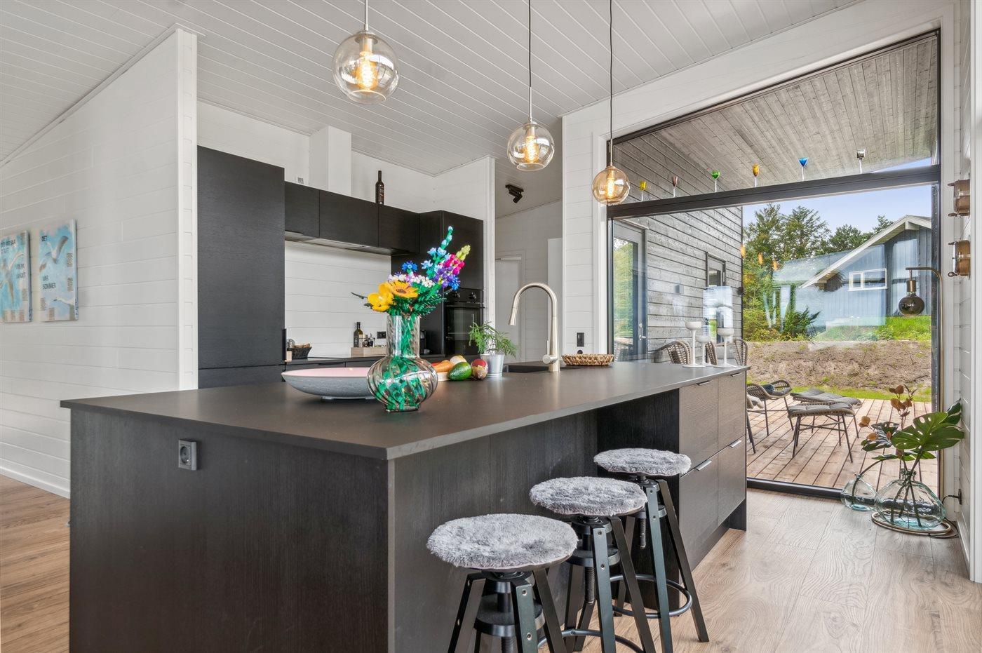 Huset er beliggende på en smuk naturgrund med panoramaudsigt fra huset og fra det store terrasseområde med helårsanvendelig udebruser og med overdækkede terrasser mod både nord og syd, hvor der er god mulighed for at nyde solen og for at finde skygge og læ. Husets samlingssted er det store moderne køkkenalrum med køkkenø i direkte forbindelse med stuen og med skydedøre til terrassen, som på forbilledlig vis forbinder inde- og udeområdet.
