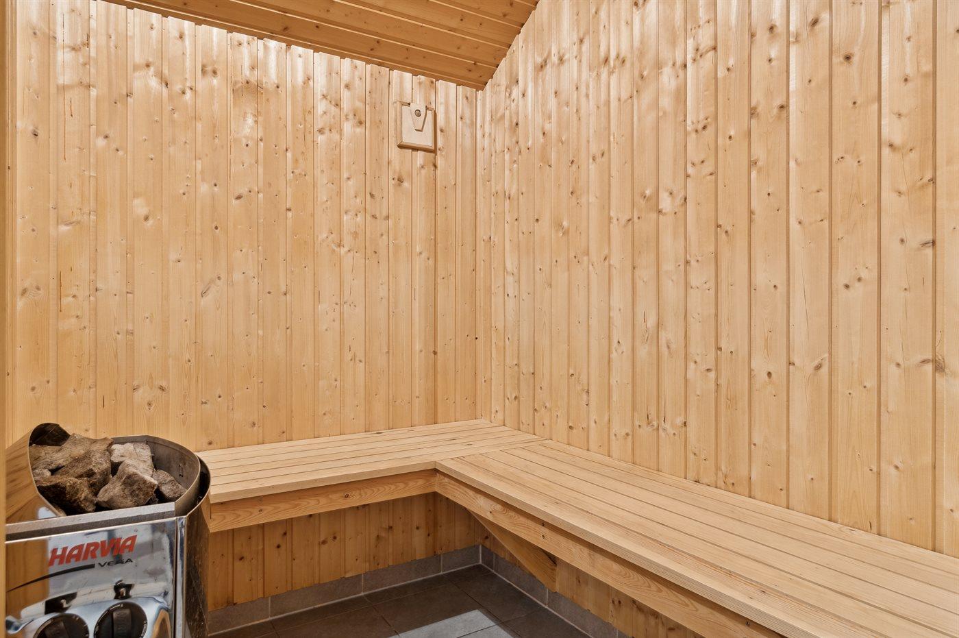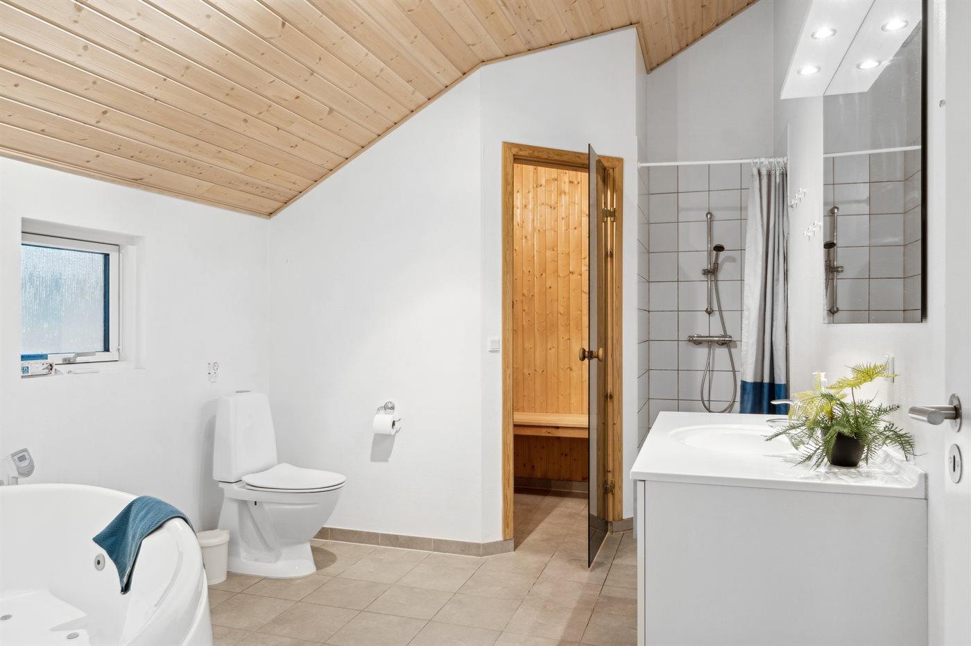 Der er 2 badeværelser med bruseniche og 2 toiletter. Der er gulvvarme på 2 badeværelser. I saunaen er der mulighed for afslapning.
