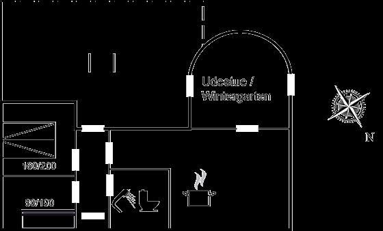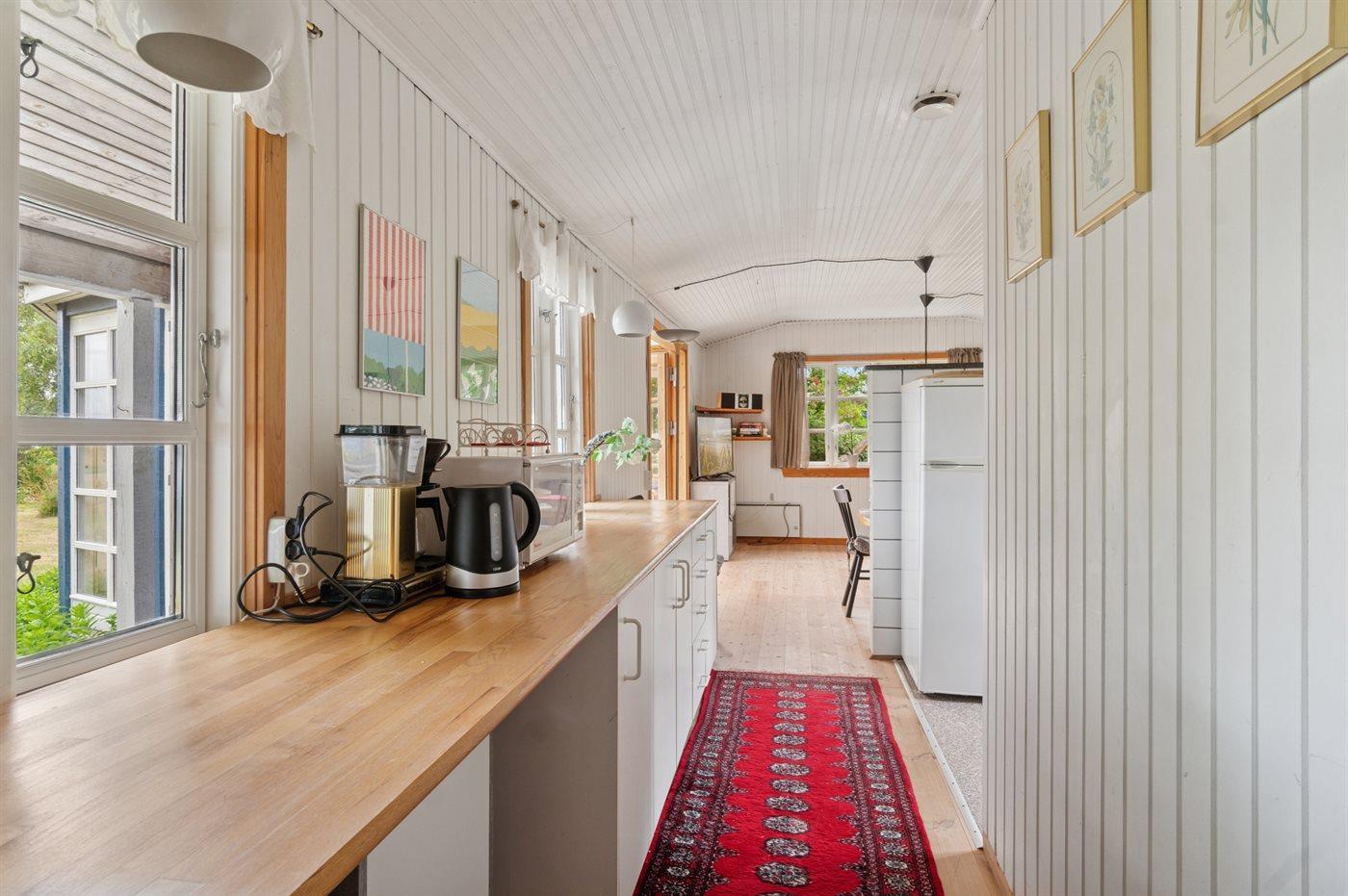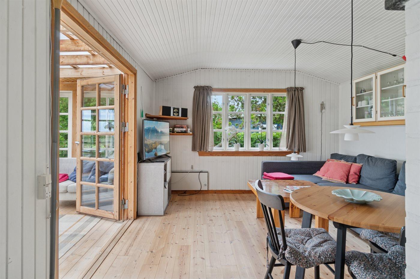 Huset indeholder en hyggelig stue og spiseplads, hvor køkkenet grænser direkte op til. Herfra er udgang til en dejlig lys og sydvendt udestue og en skøn terrasse.