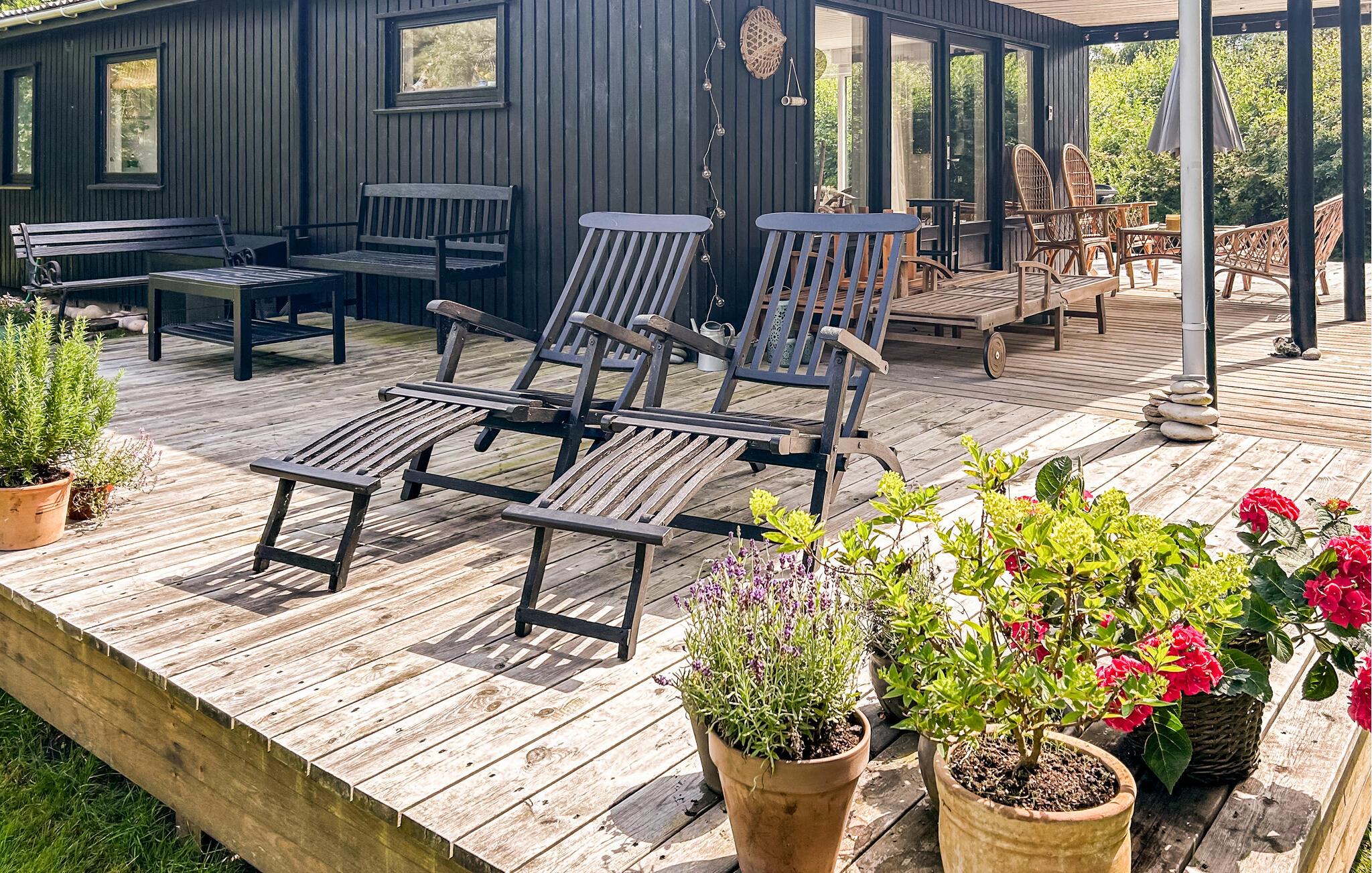 Gå ud på den store træterrasse, der løber hele vejen rundt om huset, og nyd den friske luft. Start dagen med morgenmad udenfor, eller brug de komfortable havemøbler til afslappende stunder. Bliv kølet af under udebruseren, som er let tilgængelig fra terrassen, og læn jer tilbage på liggestolene. Tænd op i grillen om aftenen, og lad dagen slutte i rolige omgivelser.