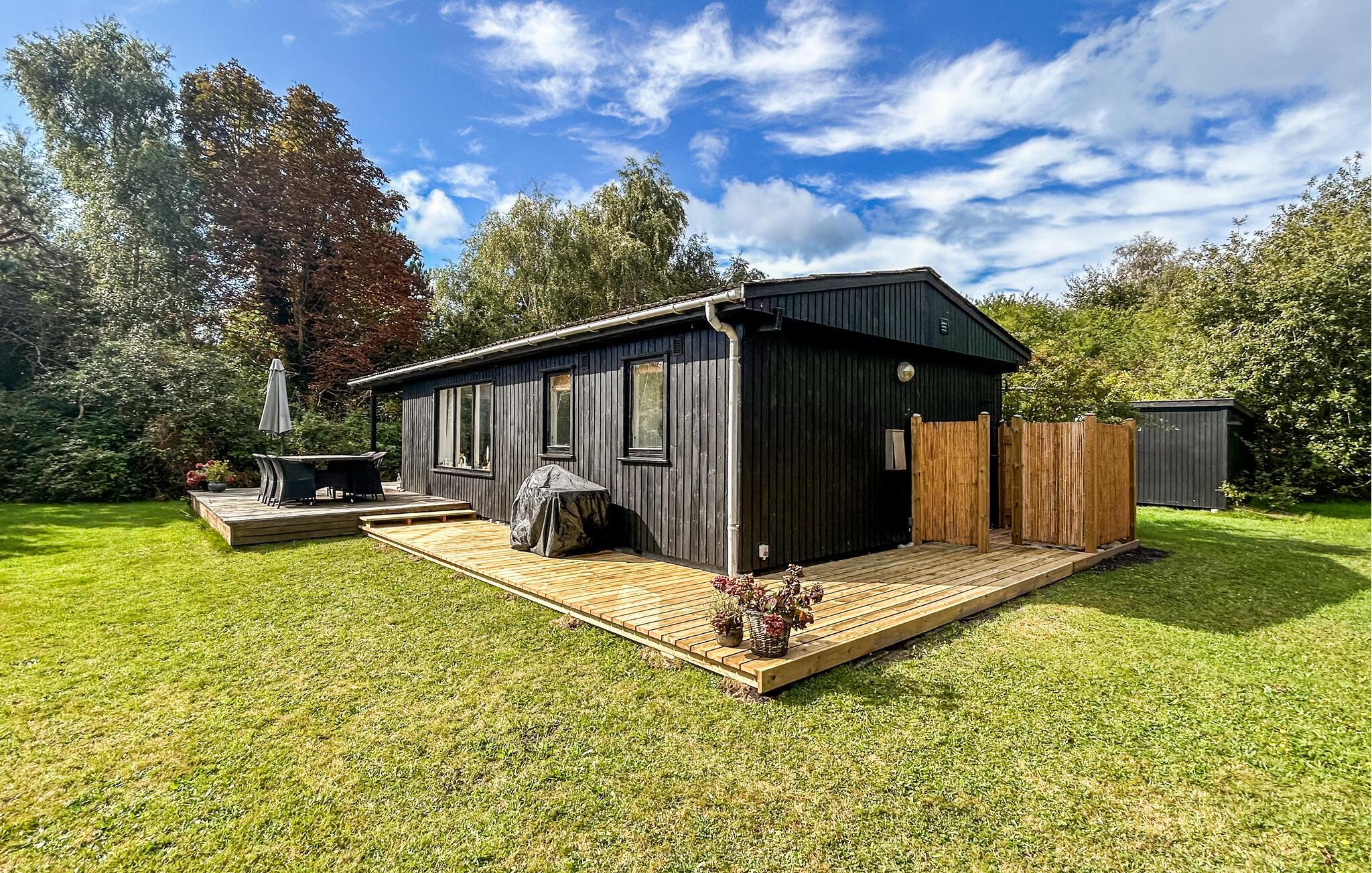 Stilfuldt træhus tæt på stranden med stor terrasse, brændeovn og moderne faciliteter for en afslappende ferie.