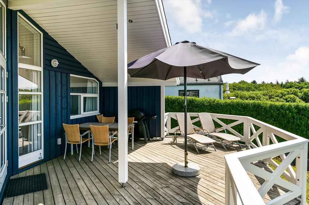 I forlængelse af stuen ligger en vidunderlig terrasse, der er dejligt solrig takket være den sydvestvendte orientering. Placeringen betyder også, at du har frit udsyn til kyststrækningen og bugten, når du slapper af i den friske luft – på en klar dag kan du endda se helt til vadehavsøen Langli og den fredede halvø Skallingen. Hvis du får mere lyst til at sidde i skyggen frem for at slikke sol, kan du rykke ind under overdækningen eller slå parasollen op, og hvis du vil have græs under fødderne, kan du tage terrassens trappe ned til havens grønne græsplæne.