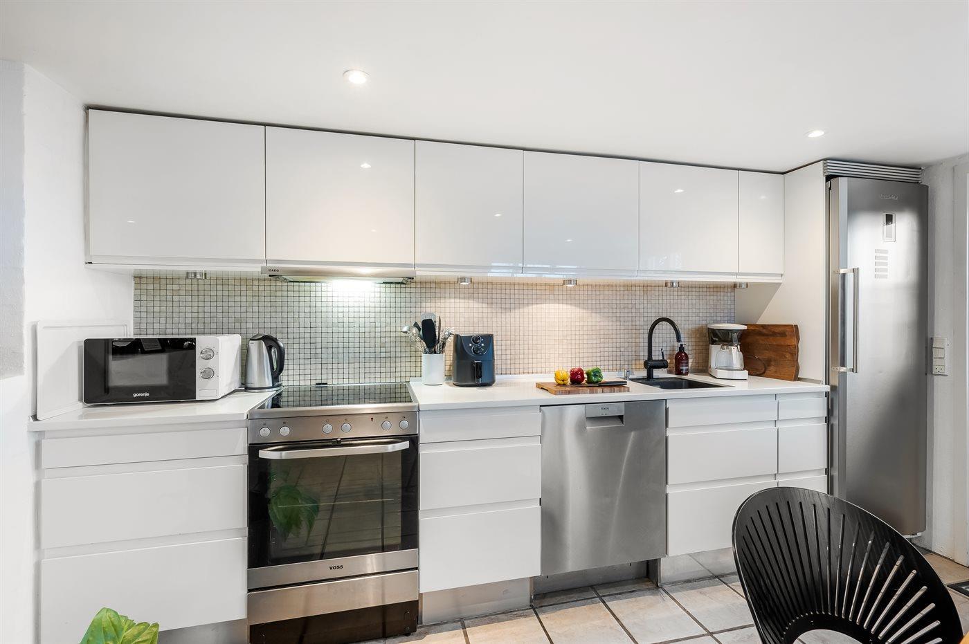 Køkkenet er udstyret med 1 køleskab. Der er 4 keramiske kogeplader, varmluftovn, mikrobølgeovn samt opvaskemaskine.