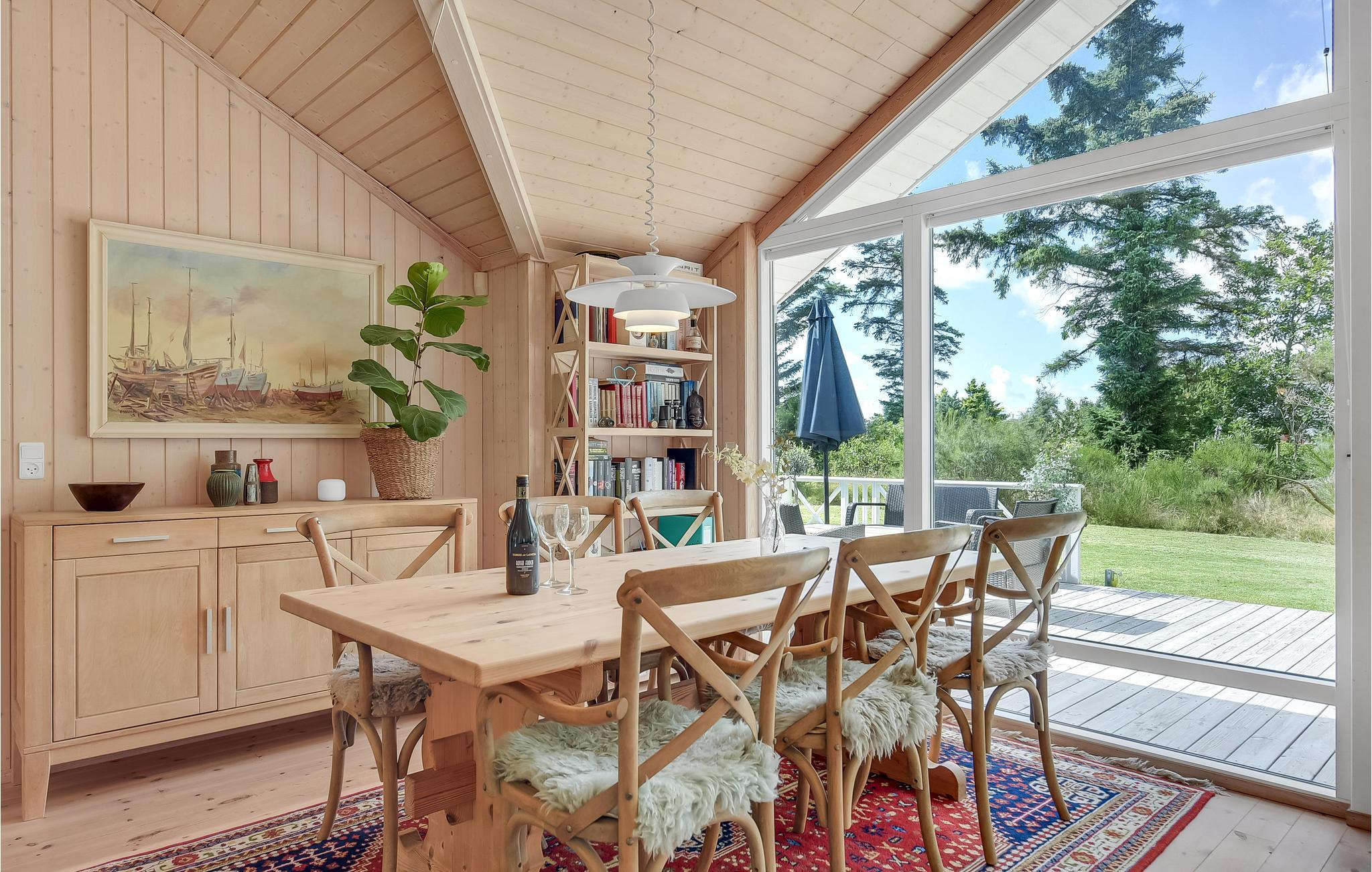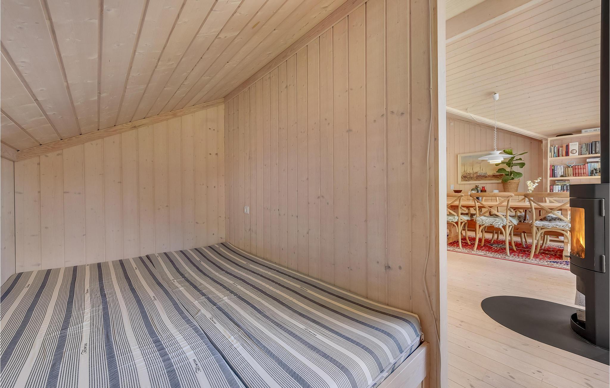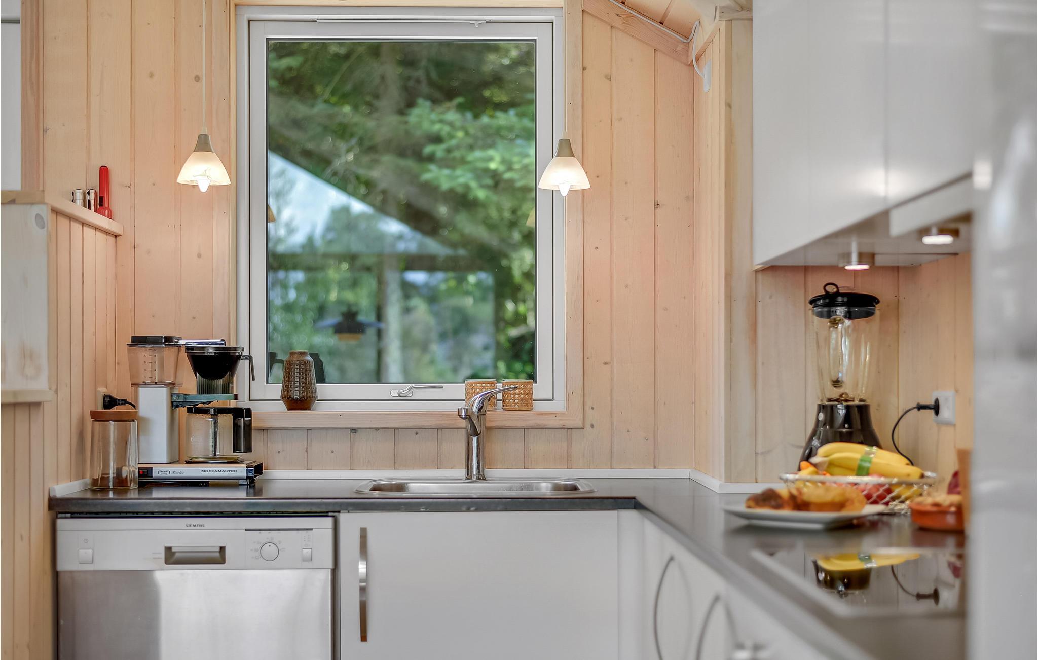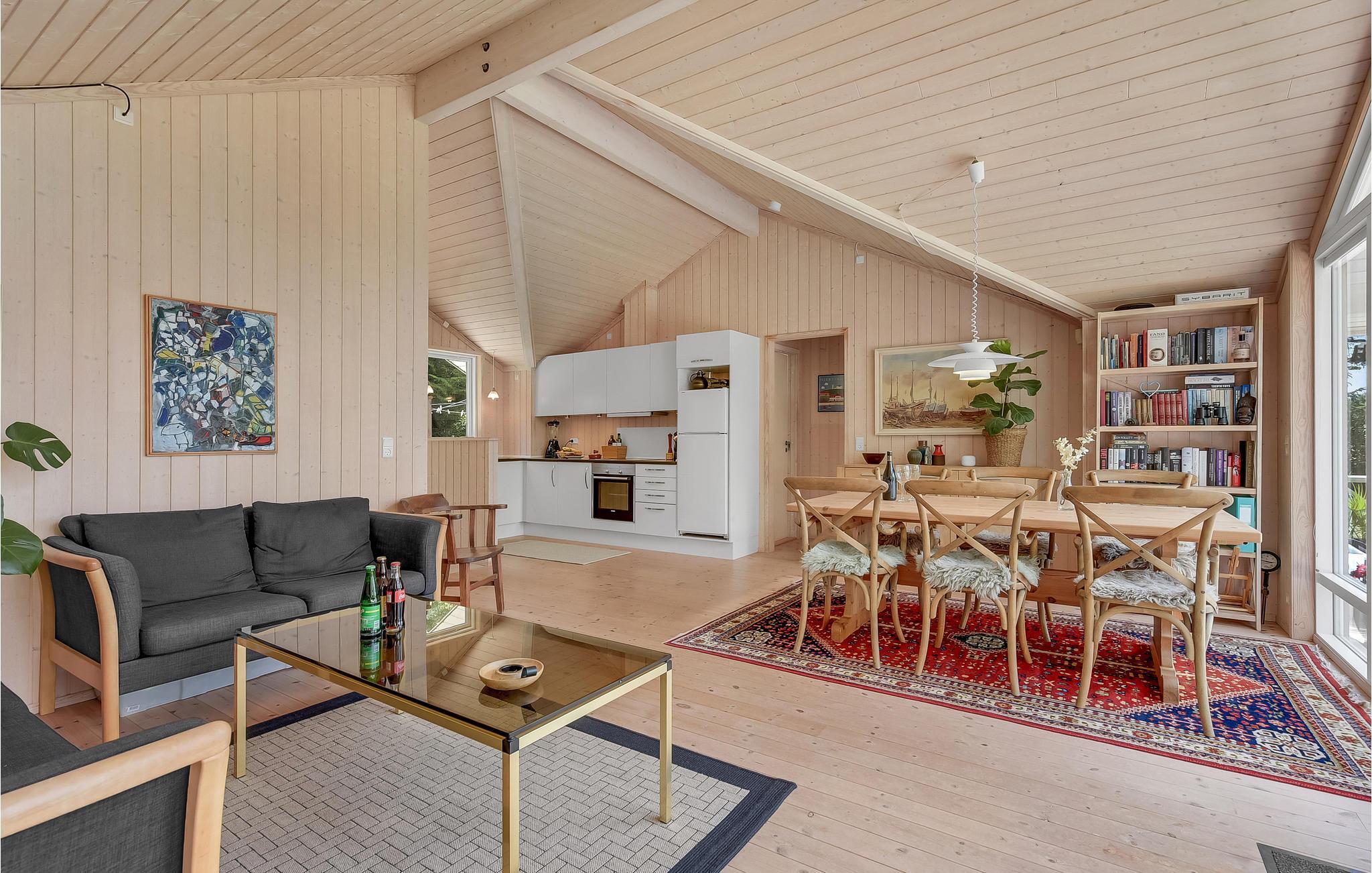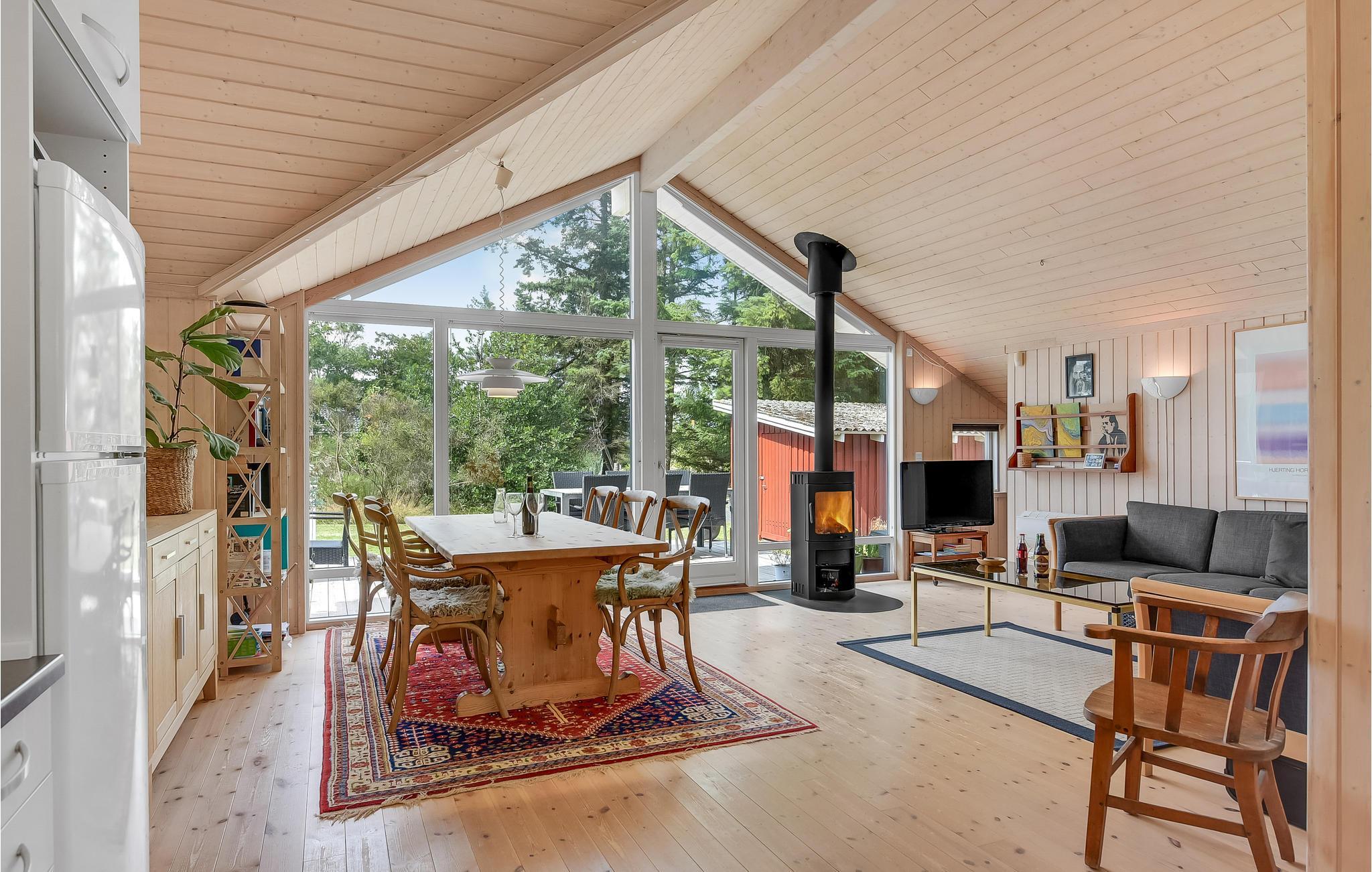 Husets centrum er den åbne stue med spisebord, sofahjørne og åbent køkken, hvorfra I har udsigt til haven. Slap af med en god bog, mens I nyder varmen fra brændeovnen eller snup en familiedyst over et brætspil ved spisebordet. Der er to soveværelser og et badeværelse.