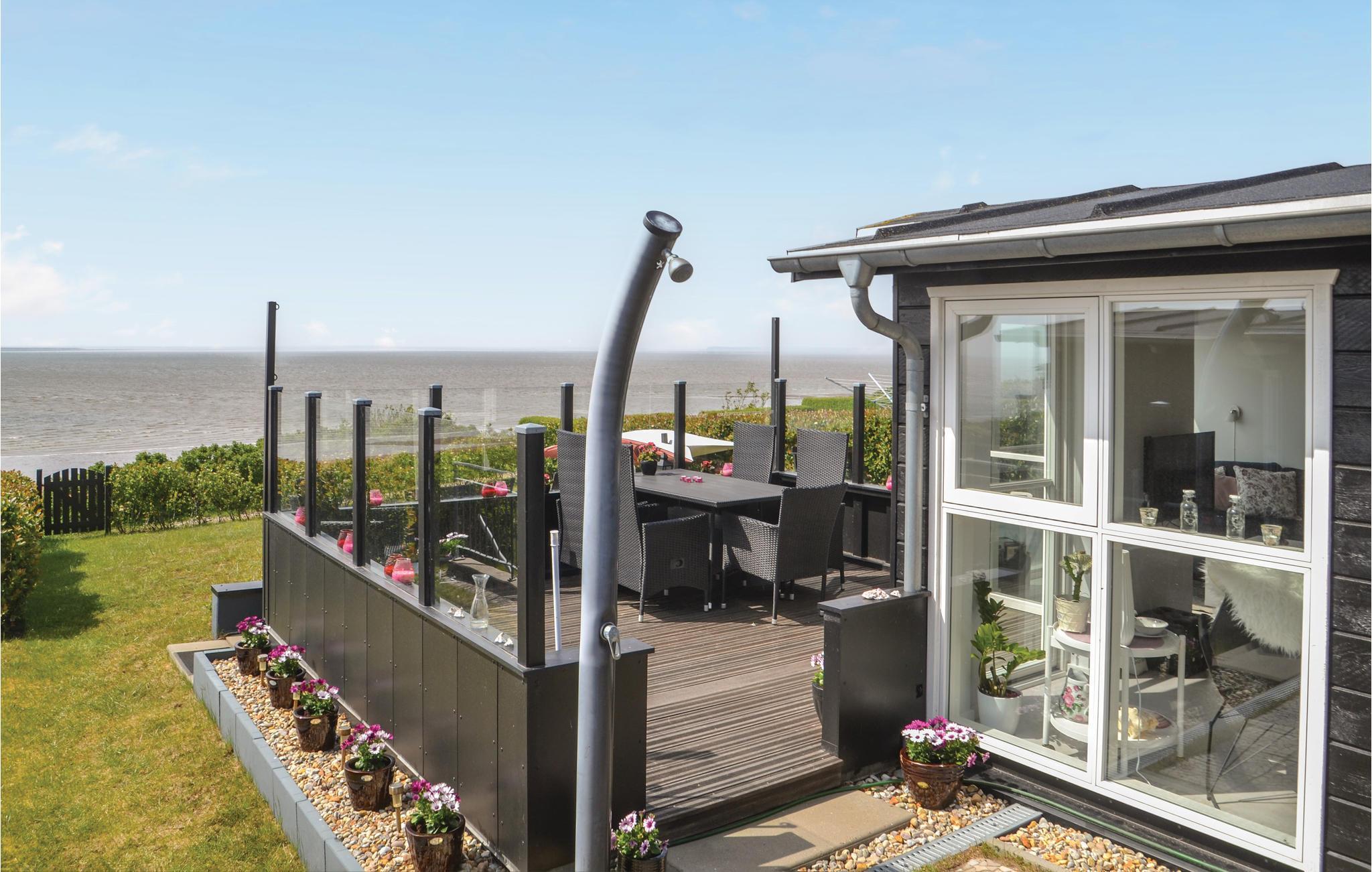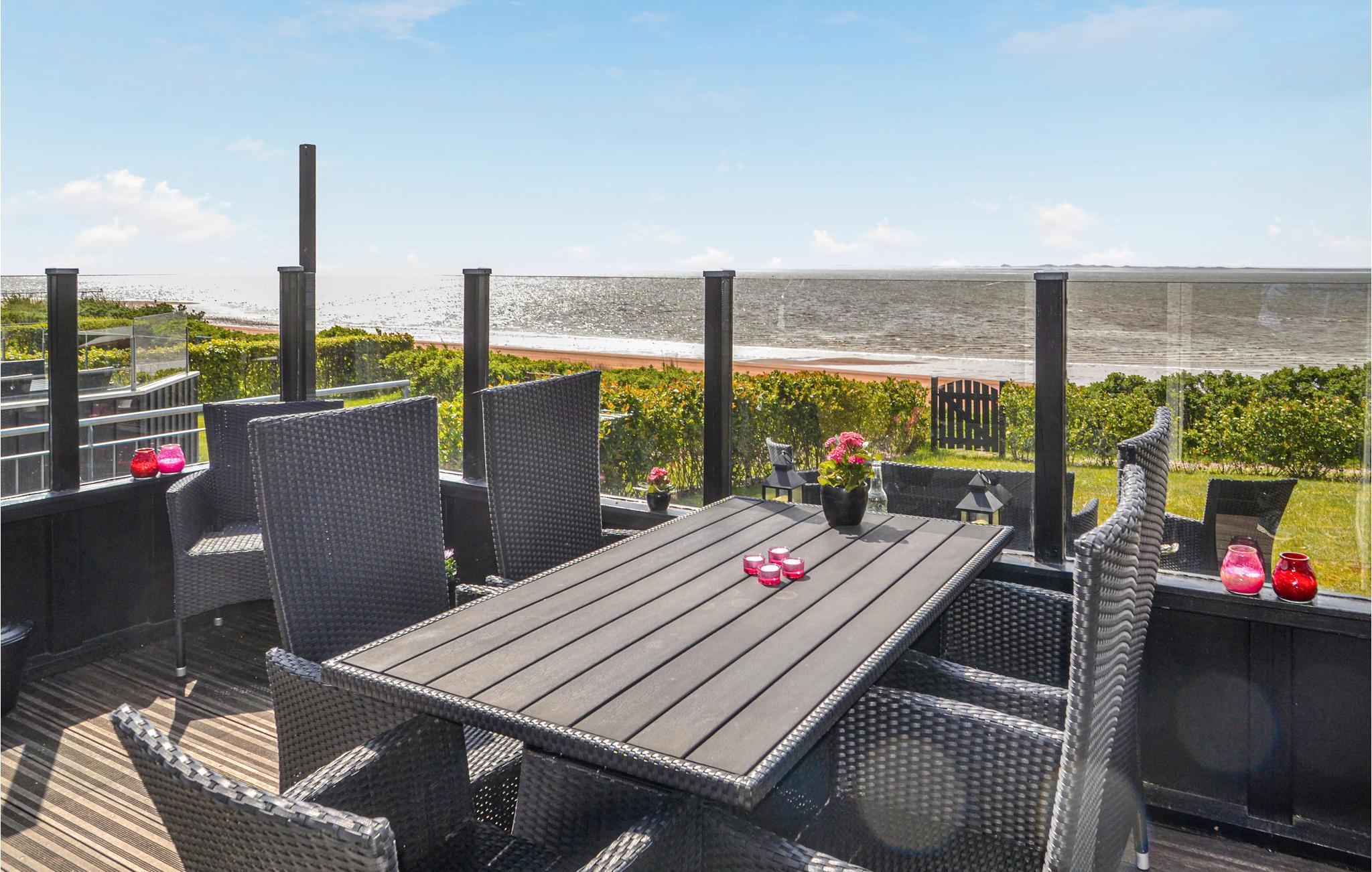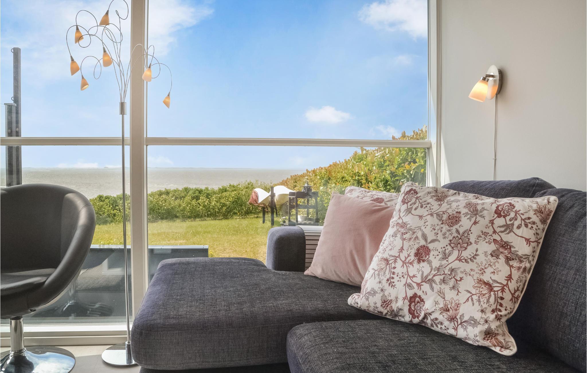 Eksklusivt sommerhus med en enestående beliggenhed helt ned til strandkanten og selvfølgelig med panoramaudsigt fra huset over Vesterhavet og indsejlingen til Esbjerg og Fanø. I klart vejr kan Blåvand Fyr ses ude mod vest. Feriehuset er i to plan med et godt indrettet køkken, der er åbent mod stuen med panoramavinduer mod havet og med brændeovn samt klimaanlæg. Fra feriehuset er der sti til strande, og ved terrassen er der opsat et praktisk udendørs brusebad. Der er god plads til seks gæster, da der er badeværelse med gulvvarme på hver etage. Der er desuden gulvvarme i hele husets nederste etage.
