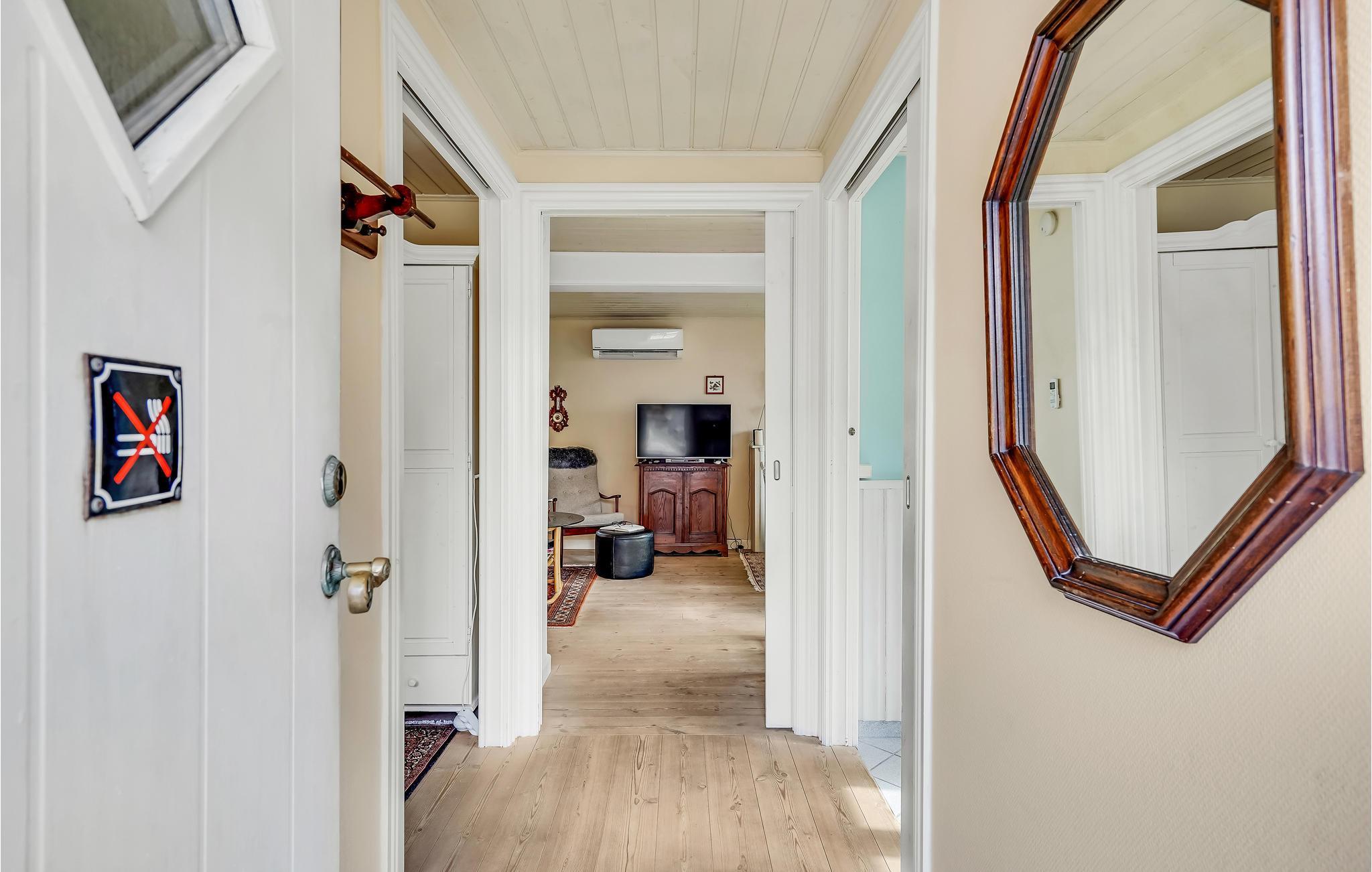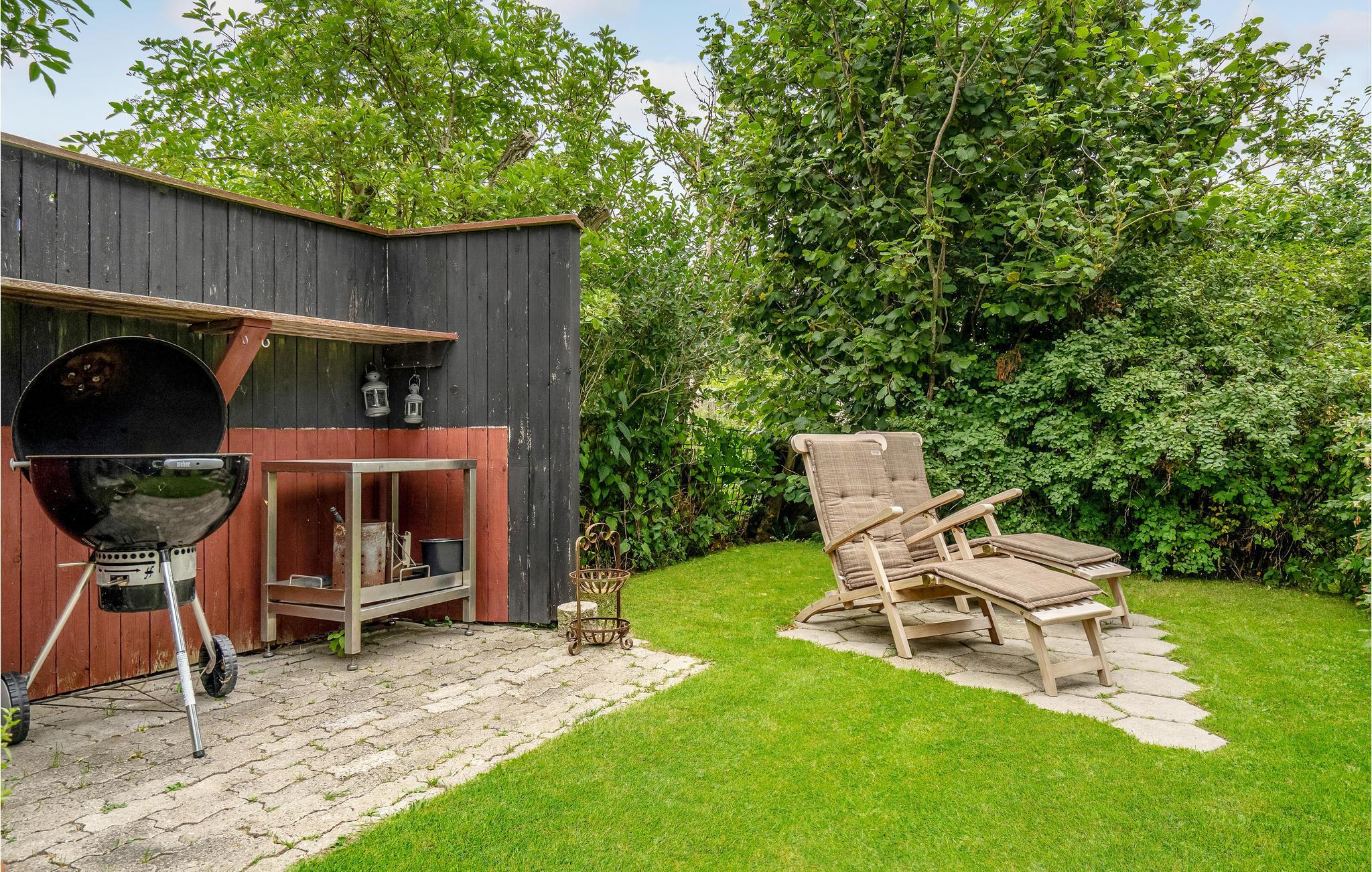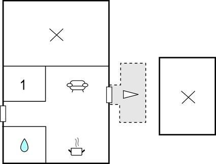 Det er indrettet med et soverum med to enkeltsenge samt en sovesofa til to personer i stuen. Det lille køkken ligger i åben forbindelse med stuen, hvorfra der er udgang til terrassen og den skønne have. Feriehuset er handicapvenligt indrettet med skydedøre og uden dørtrin. Mindste dørbredde er havedøren på 75 cm, terrassen kan også nås fra havesiden.