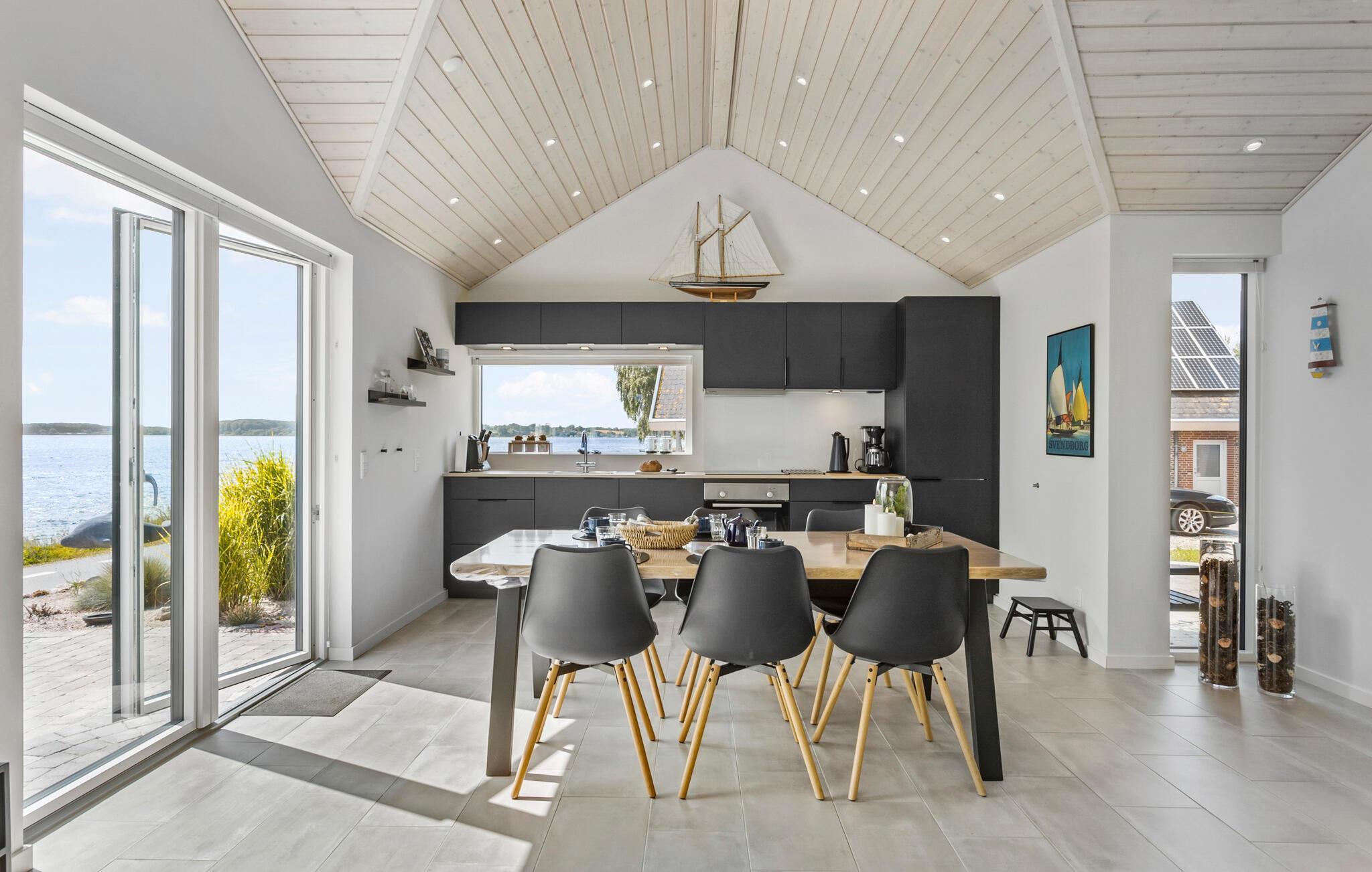 Stuen får dagslyset ind gennem de brede vinduespartier, og i det åbne køkken kan I se frem til flot, moderne udstyr, som gør det til en fornøjelse at lave maden sammen.