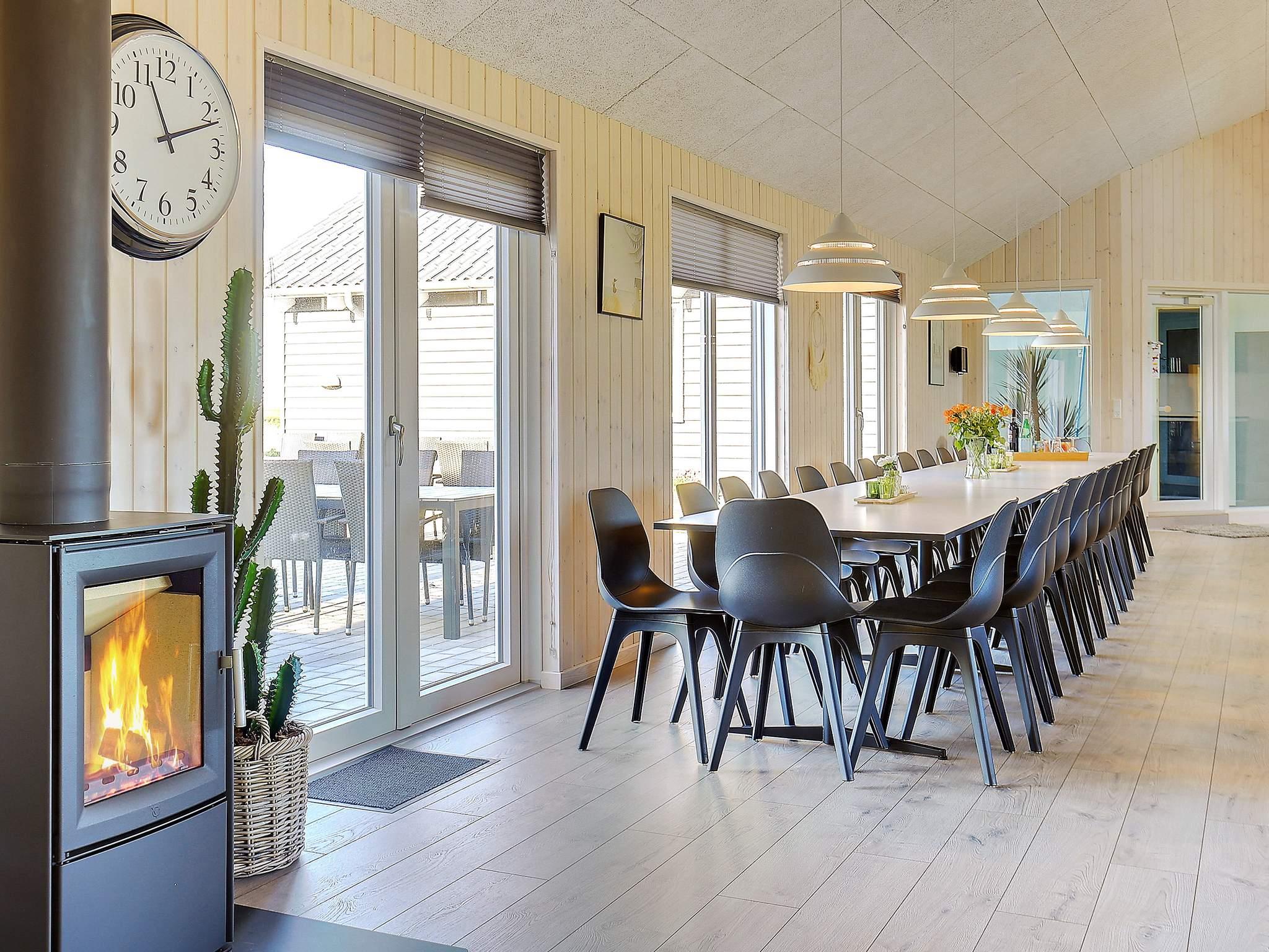 Aktivitetsrummet har bar med eget køleskab, og opholdsrummet har brændeovn til de koldere dage.