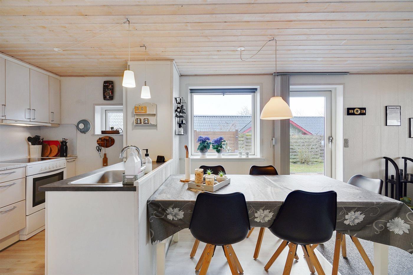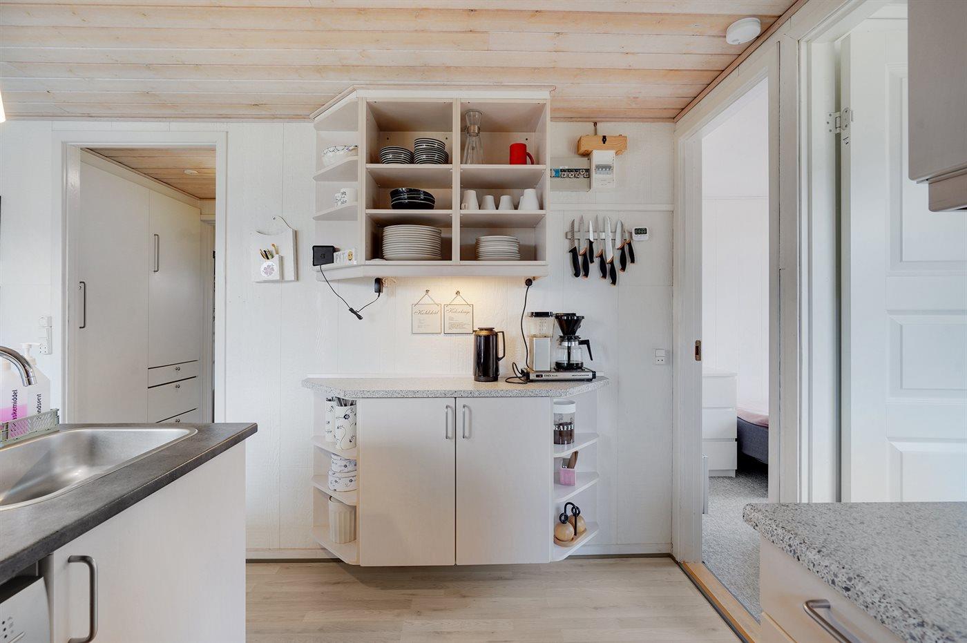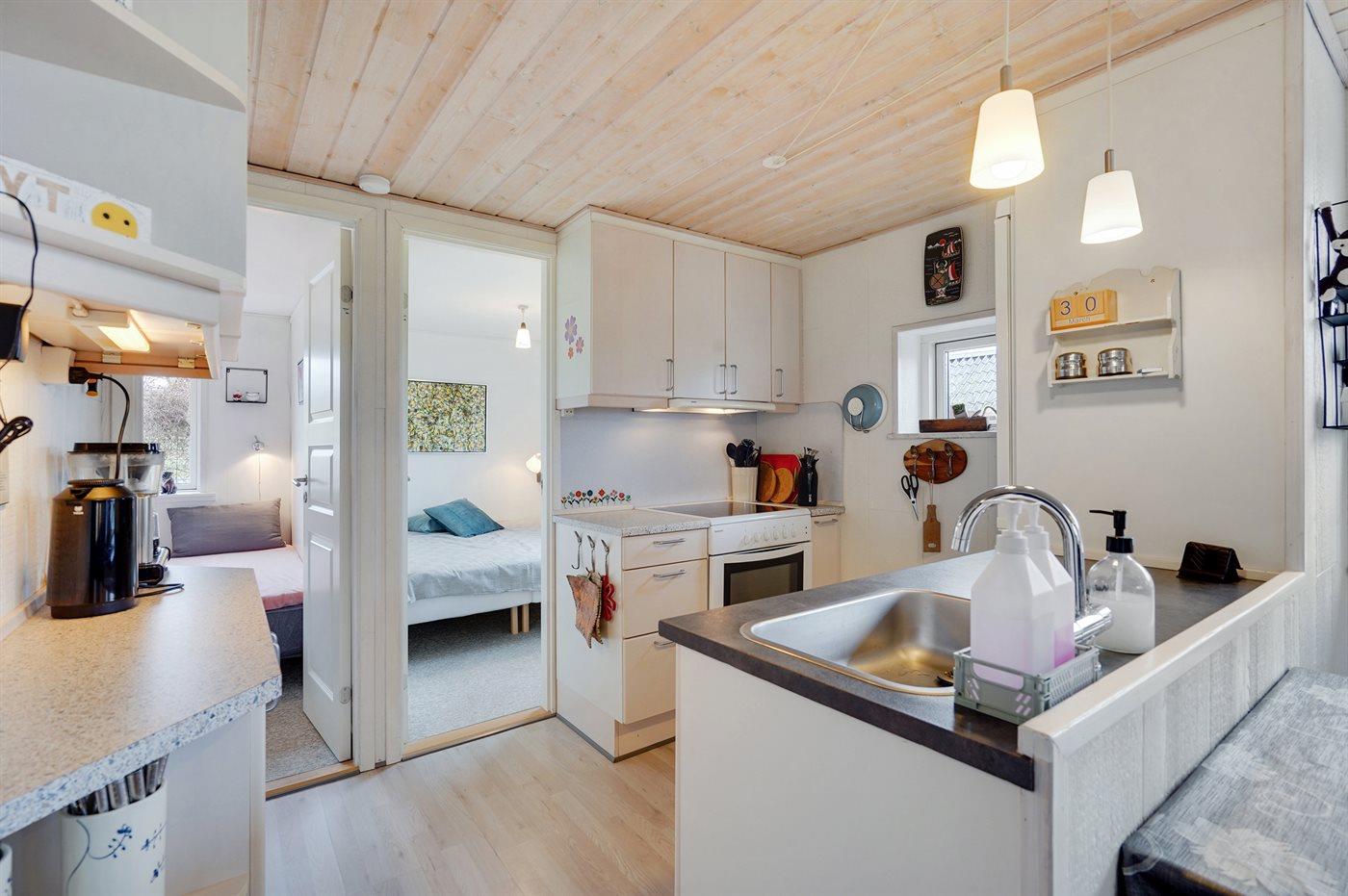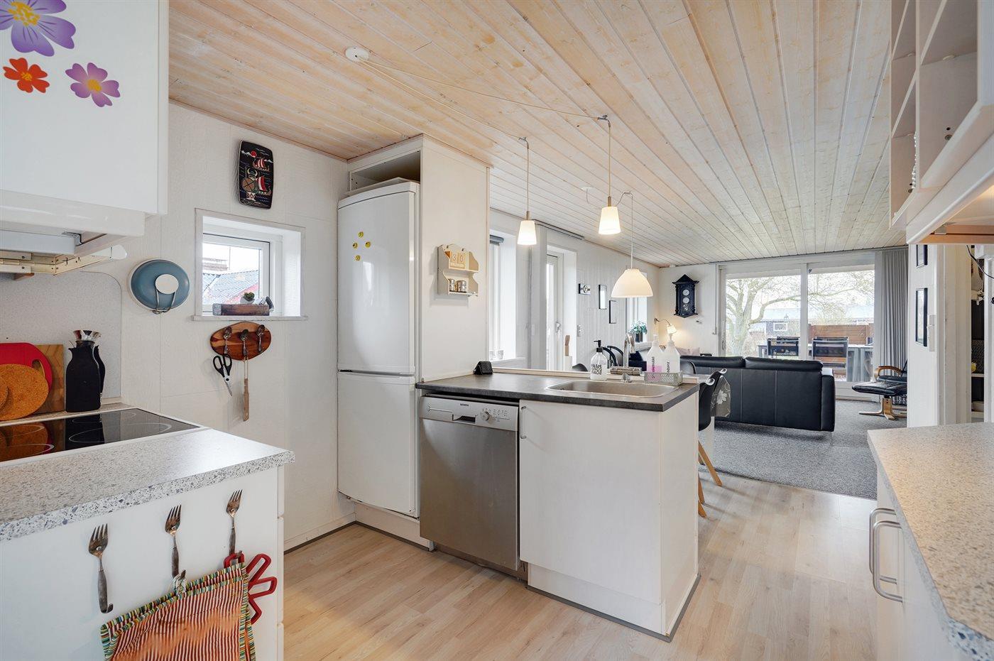 Køkkenet er udstyret med 1 køleskab. Der er 4 keramiske kogeplader, bageovn, mikrobølgeovn samt opvaskemaskine.
