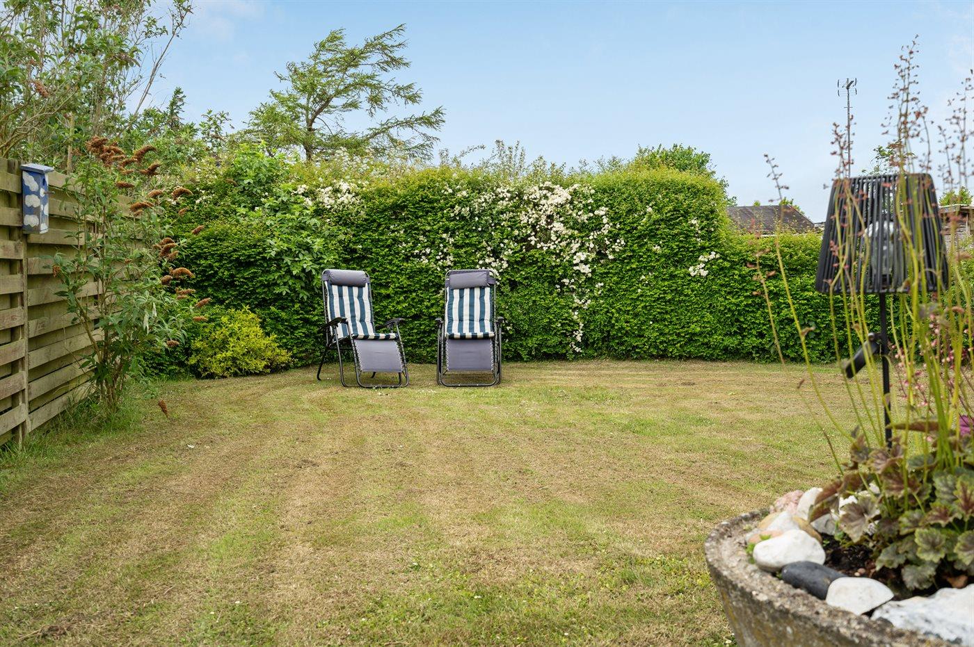 Hyggeligt sommerhus i familievenligt område tæt på børnevenlig strand og med stor have.