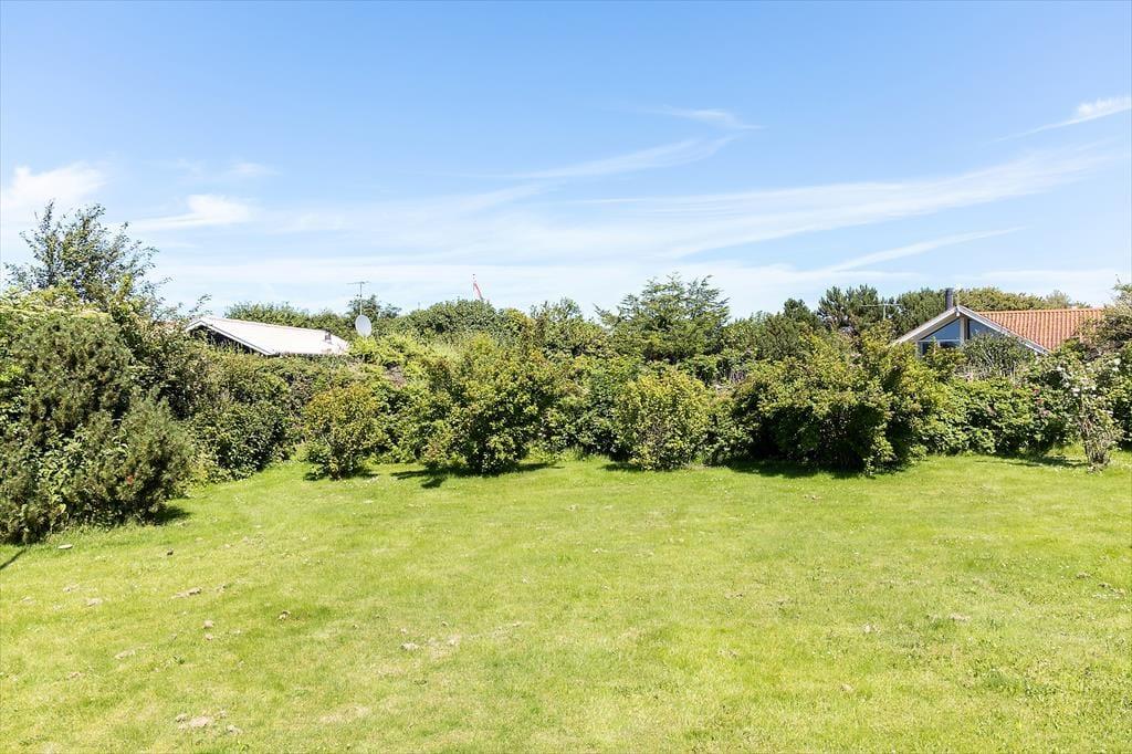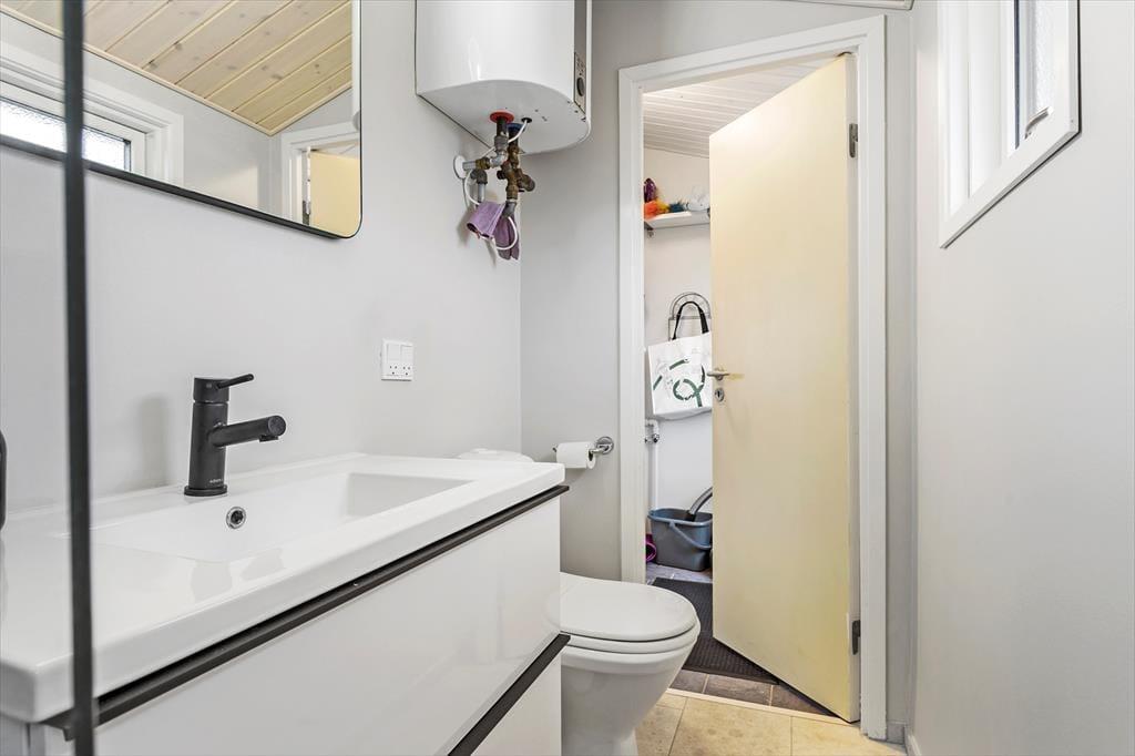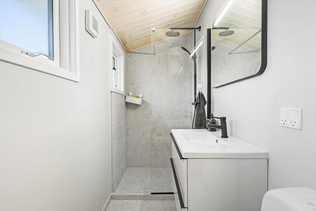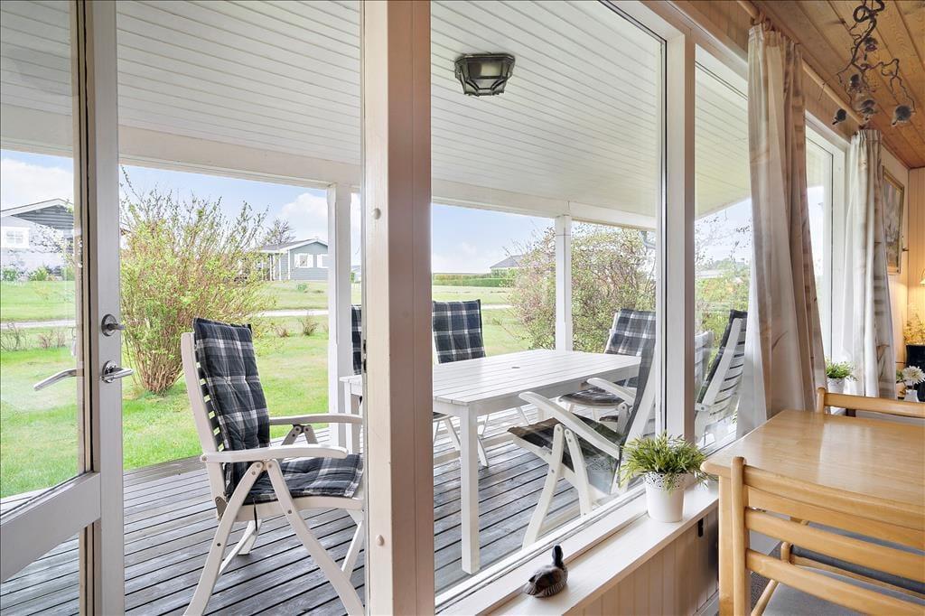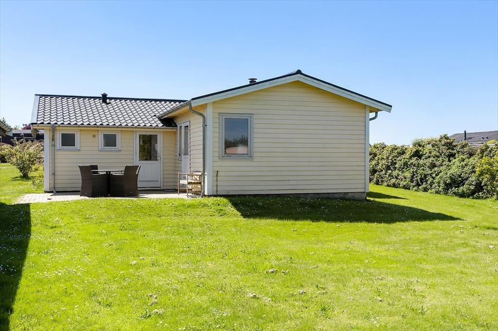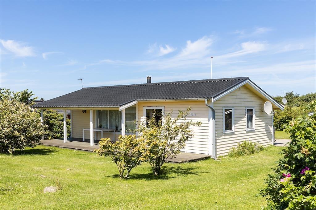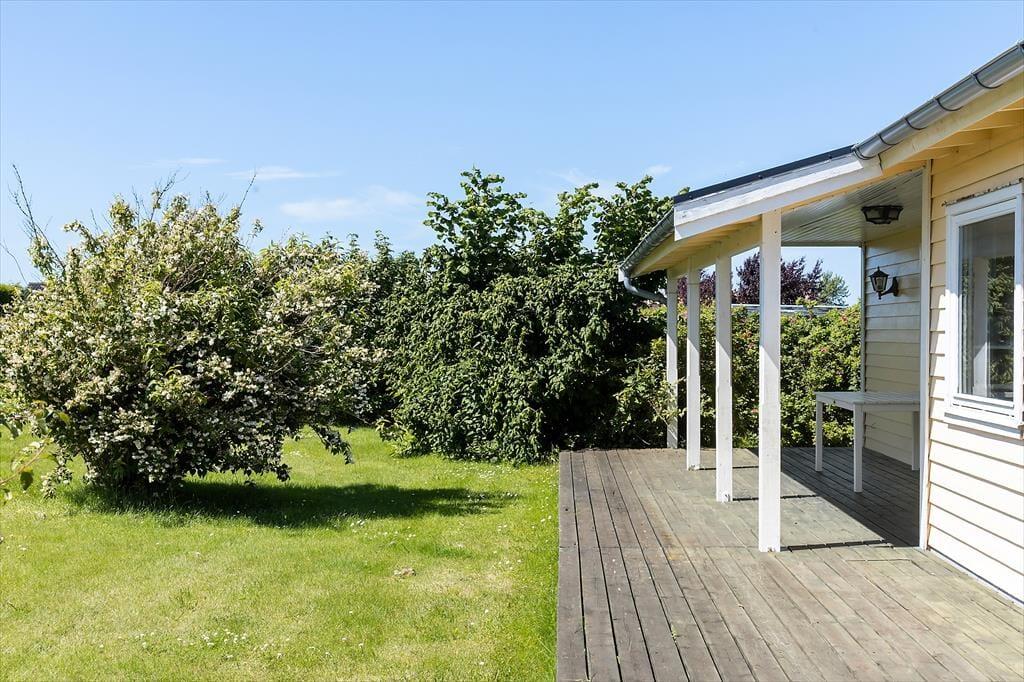 Sommerhuset byder på flere skønne terrasser, der indbyder til udendørs hygge. På den ene side af huset finder du en overdækket træterrasse, der er perfekt til lange sommeraftener, selv når duggen begynder at falde. Her kan du sidde i læ for vinden og nyde lyden af bølgerne i det fjerne. På den modsatte side af huset er der en fliseterrasse, hvor du kan dække op til frokost under åben himmel. Græsplænen, der omgiver huset, giver masser af plads til leg og boldspil, mens duftene fra grillen langsomt spreder sig i den lune sommeraften.