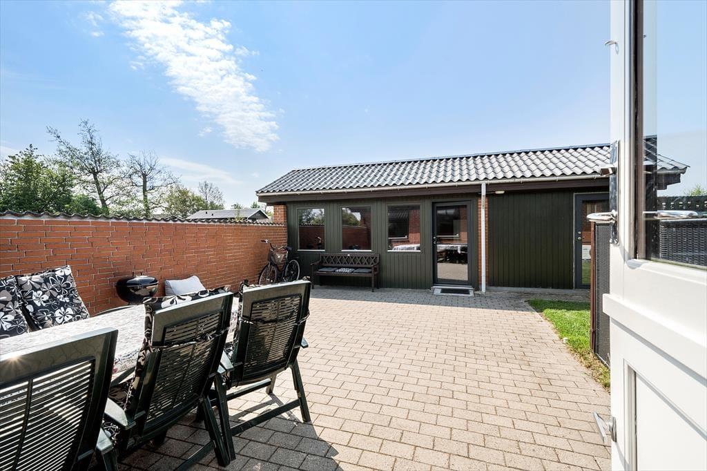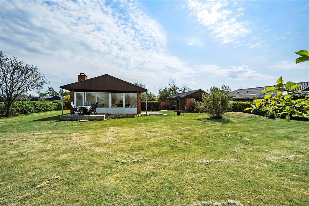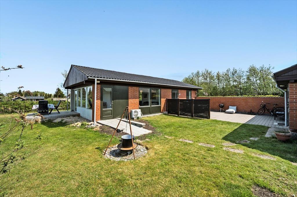 Udendørs venter en stor terrasse med læmur, der sikrer, at du kan sidde i læ og nyde måltiderne ved grillen, uanset hvordan vejret arter sig. Terrassen er et oplagt samlingspunkt for familie og venner, hvor I kan nyde solen, spise sammen og lade feriestemningen indfinde sig. Den rummelige græsplæne inviterer til leg og spil, mens bålstedet giver mulighed for hyggelige aftener med snobrød og historier under stjernerne. Derudover er der en mindre terrasse, hvor du kan nyde morgensolen med en kop kaffe i hånden. Og for dem, der søger lidt ekstra underholdning, er der adgang til en garage med pool bord, hvor både store og små kan få mange timer til at gå.