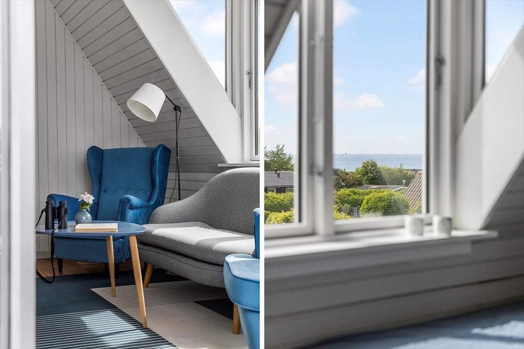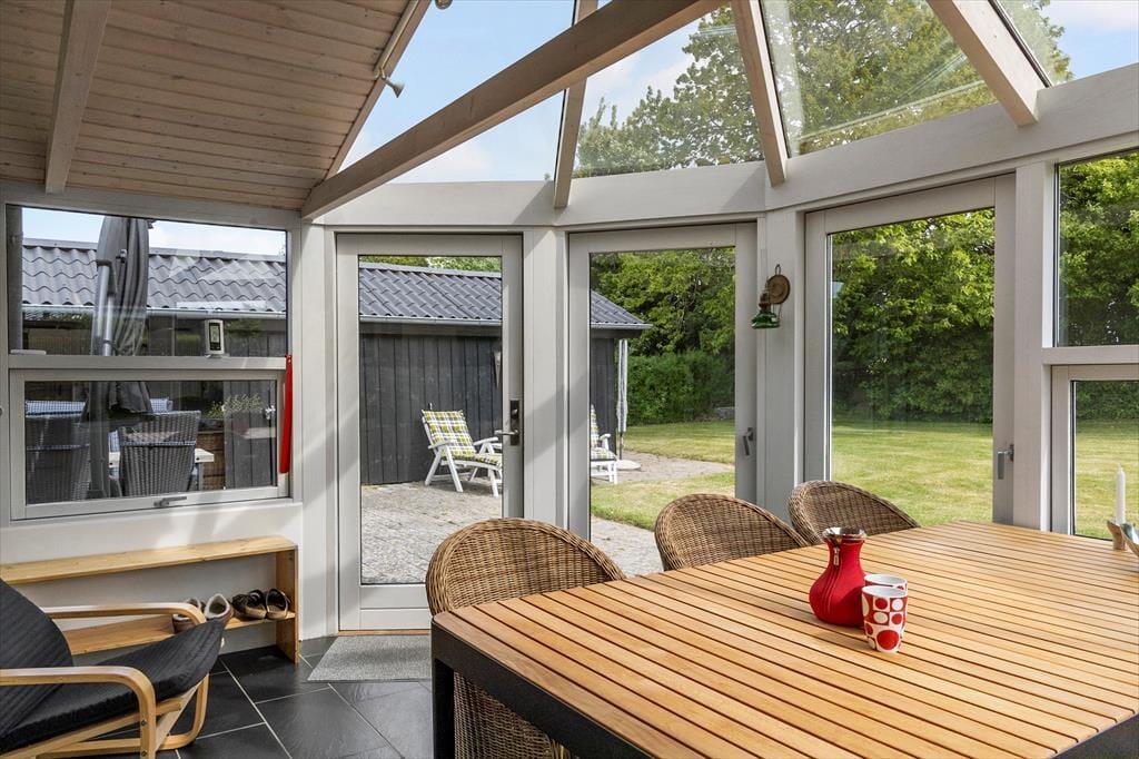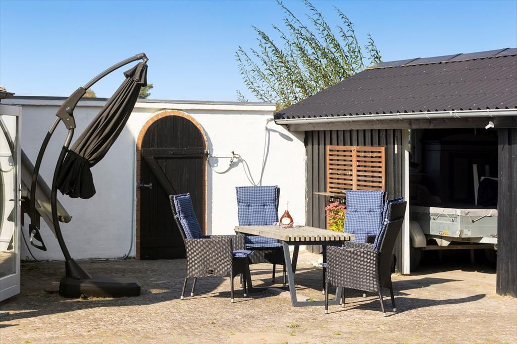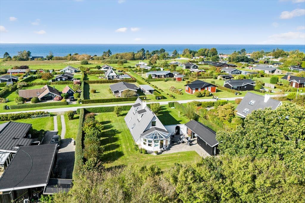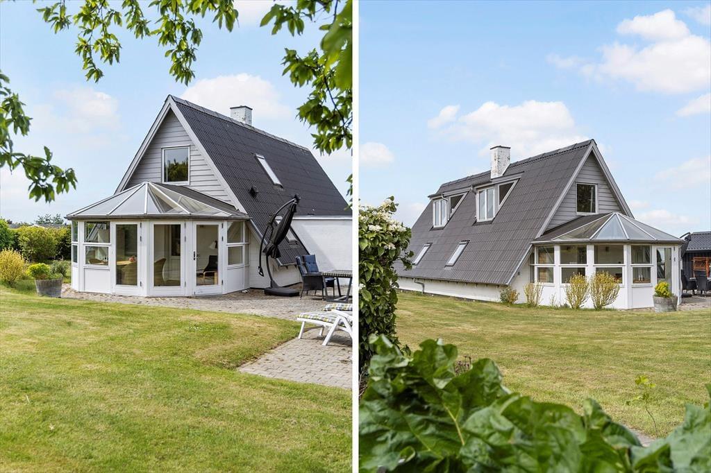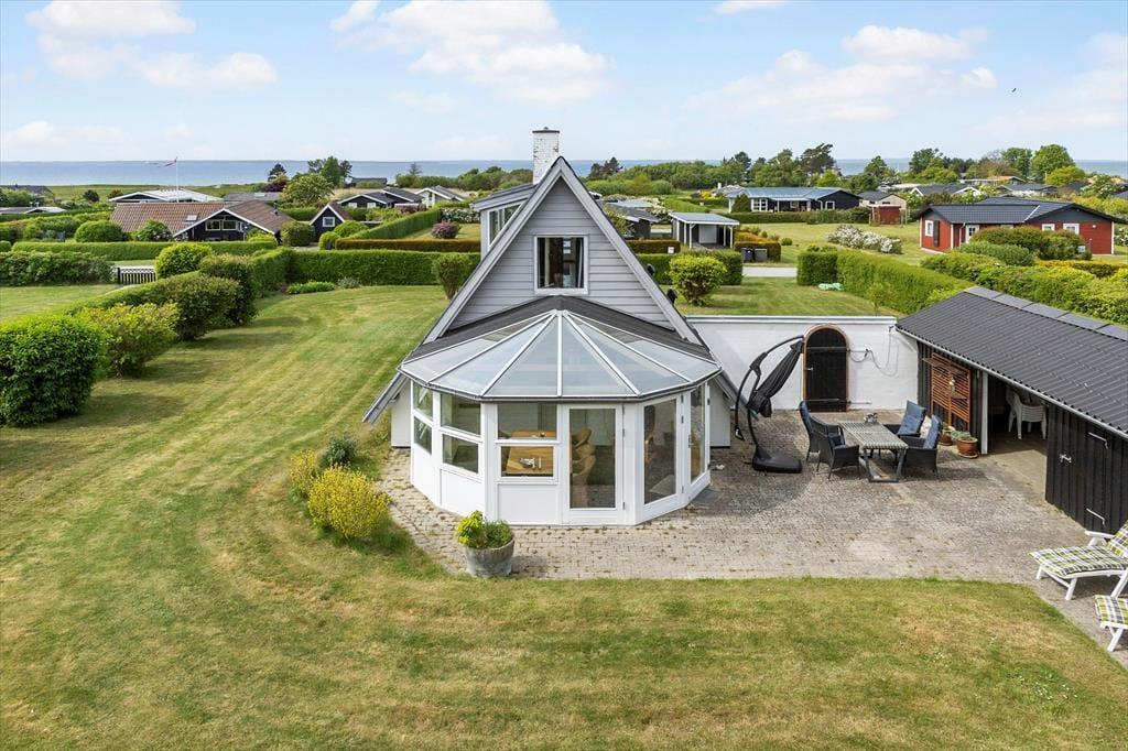 Haven og terrasserne omkring sommerhuset er skabt til udeliv. Den delvist overdækkede terrasse giver dig mulighed for at nyde udendørs måltider og hyggelige grillaftener med familie og venner, mens du kigger ud på den velplejede græsplæne. Her er der masser af plads til børnenes leg eller blot til at ligge og dase i solen. Udestuen med glastag gør det muligt at nyde de lyse sommeraftener, selv når duggen begynder at falde. Og på 1. sal kan du tage plads på den overdækkede altan og nyde udsigten over det smukke hav, der ligger blot en kort gåtur fra huset. Dette er stedet, hvor feriedrømme bliver til virkelighed.