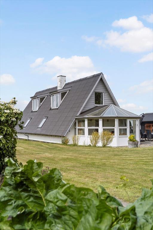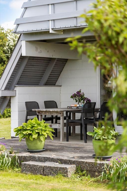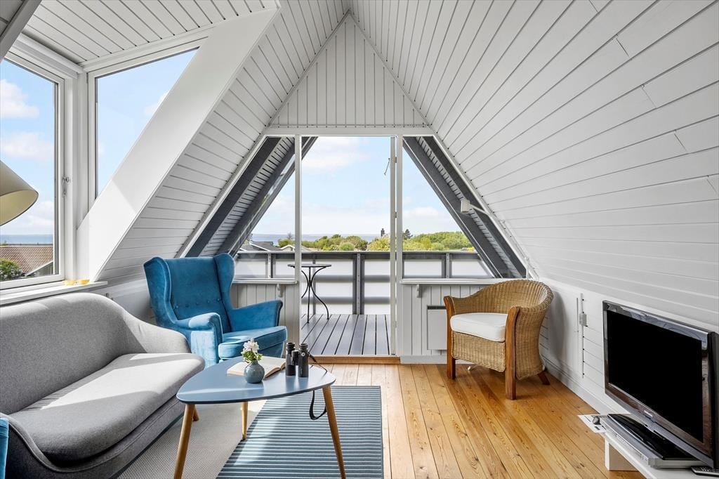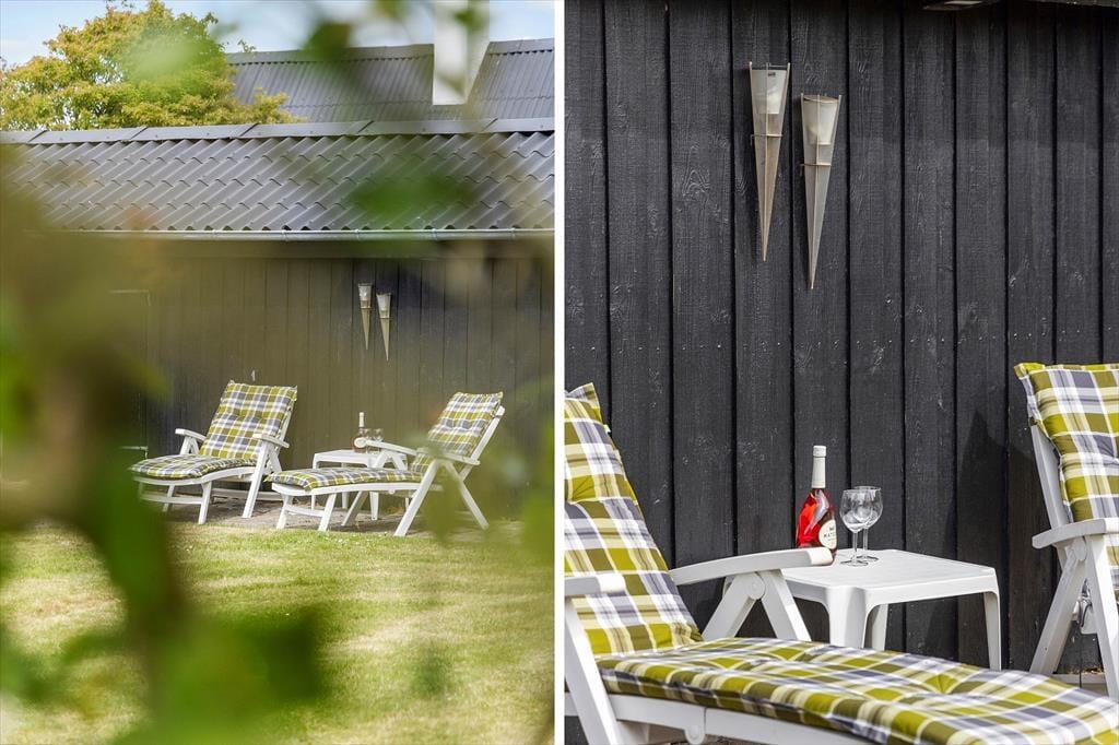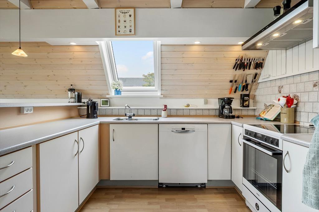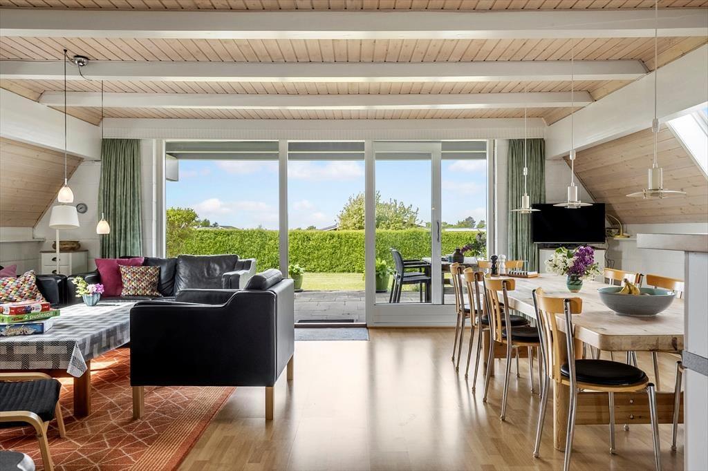 Haven og terrasserne omkring sommerhuset er skabt til udeliv. Den delvist overdækkede terrasse giver dig mulighed for at nyde udendørs måltider og hyggelige grillaftener med familie og venner, mens du kigger ud på den velplejede græsplæne. Her er der masser af plads til børnenes leg eller blot til at ligge og dase i solen. Udestuen med glastag gør det muligt at nyde de lyse sommeraftener, selv når duggen begynder at falde. Og på 1. sal kan du tage plads på den overdækkede altan og nyde udsigten over det smukke hav, der ligger blot en kort gåtur fra huset. Dette er stedet, hvor feriedrømme bliver til virkelighed.
