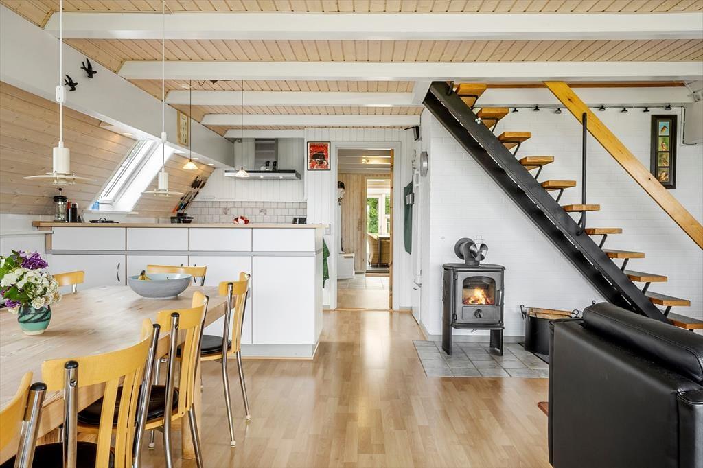 Når du træder ind i dette velindrettede sommerhus på Solbakken 9, møder du straks en hyggelig atmosfære, der indbyder til afslapning og fællesstunder. Huset er indrettet i to plan, hvor stueetagen byder på et rummeligt køkken-alrum med en charmerende brændeovn og synlige bjælker, der giver rummet en nostalgisk følelse. Her kan du samles med familien om spisebordet til hyggelige måltider, mens I nyder udsigten til den grønne have. Fra køkkenet fører en trappe op til 1. sal, hvor du finder den overdækkede altan med havudsigt – et perfekt sted at starte dagen med en kop kaffe og udsigten til vandet. Som en ekstra bonus er der en femkantet, isoleret udestue i forlængelse af huset, hvor du kan nyde en kop te eller en god bog uanset vejret.