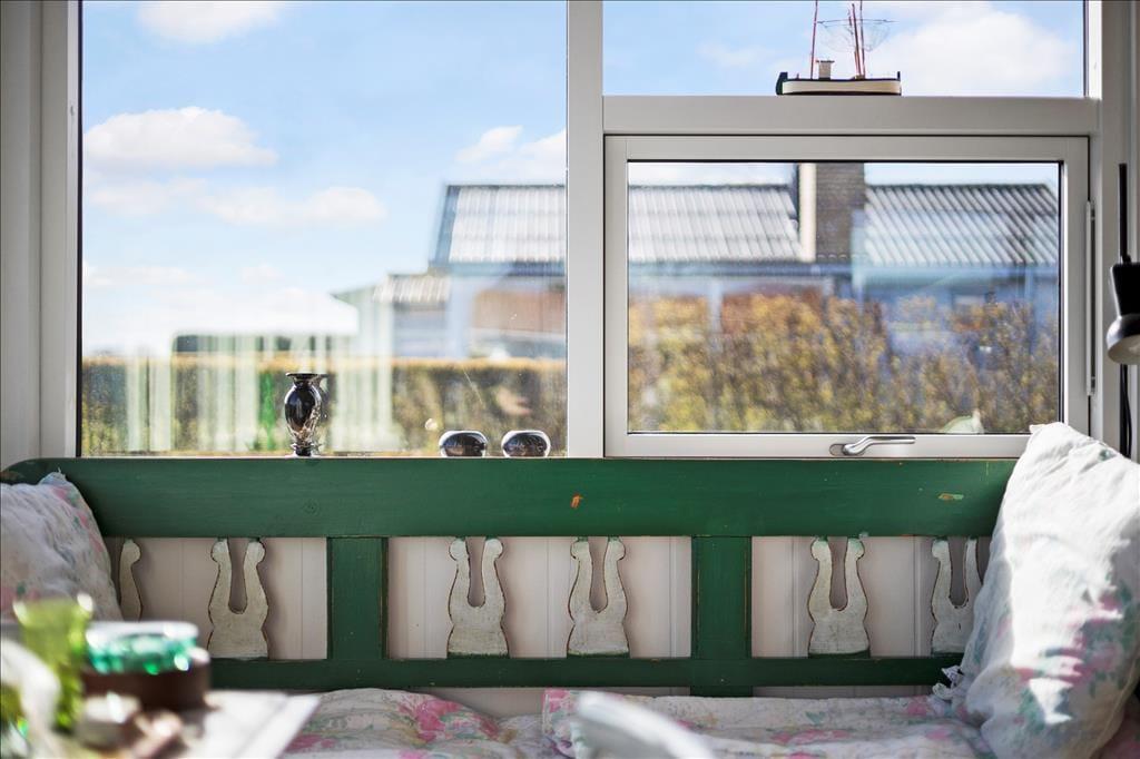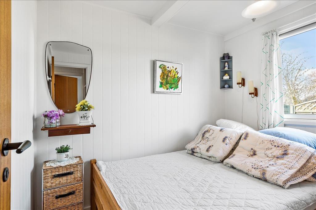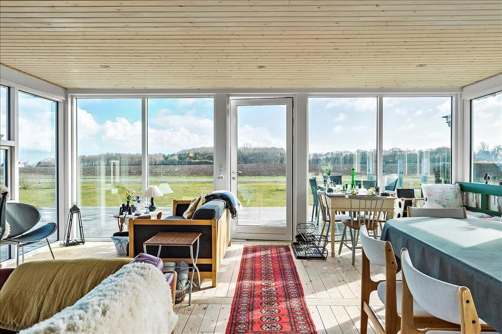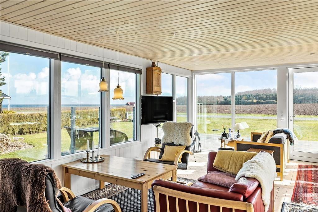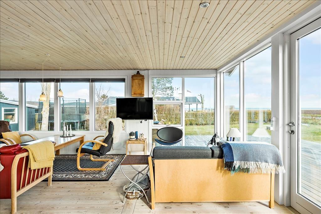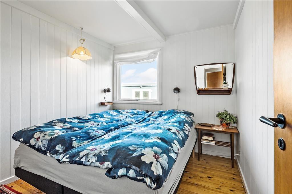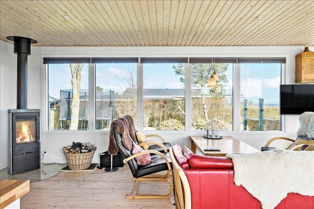 Sommerhusets indre emmer af hygge og charme. Det åbne køkken-alrum er hjertet i huset, hvor brændeovnen i stuen spreder varme og en stemningsfuld atmosfære. Store vinduesvægge på tre sider af rummet giver et smukt lysindfald og sørger for, at du altid kan nyde udsigten til havet, mens du tilbereder dagens måltider eller hygger dig med en kop kaffe ved spisebordet. Stuen er indrettet med komfortable møbler og en indbydende udsigt til både havet og de omkringliggende marker, hvilket gør det til det perfekte sted at slappe af med en god bog eller en hyggelig filmaften. Badeværelset er både praktisk og stilfuldt med en dejlig bruseniche og en vaskemaskine, så selv de praktiske gøremål kan klares nemt og bekvemt.