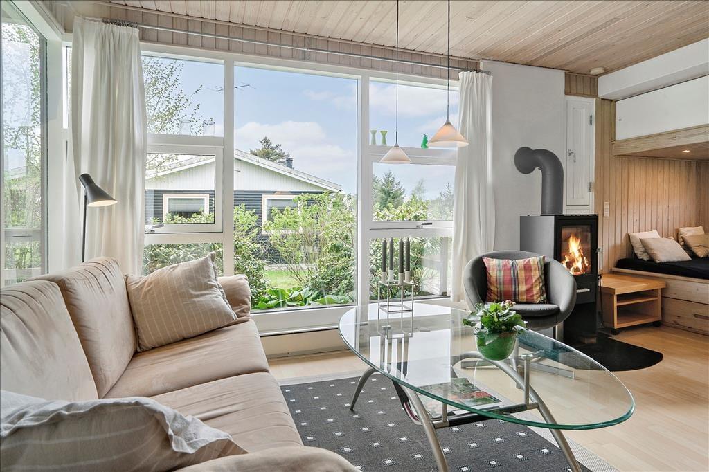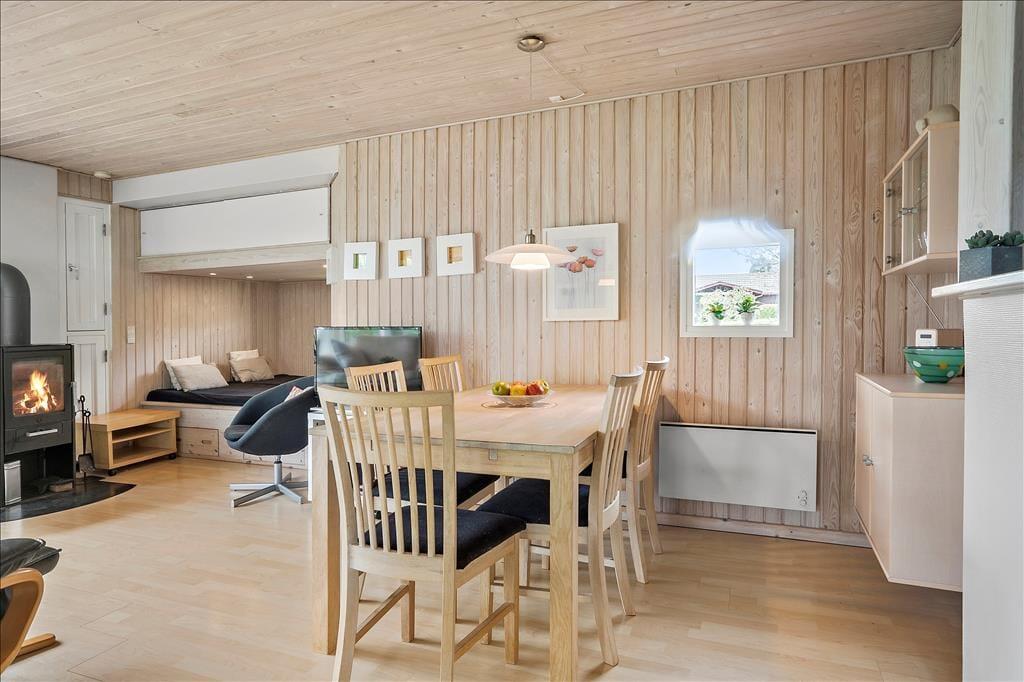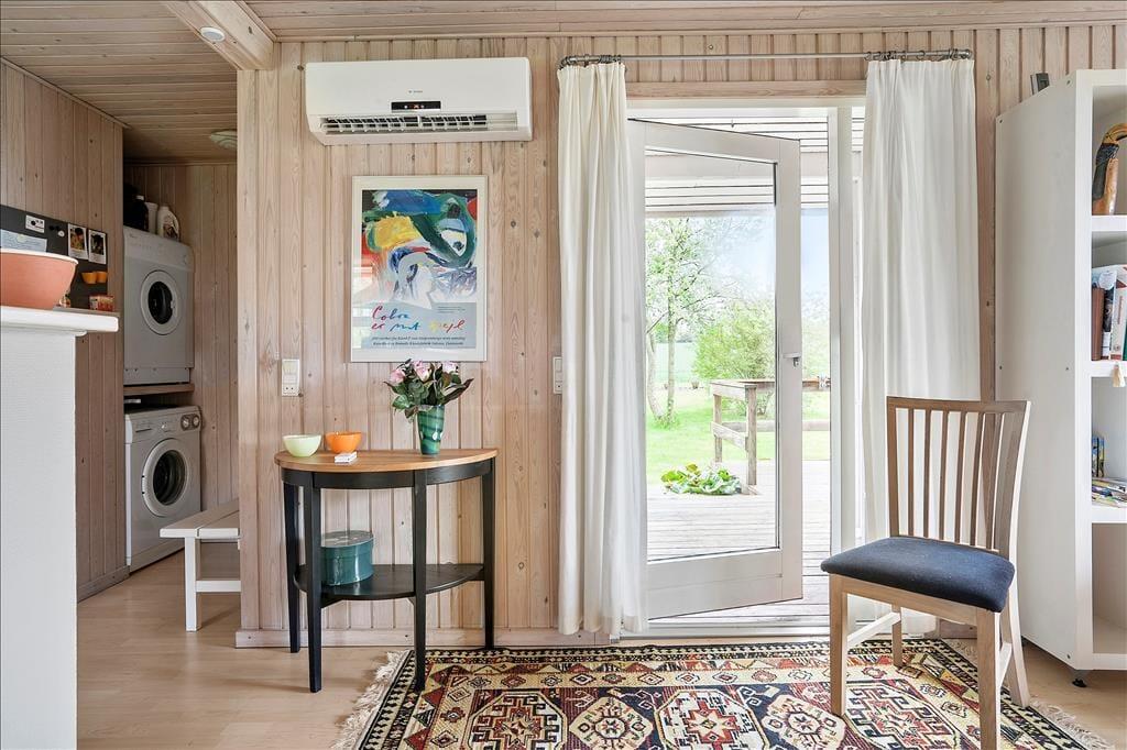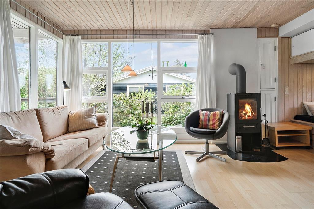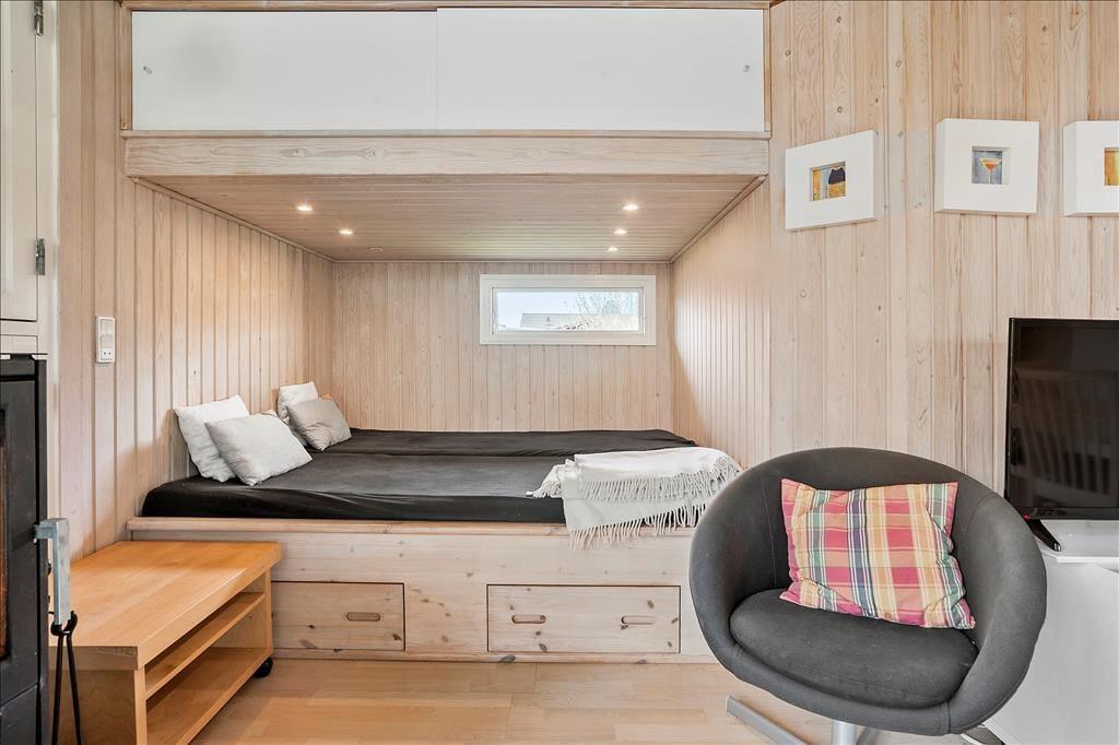 Når du træder ind i sommerhuset, bliver du mødt af en lys og hyggelig atmosfære. Stuen er indrettet med komfortable møbler, og den indbyggede alkove giver et ekstra pift af hygge – perfekt til en eftermiddagslur eller som en ekstra soveplads til børnene. Brændeovnen i stuen bidrager til en varm og indbydende stemning, og med den moderne varmepumpe kan du nemt justere temperaturen efter behov. Det delvist åbne køkken er praktisk indrettet med opvaskemaskine, så du kan bruge mere tid på afslapning og hygge i stedet for opvask. Overalt i huset er der trægulve, som giver et moderne og ensartet udtryk.