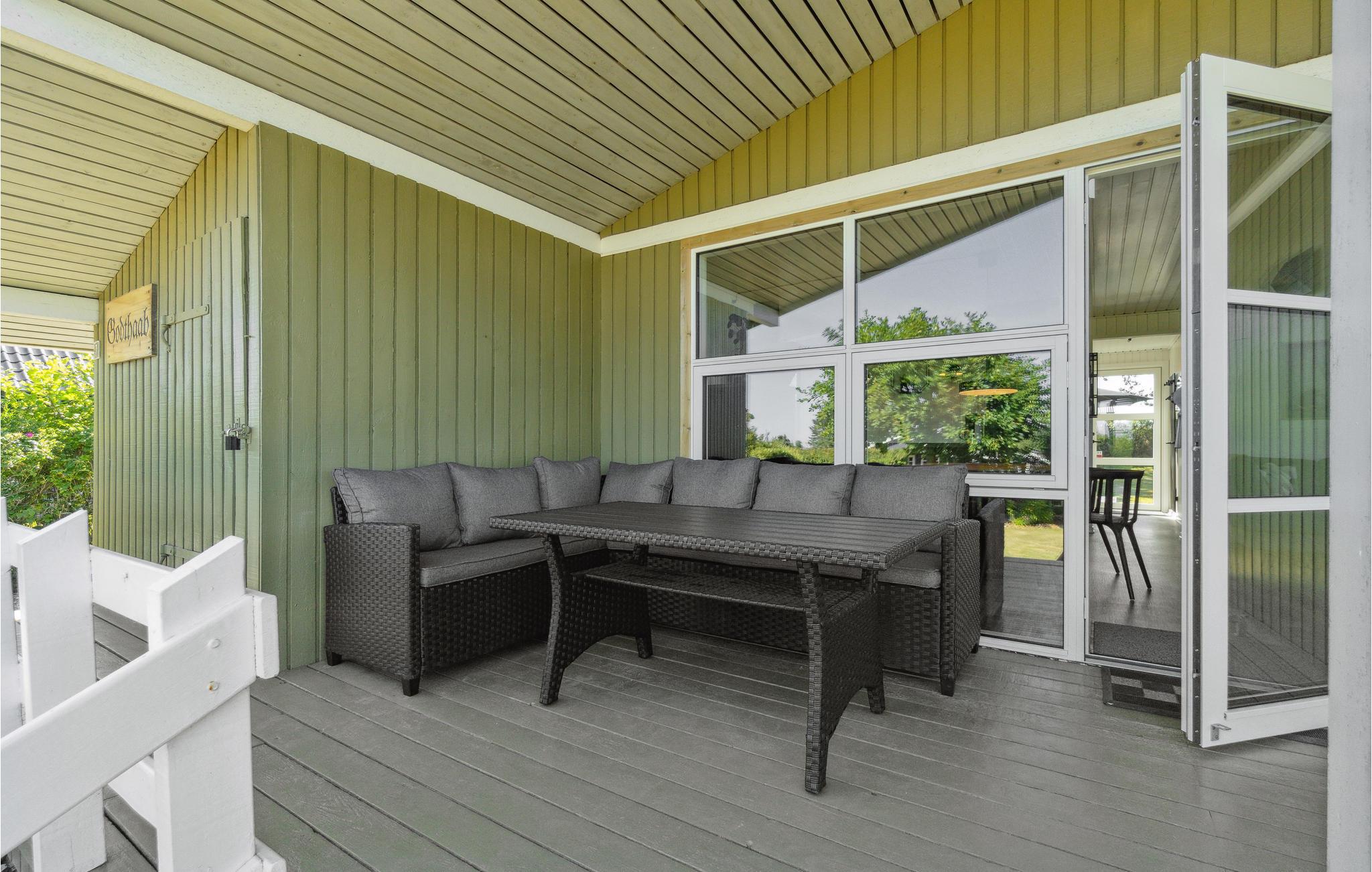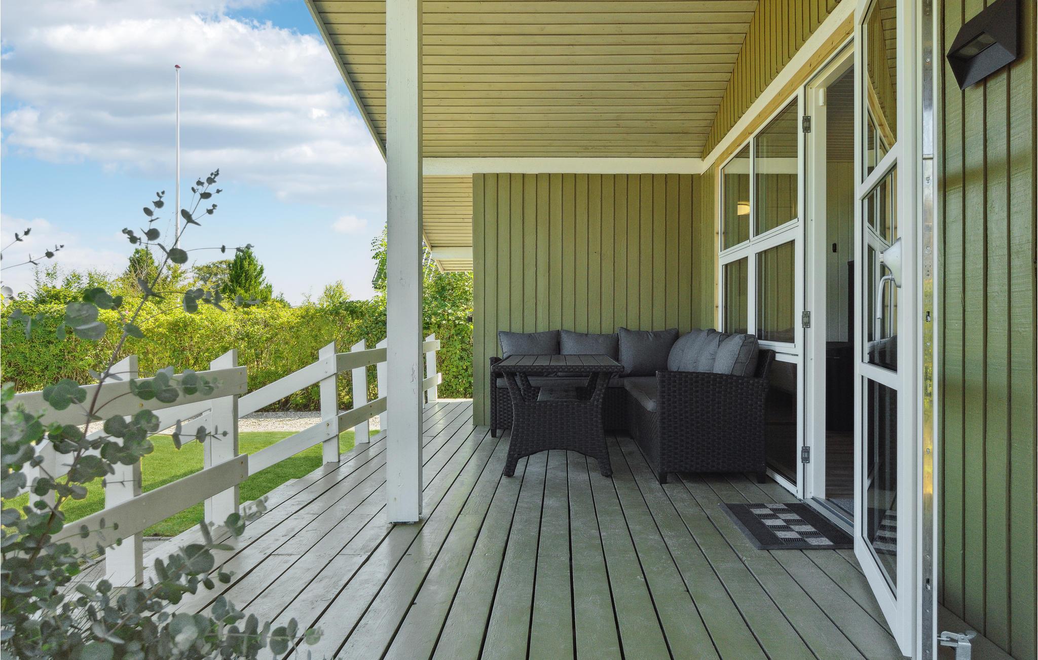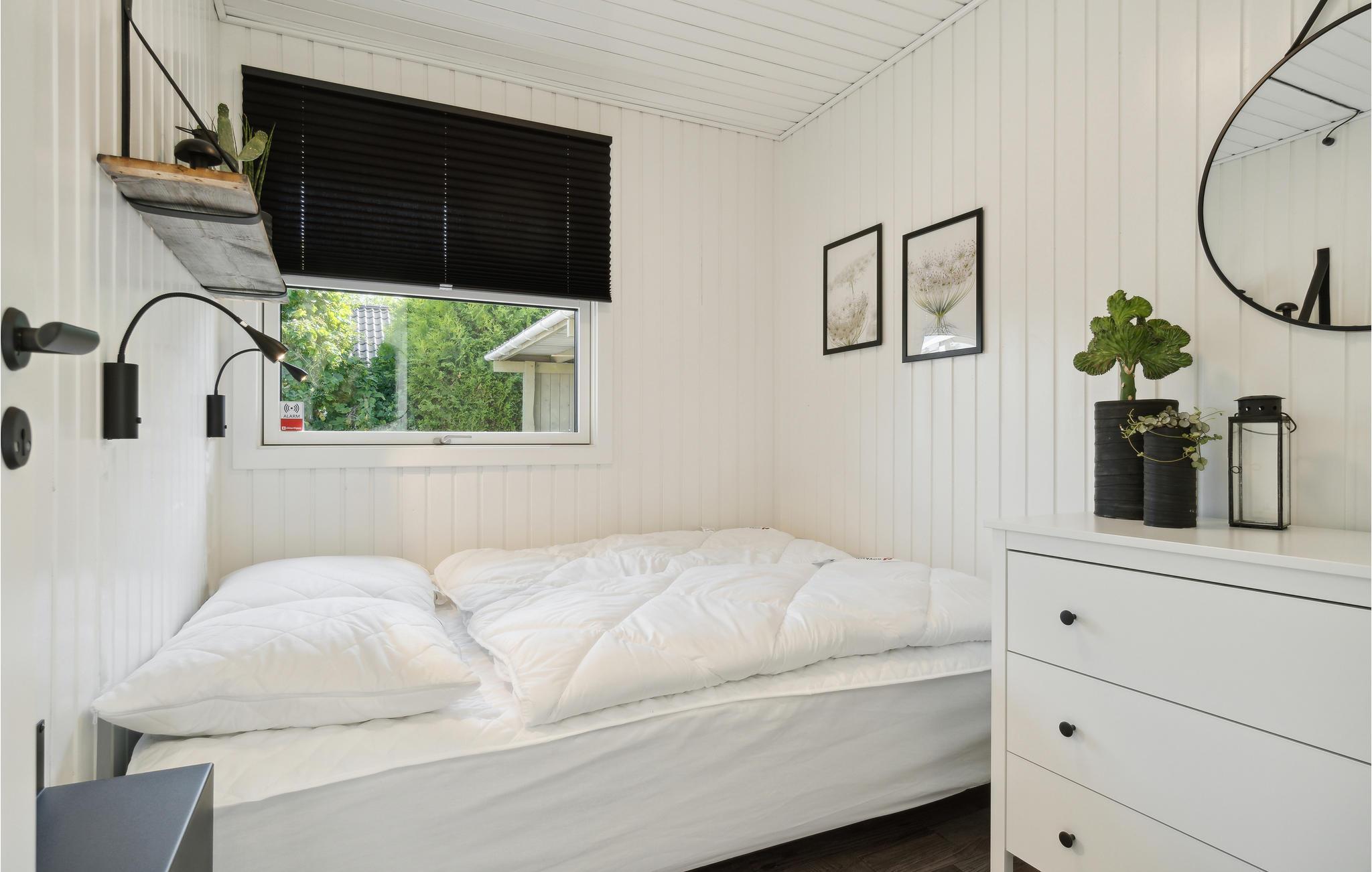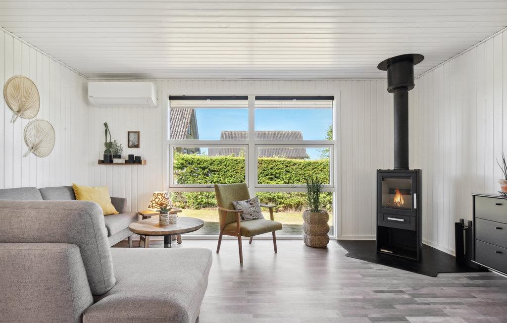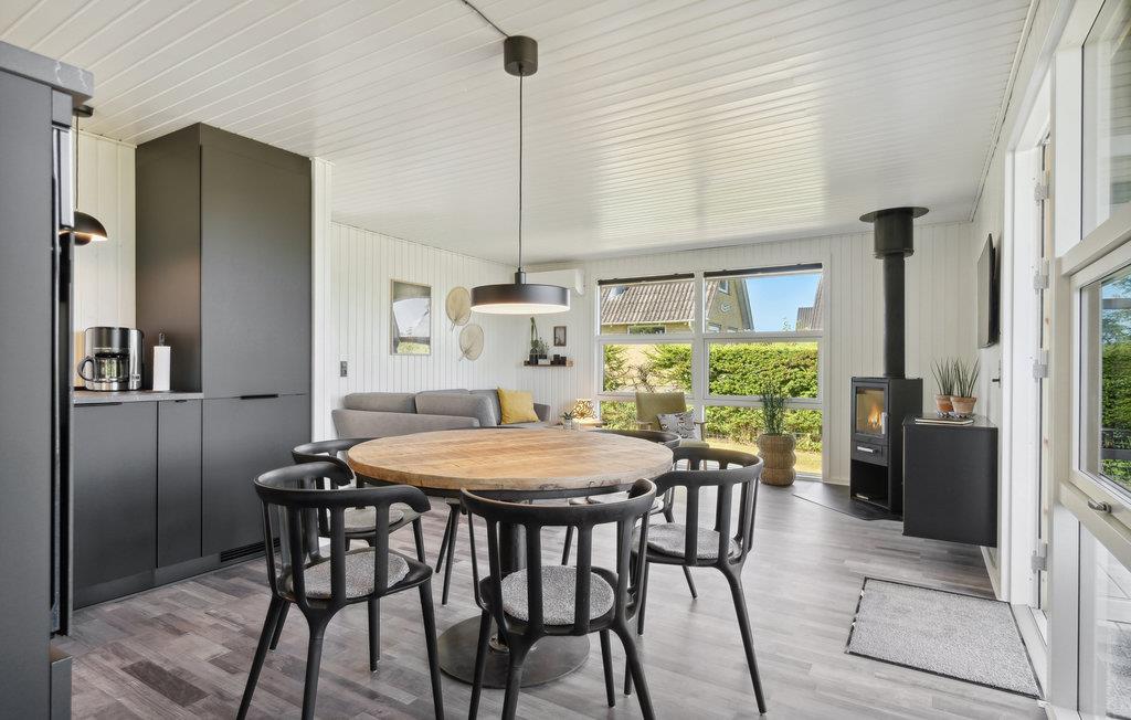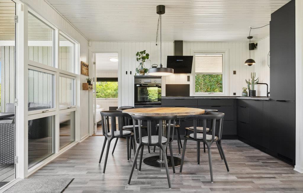 Dette velholdte og smagfuldt indrettede feriehus har et lyst og moderne interiør. Den åbne stue og spisestue er fyldt med naturligt lys og lægger op til at slappe af med den komfortable sofa og brændeovn – ideelt til rolige aftener efter en dag på stranden. Det stilfulde, åbne køkken er problemfrit integreret og tilbyder alt, hvad I behøver for at tilberede måltider sammen. Store vinduer og direkte adgang til terrassen skaber en behagelig forbindelse mellem inde og ude.