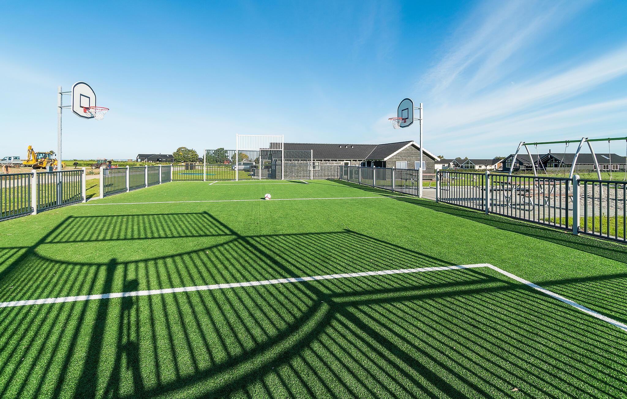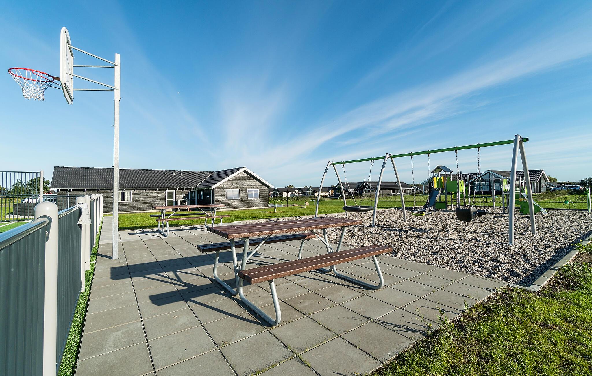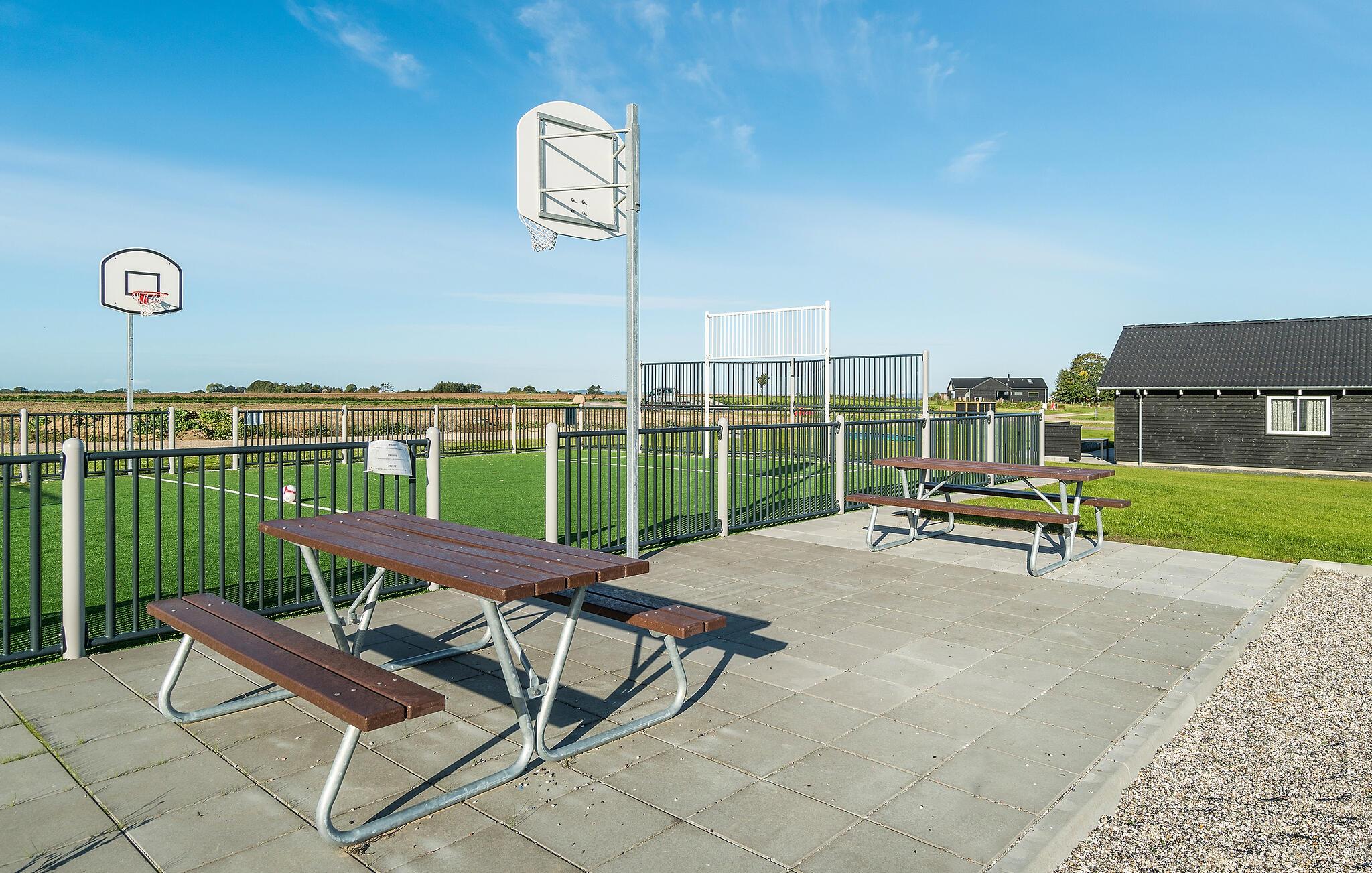 Udearealet byder på en stor sydvestvendt terrasse med masser af siddepladser og grillfaciliteter. For børnene er udeområdet et rent slaraffenland med en stor udendørs legeplads med trampolin, legetårn, fodboldmål og egen basketballbane, så ingen kommer til at kede sig.