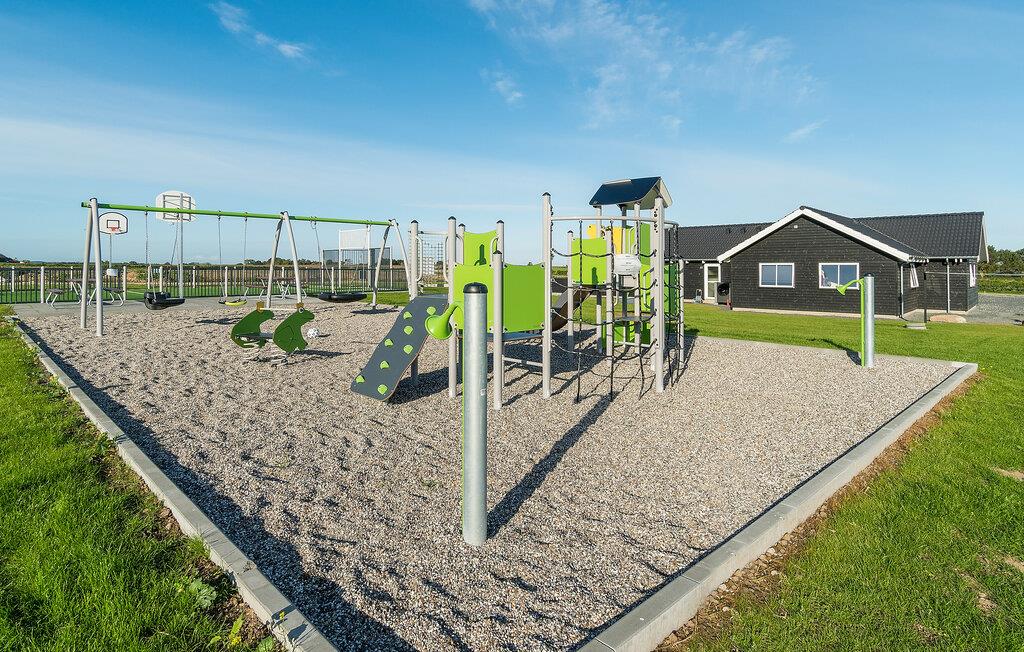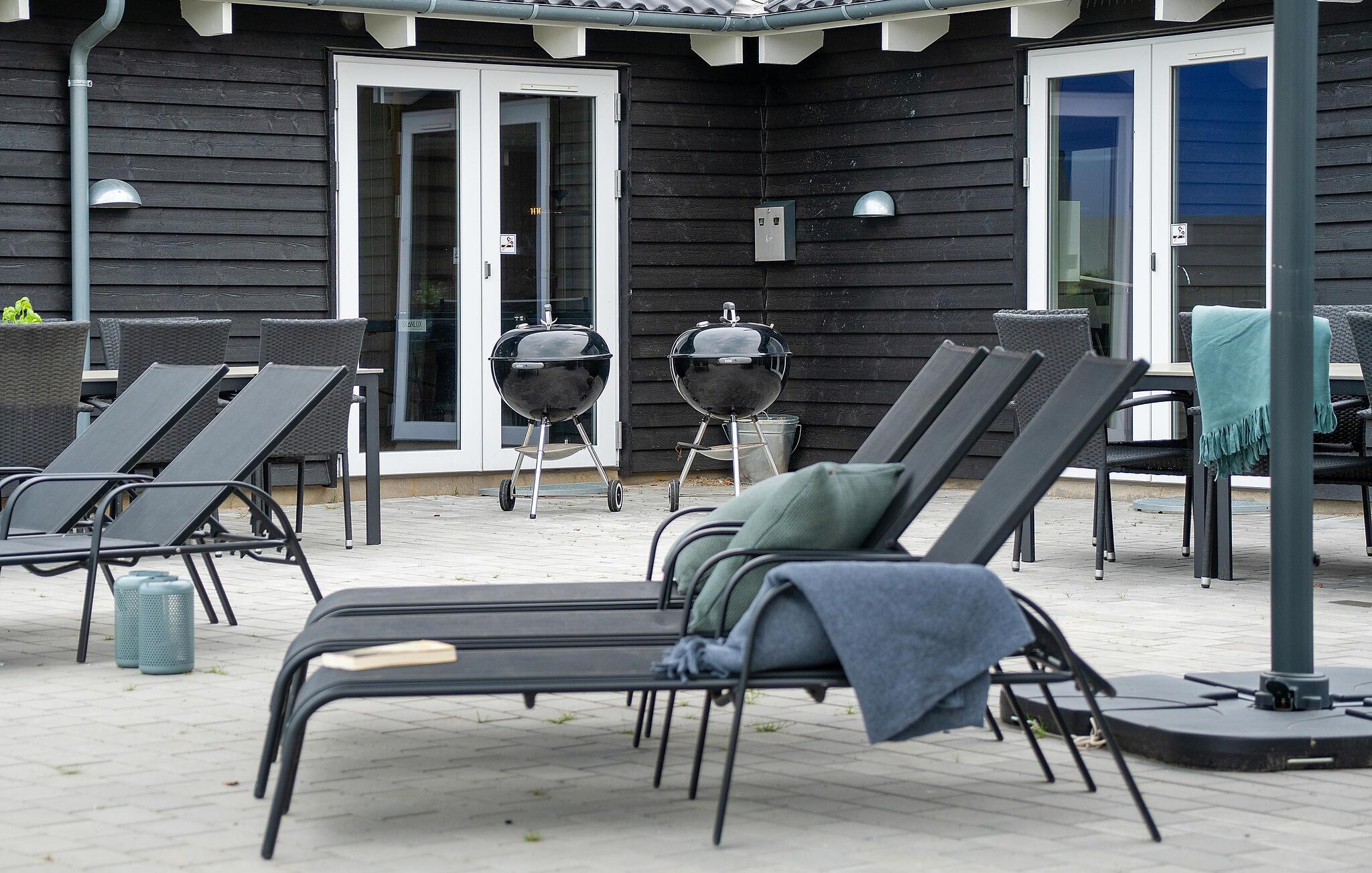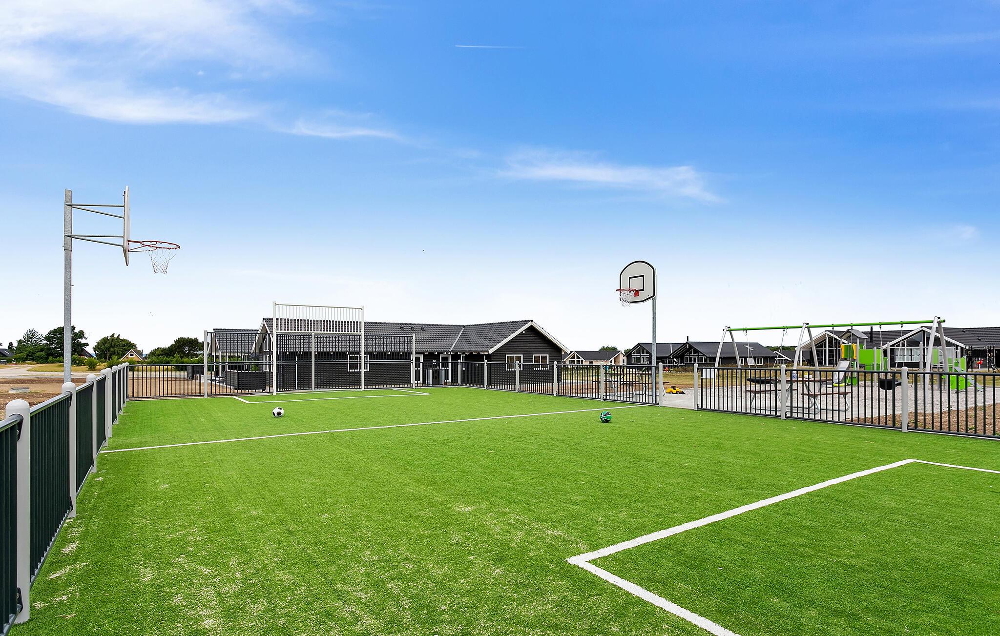 Udearealet byder på en stor sydvestvendt terrasse med masser af siddepladser og grillfaciliteter. For børnene er udeområdet et rent slaraffenland med en stor udendørs legeplads med trampolin, legetårn, fodboldmål og egen basketballbane, så ingen kommer til at kede sig.