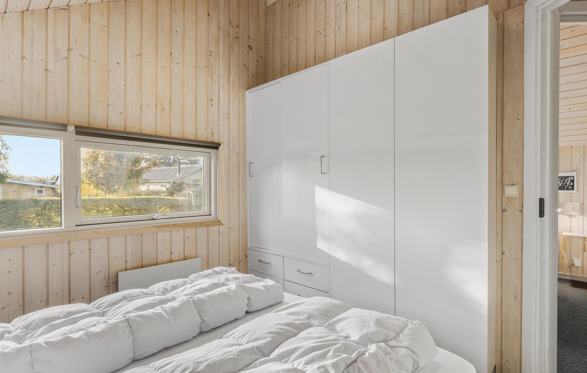 Her findes endvidere tre gode soveværelser - tre med en dobbeltseng (160x200) samt et badeværelse med spabad og adgang til sauna samt et gæstetoilet. Sommerhuset er ikke handicapvenligt, da der er smalle døre og trin i huset, ligesom der er trapper op til terrassen.