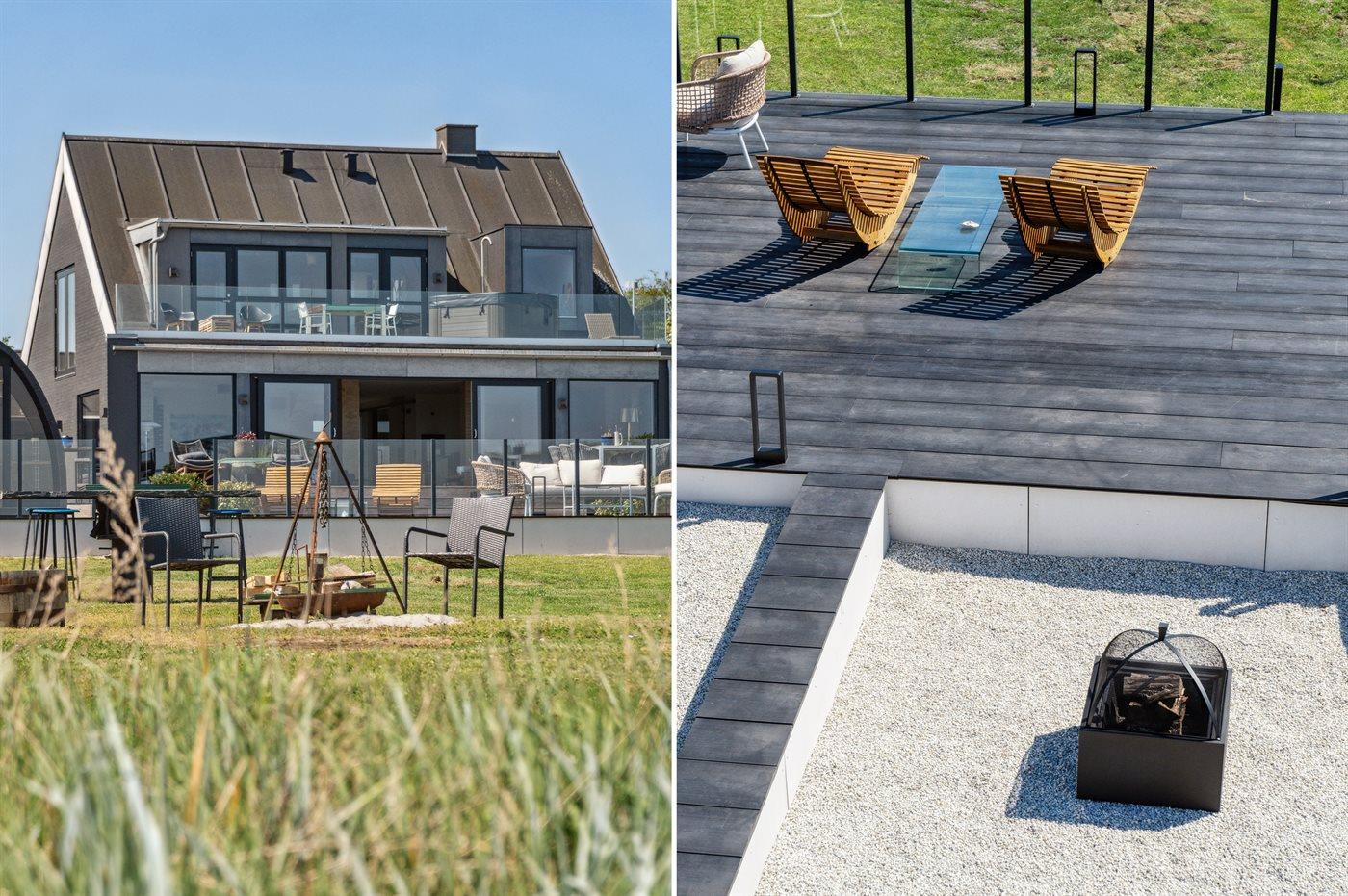 Villaen imponerer også i høj grad, når den betragtes fra stranden, og her findes et gennemført og fantastisk terrassemiljø, som indbyder til et glas god vin eller en drink. I haven findes både en sauna, et koldvandskar samt udebruser, og på villaens terrasse på 1. sal står et stort udendørs spabad med plads til hele familien. Her bliver den enestående udsigt om muligt endnu mere bjergtagende, og det kan være svært at løsrive sig fra udsigten.