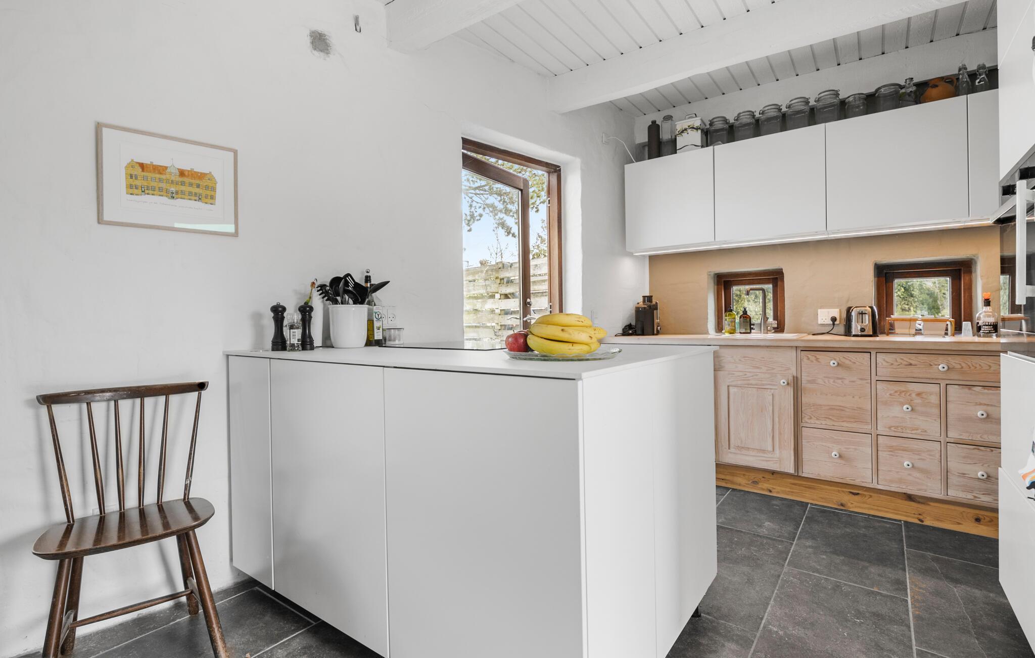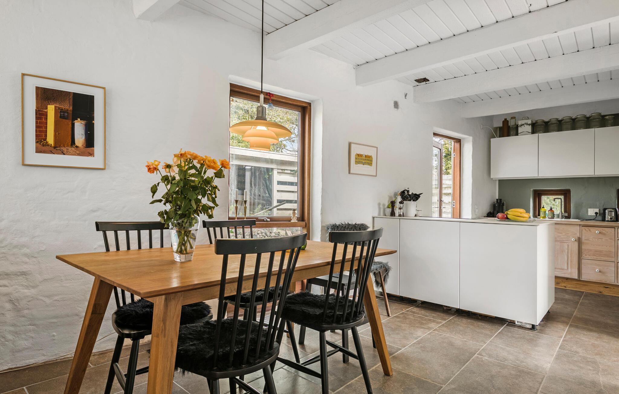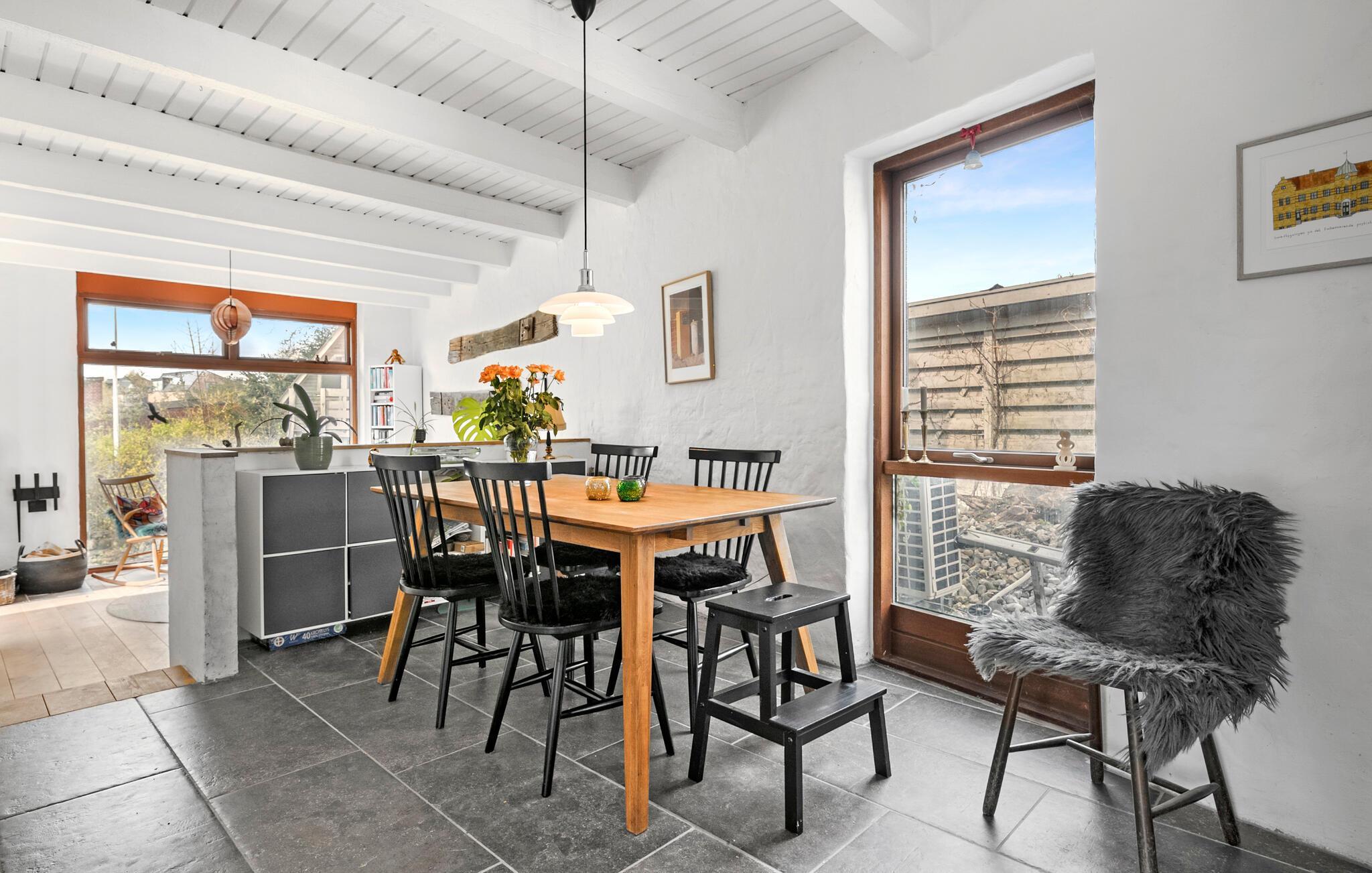 Rejs med familien til Østjylland, hvor I lidt nord for Aarhus og tæt på Kalø Vig finder en hyggelig base i dette fine feriehus. Nyd godt af den charmerende indretning med åben planløsning, synlige træbjælker og en brændeovn, der giver varme og et rart lydtapet på de lidt køligere dage. I stuen er der store vinduespartier, der giver et dejligt lysindfald og udsigt til omgivelserne, som kan nydes i sofaen med en god bog og et glas vin efter en aktiv feriedag.